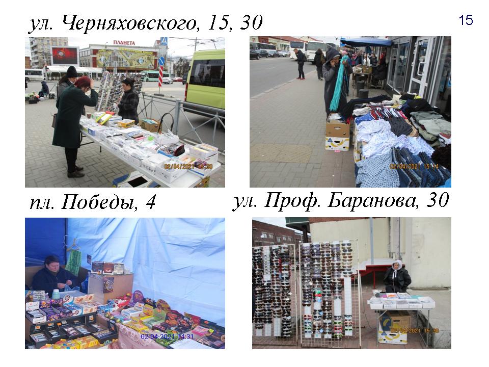 Проведено 12 контрольных мероприятий, в ходе которых осмотрено 20 нестационарных торговых объектов (НТО). Выявлено незаконно размещенных— 4 НТО на территории общего пользования в районе домов № 50-52 по ул. Киевской,