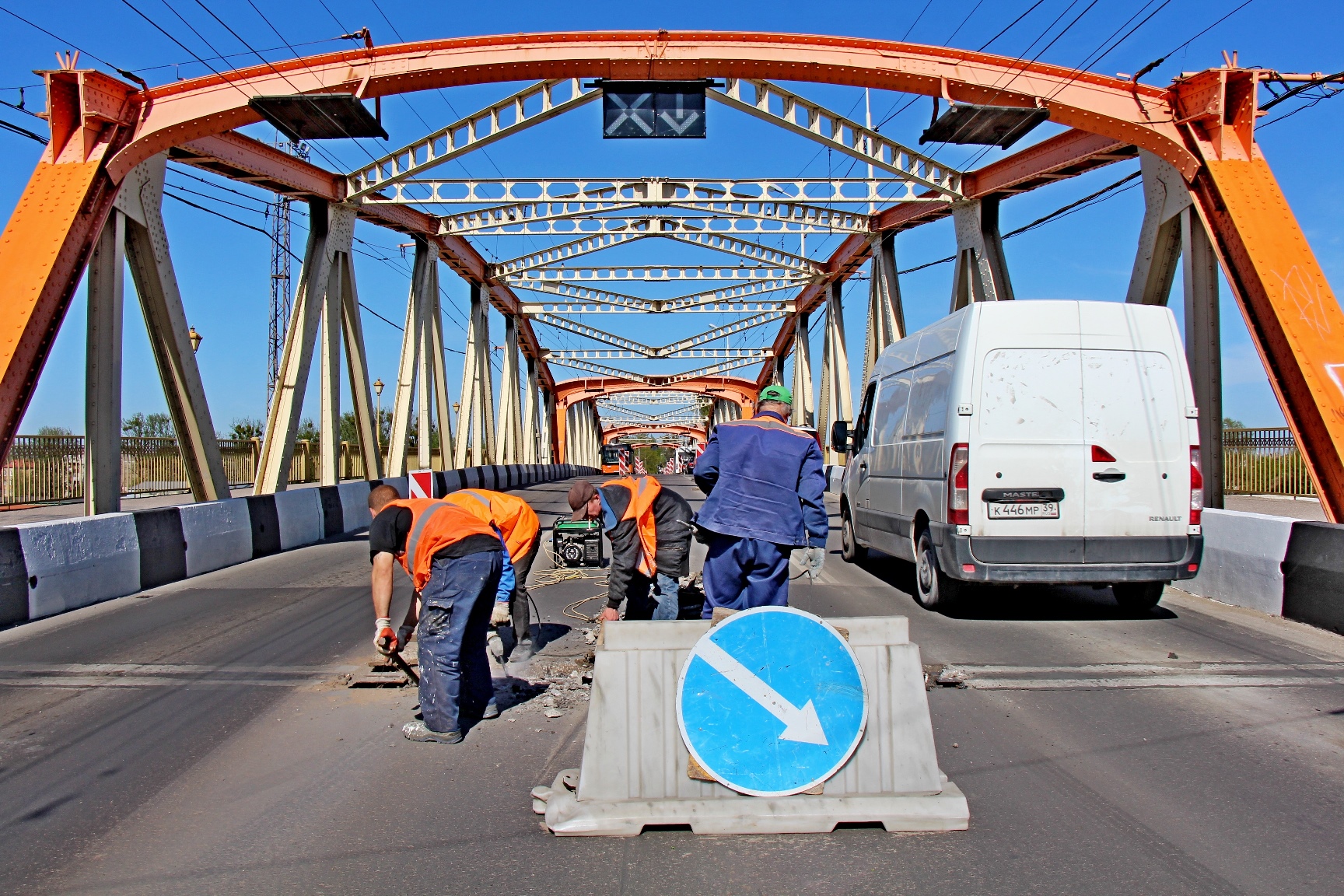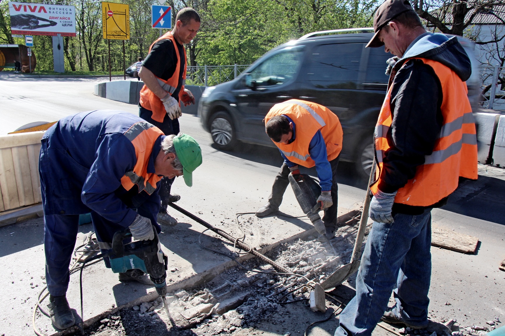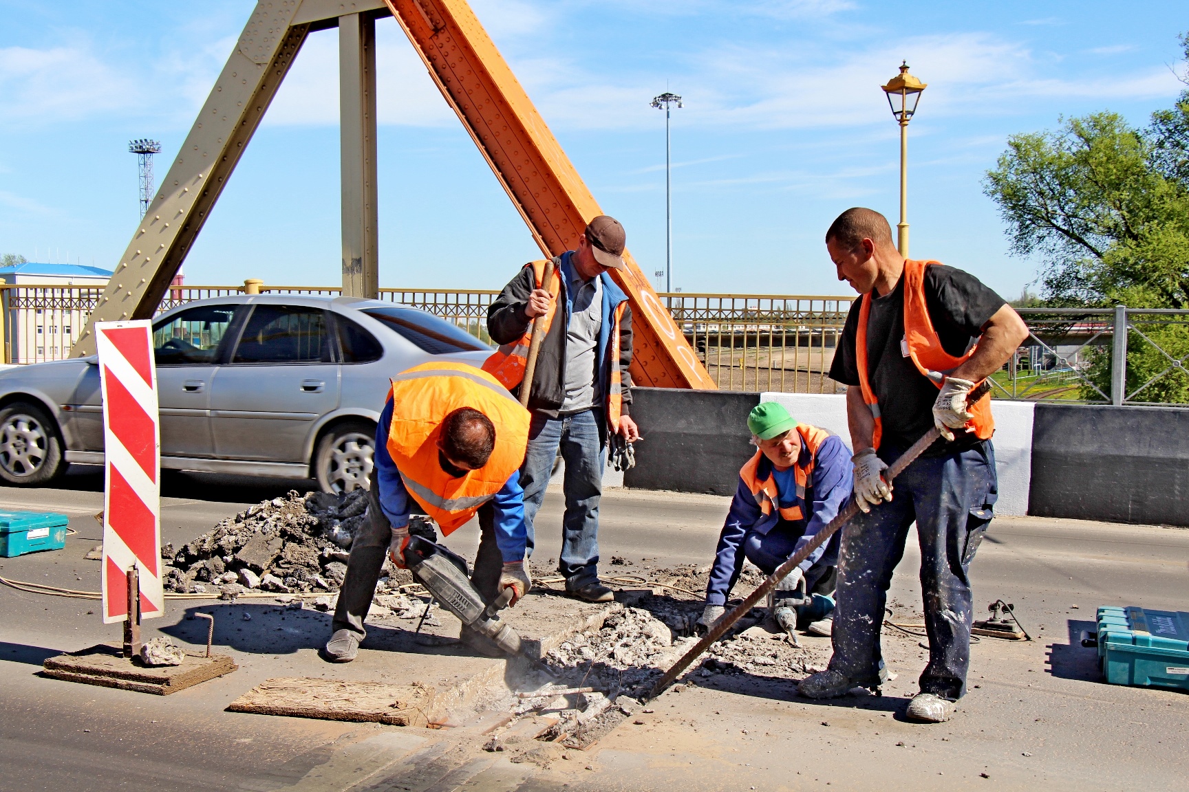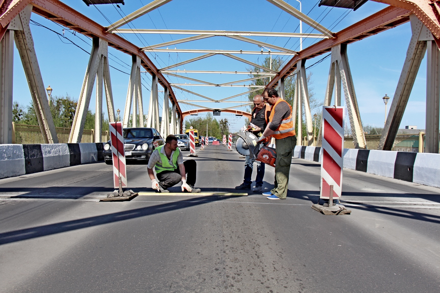 Транспорт идёт по двум крайним полосам, а мостовики приступили к работе на средней. Сейчас идёт вскрытие старых деформационных швов, начиная со стороны Инженерной.