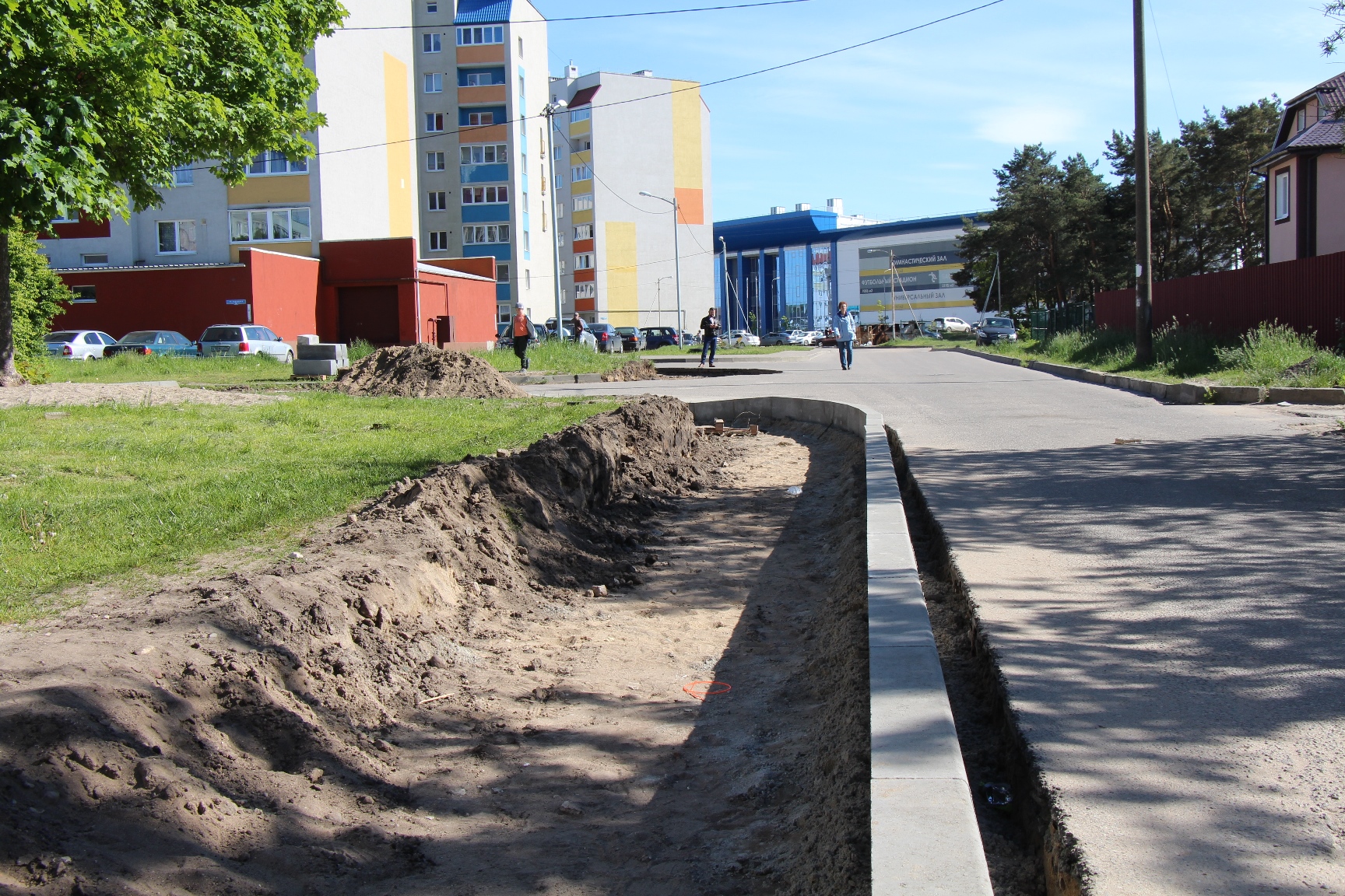 На прошлой неделе начали прокладывать тротуар по ул. Алданской в сторону физкультурно-оздоровительного комплекса. За это время выставлен бортовой камень, устроено «корыто», идёт подготовка основания. Здесь контракт также не даёт расслабиться – тротуар должен быть готов 7 июня.