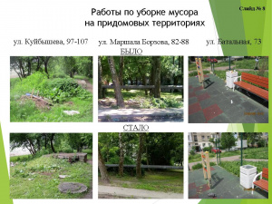 Проведены проверки по обеспечению управляющими организациями уборки мусора, покоса травы на придомовых территориях. Управляющие организации с начала года получили 213 актов с замечаниями по санитарному содержанию придомовых территорий для принятия мер. Все работы выполнены.