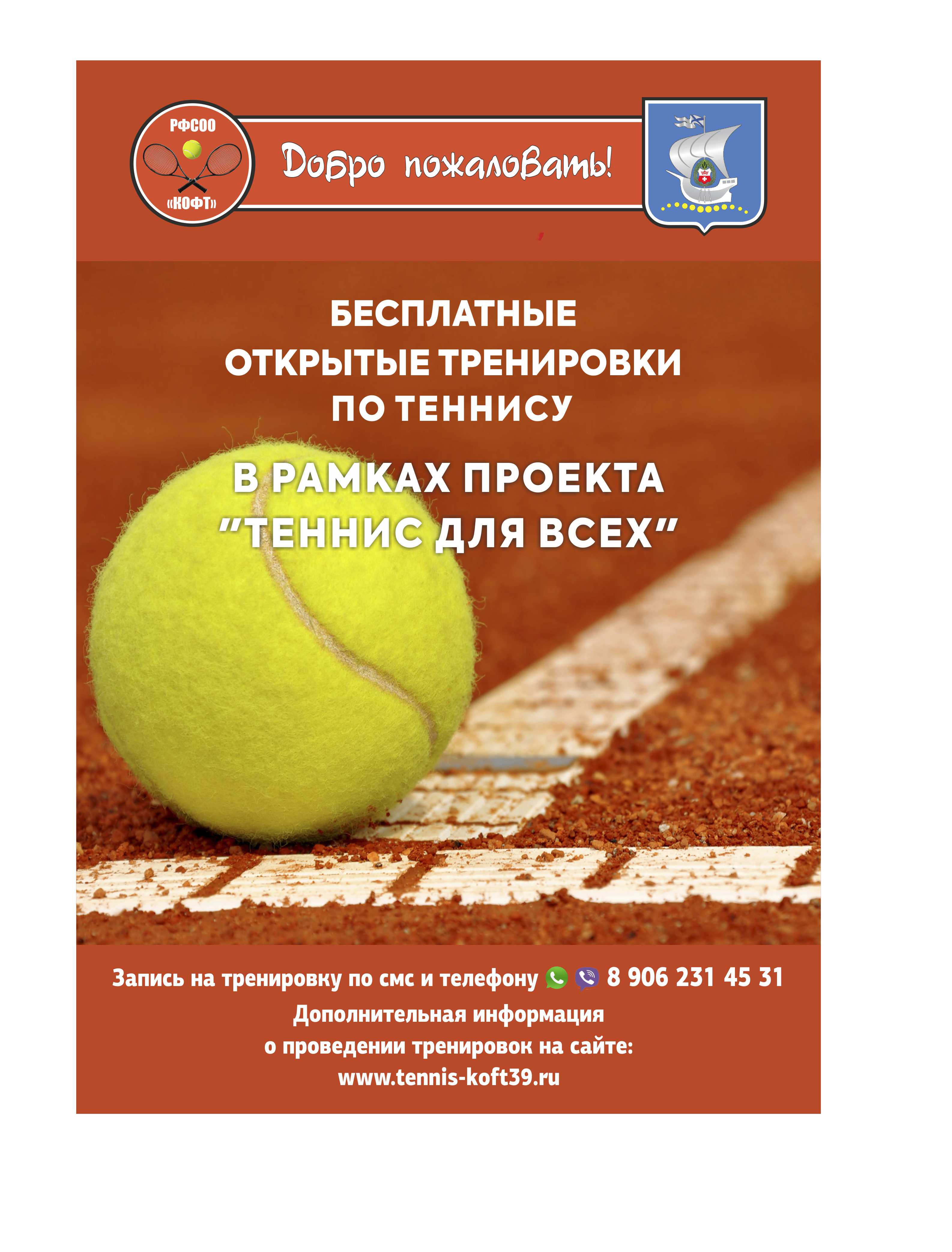 В рамках проекта «Теннис для всех» любой желающий житель Калининграда может записаться на бесплатные тренировки по теннису и под руководством профессиональных тренеров попробовать себя в этом виде спорта. При желании можно продолжить занятия теннисом, придя в муниципальную спортивную школу или выбрать удобный для себя клуб тенниса по месту жительства. Бесплатные тренировки будут проводиться с июля до декабрь 2021 года по предварительной записи. Всем участникам тренировок будет предоставлен инвентарь (ракетка, мяч). Группы будут формироваться по возрастам для наиболее комфортного и благоприятного взаимодействия участников, в первую очередь из числа лиц впервые подавших заявку.