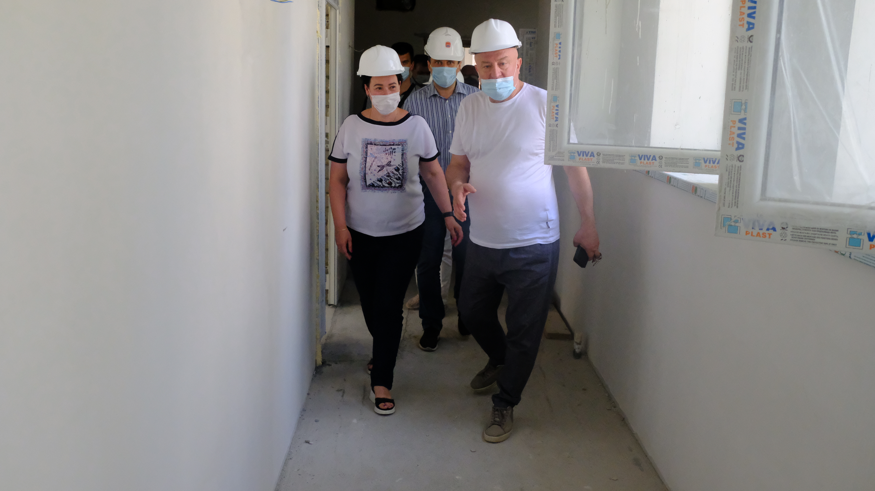 Первый пункт сегодняшнего визита - детский садик на 350 мет по ул. 3-го Белорусского фронта. На этом объекте к подрядчику, ООО «Строительное управление РСТ», больше всего вопросов. Он уверяет, что это только сейчас из-за жары на объекте не очень много людей, а пик скопления рабочих приходится на утренние часы, но в ходе проверки выясняется, что торги на немонтируемое оборудование начнут объявлять только в августе, а к 25 сентября дошкольное учреждение должно быть уже введено в эксплуатацию.