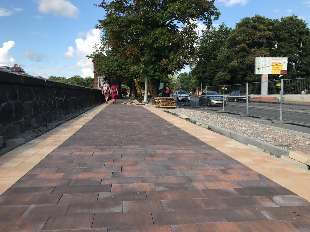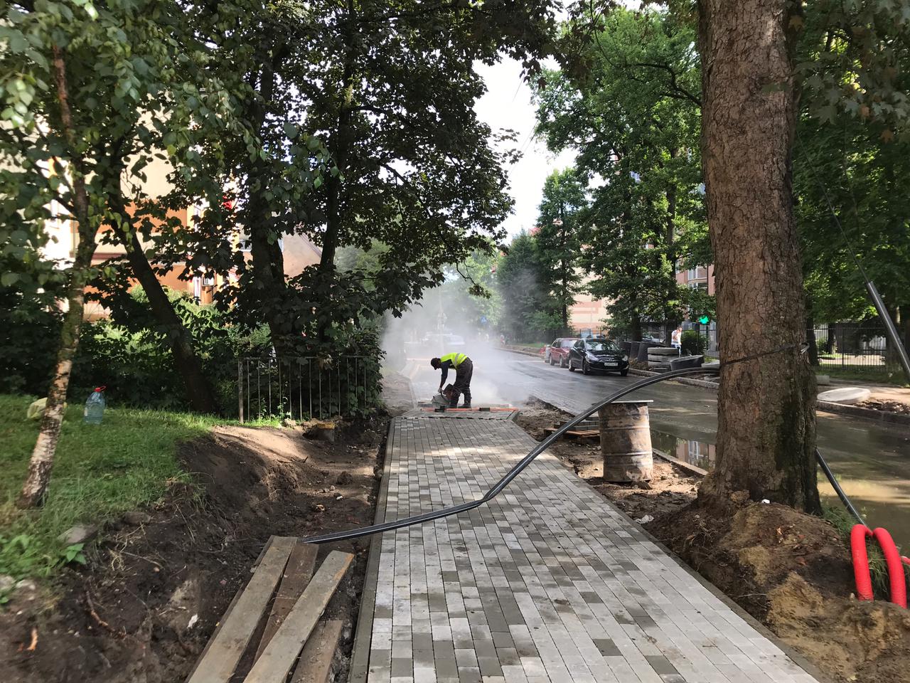 На Черняховского основание под велодорожку и тротуар подготовлено полностью, началась укладка плитки от Музея янтаря в сторону Озёрного проезда.