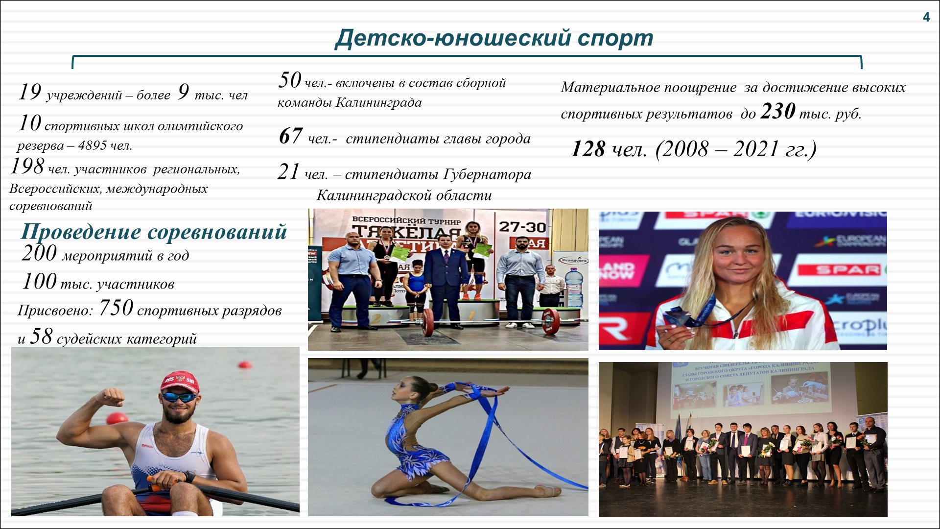 Подготовку спортивного резерва в городе организуют 19 спортивных школ, в которых обучаются всего 8 162 человека. Одним из основных показателей деятельности спортивных школ являются результаты, достигнутые на соревнованиях различного уровня, включая Всероссийские Чемпионаты, Первенства, чемпионаты мира, Европы. Только за последние полгода 198 воспитанников муниципальных учреждений приняли участие в соревнованиях регионального, всероссийского, международного уровня, более 50 включены в состав сборной команды Калининградской области по различным видам спорта.