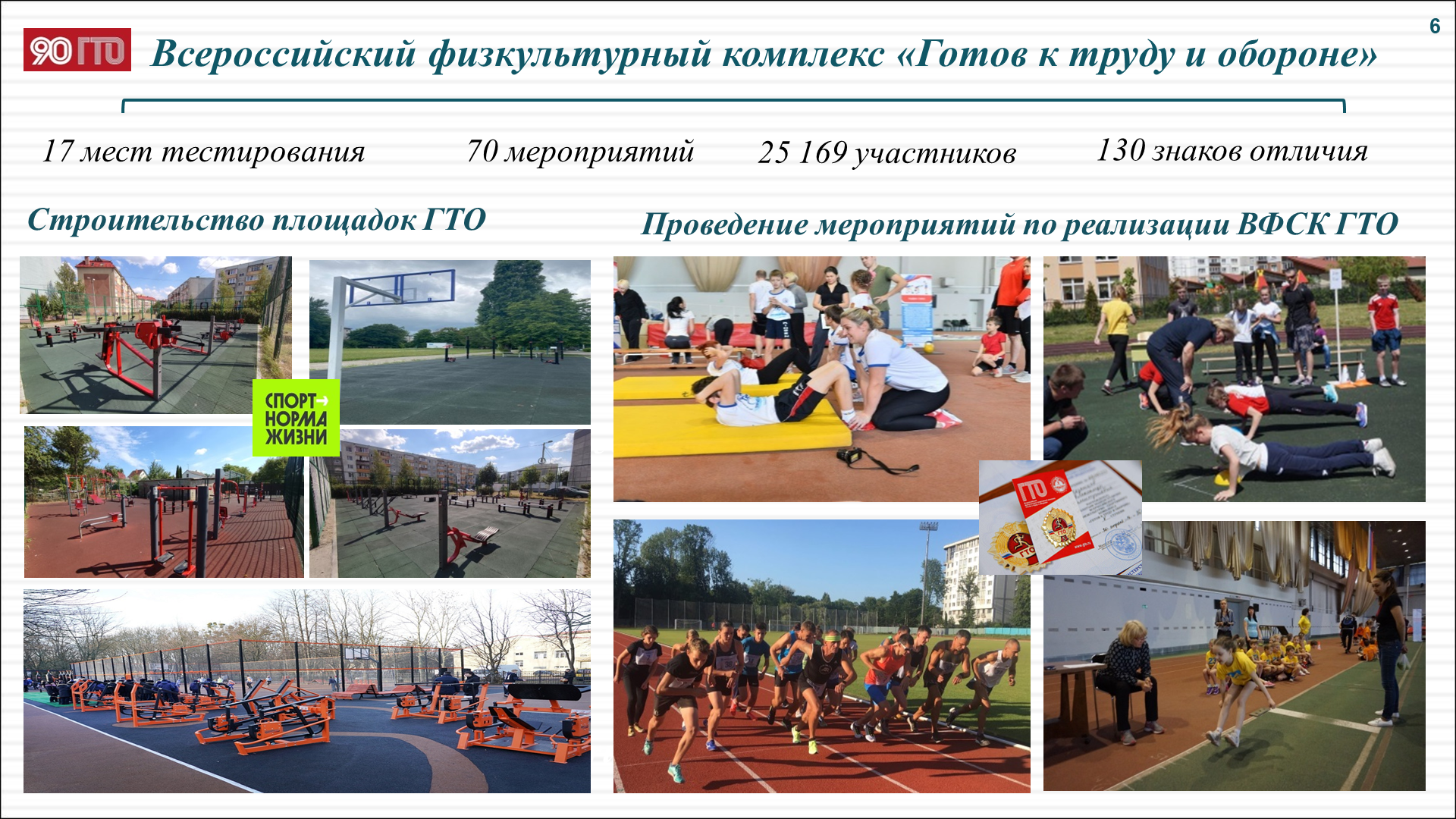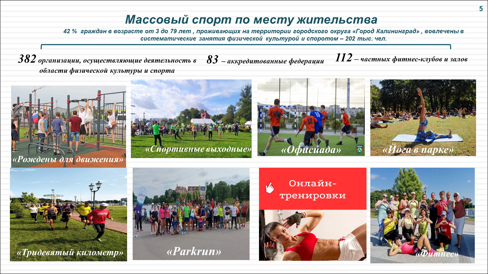Проводится также физкультурно-спортивная работа по месту жительства граждан, проведение муниципальных физкультурных и спортивных мероприятий. В целом в городе в данной работе принимает участие 382 организации. Полюбились калининградцам такие спортивные проекты: «Рождены для движения», проект «Спортивные выходные», «Йога в парке», «Тридевятый километр» и «Офисиада», в рамках которых на спортивных площадках по месту жительства в выходные и праздничные дни общественными организациями при поддержке комитета по социальной политике проводятся бесплатные тренировки по различным видам спорта с привлечением профессиональных тренеров.