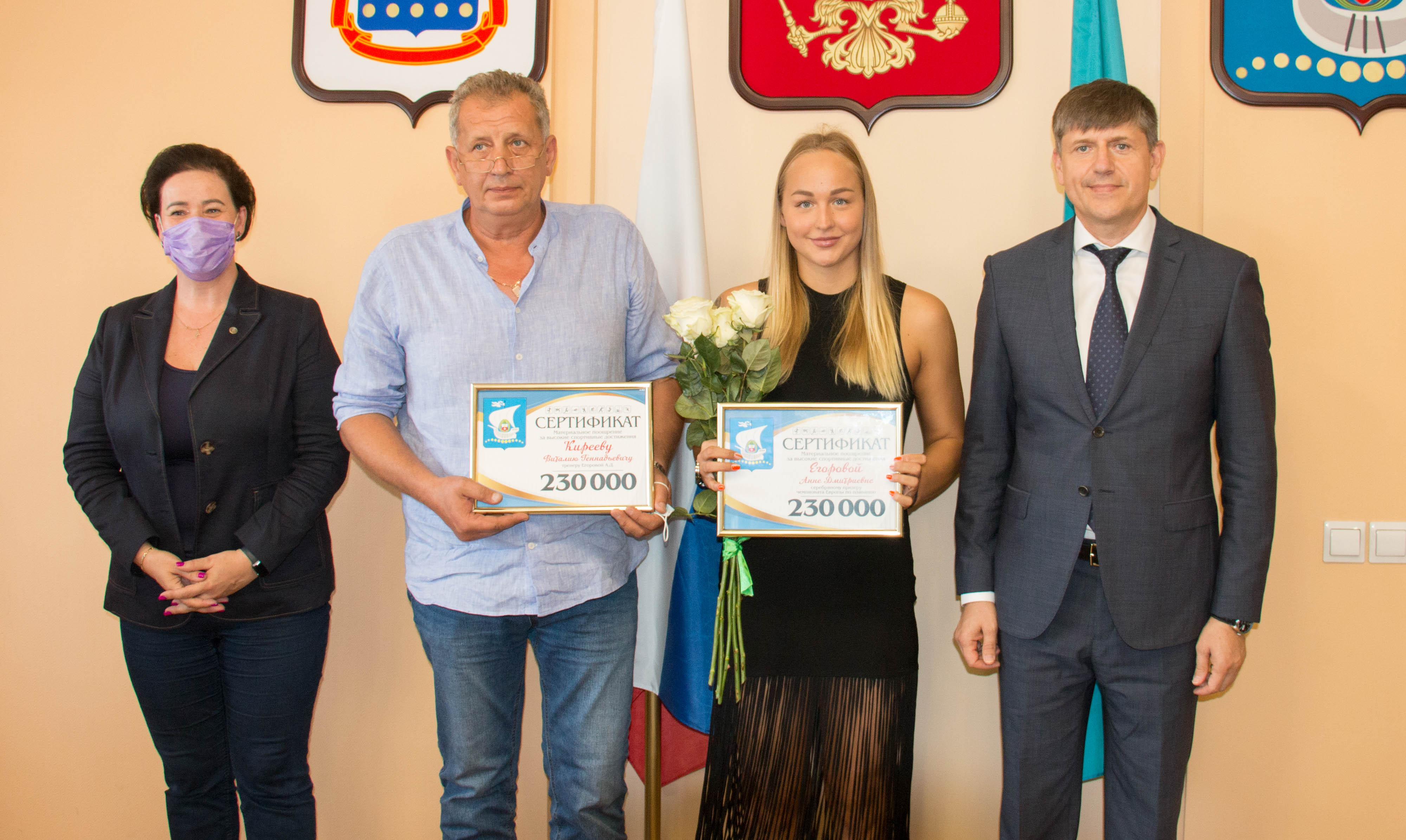 Так, сегодня воспитанницу 14 спортивной школы по плаванию Анну Егорову - финалистку Летних Олимпийских игр в Токио, призера чемпионата Европы, ее тренера Виталия Киреева поздравили с профессиональным праздником и вручили сертификаты на материальное поощрение за высокие спортивные достижения.