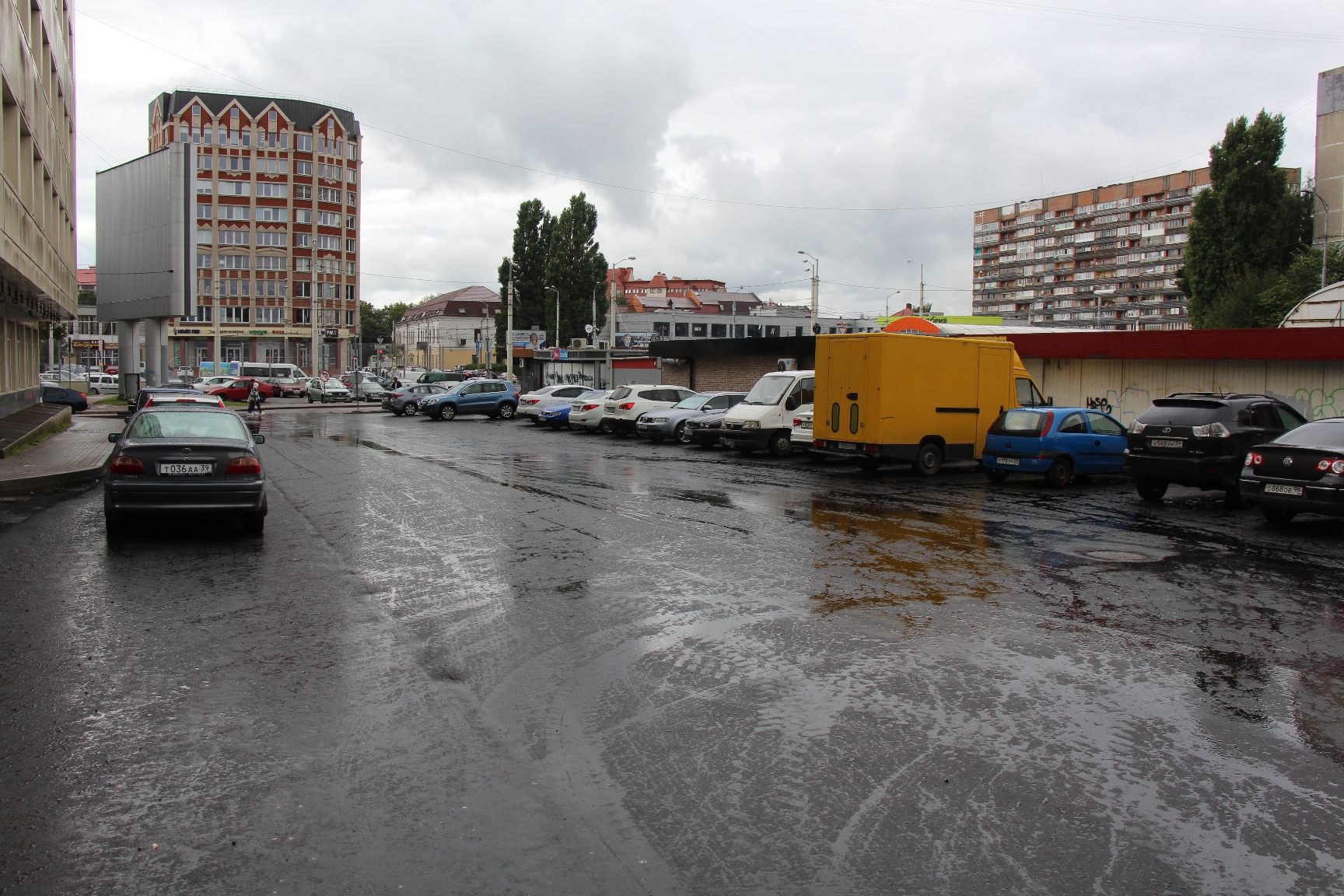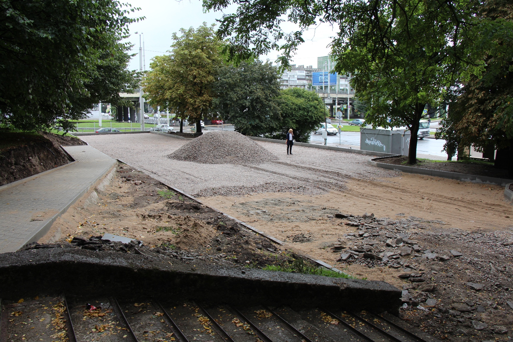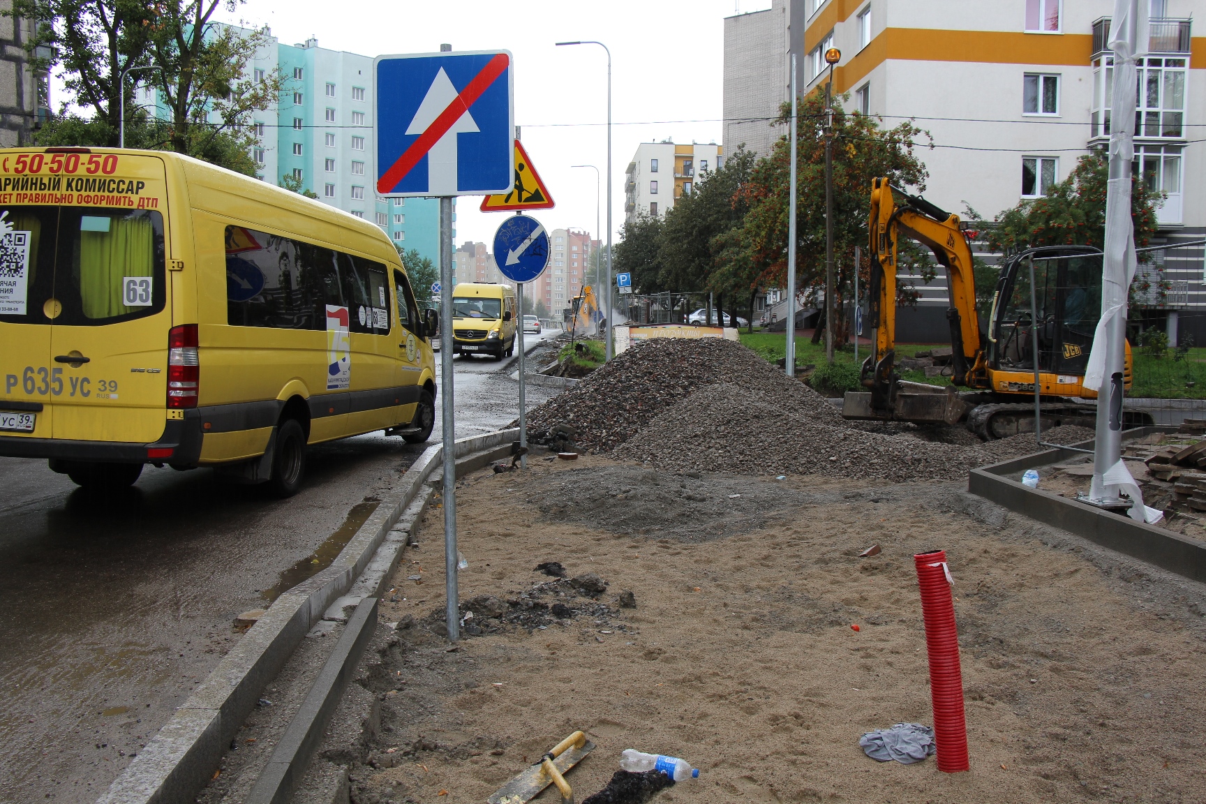 Неподалёку, на Московском проспекте у дома №95 (бывш. «Калининградгражданпроект») недавно начали земляные работы, подготовку основания, установку бортовых камней, а уже сейчас на паркинге и тротуаре там ровняют слой щебня.