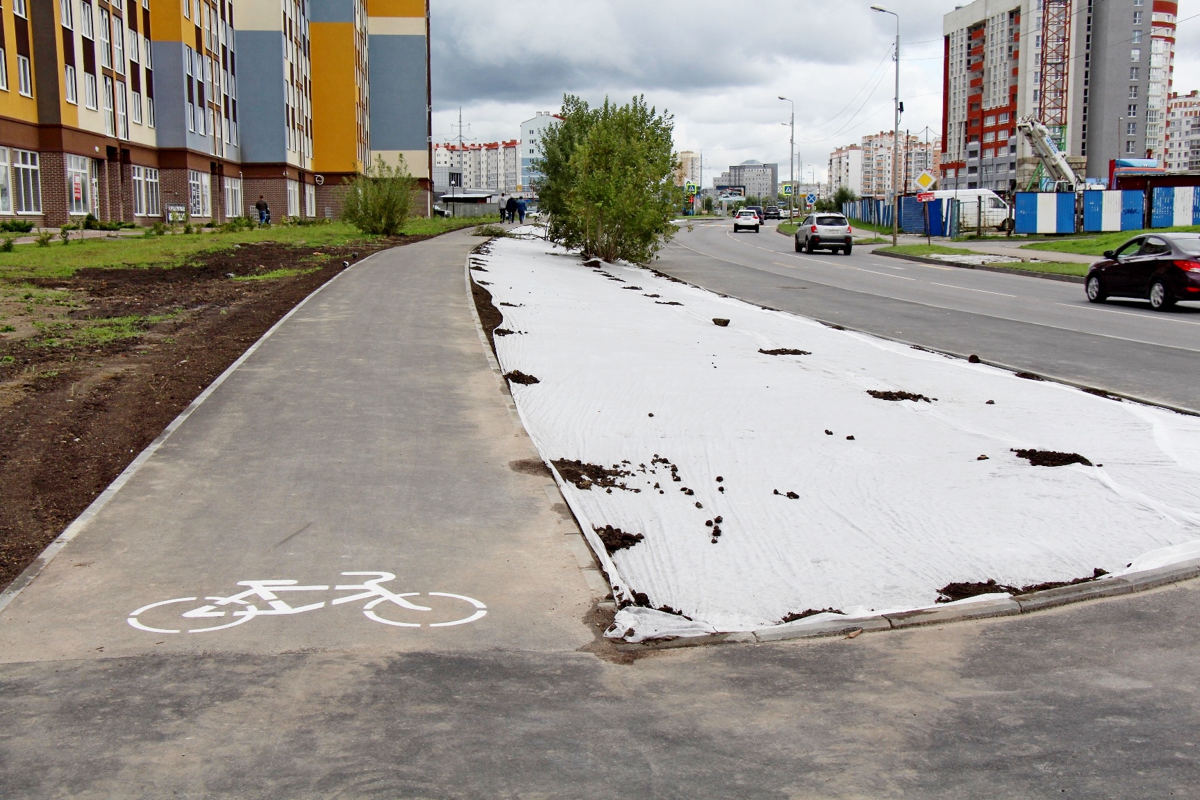 С ул. Елизаветинской в Северном микрорайоне («Сельма») дорожники уже ушли. Теперь здесь разделённые «зелёнкой» тротуар и велодорожка, два заездных кармана для автобусов, новые пешеходный переход, а засеянные газоны заботливо укрыты защитной тканью.