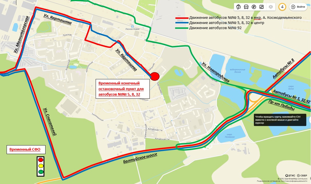 Маршруты №5, №32, №8, №92 временно не будут заезжать на остановки: «ул. Макаренко» и «ул. Карташева» при следовании из центра города и обратно. Пассажиры могут воспользоваться остановочными пунктами на разворотном кольце в районе ул. Карташева и Балтийском шоссе, остановочный пункт «Школа № 9».