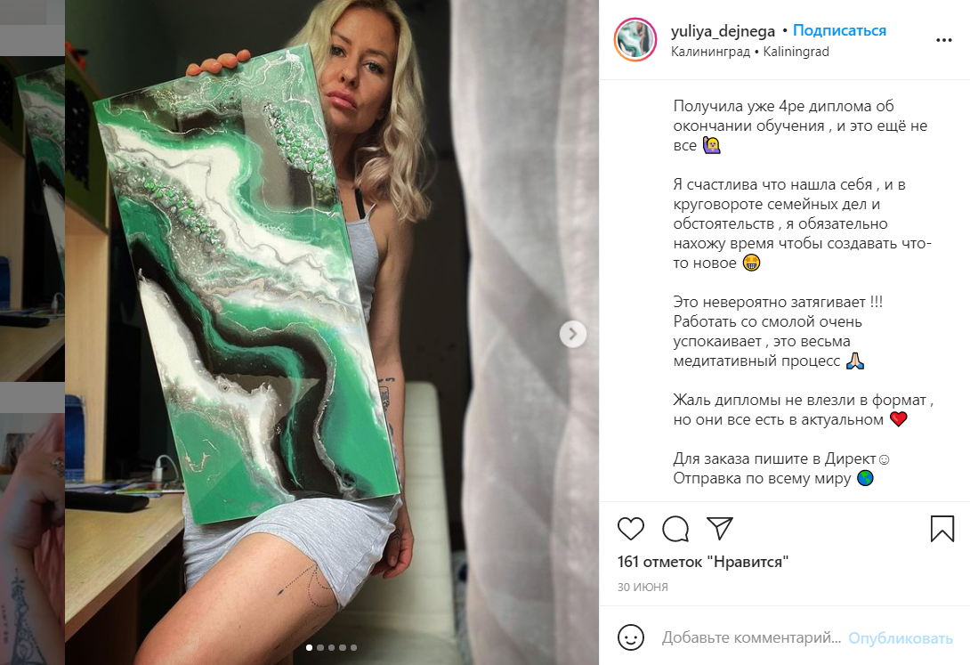 Например, калининградка Юлия Дейнега делает и продаёт предметы интерьера из эпоксидной смолы. Государство помогло ей приобрести: шлифмашинку, фрезу, точильный станок, газовую горелку, строительный фен, вытяжку-пылесос, расходные материалы (смолу, наполнители, полимеры, глистеры и т.д.). Сейчас через свою страничку в Инстаграм Юлия продаёт “хэндмейд” по всему миру.