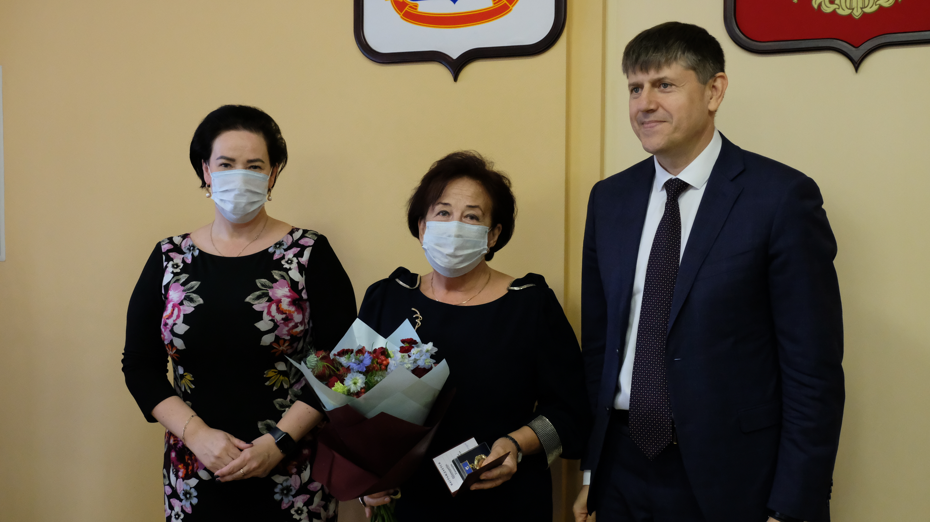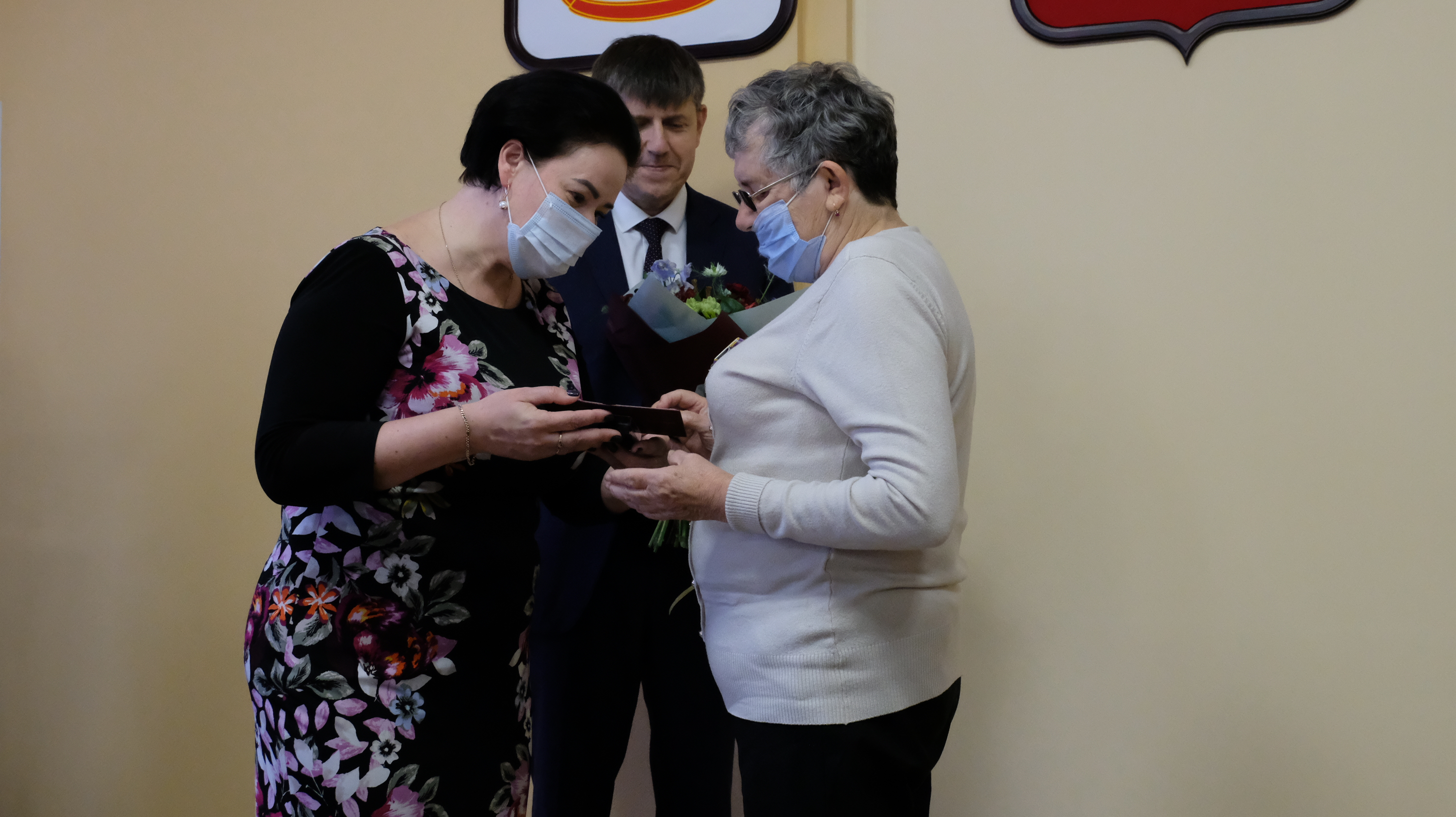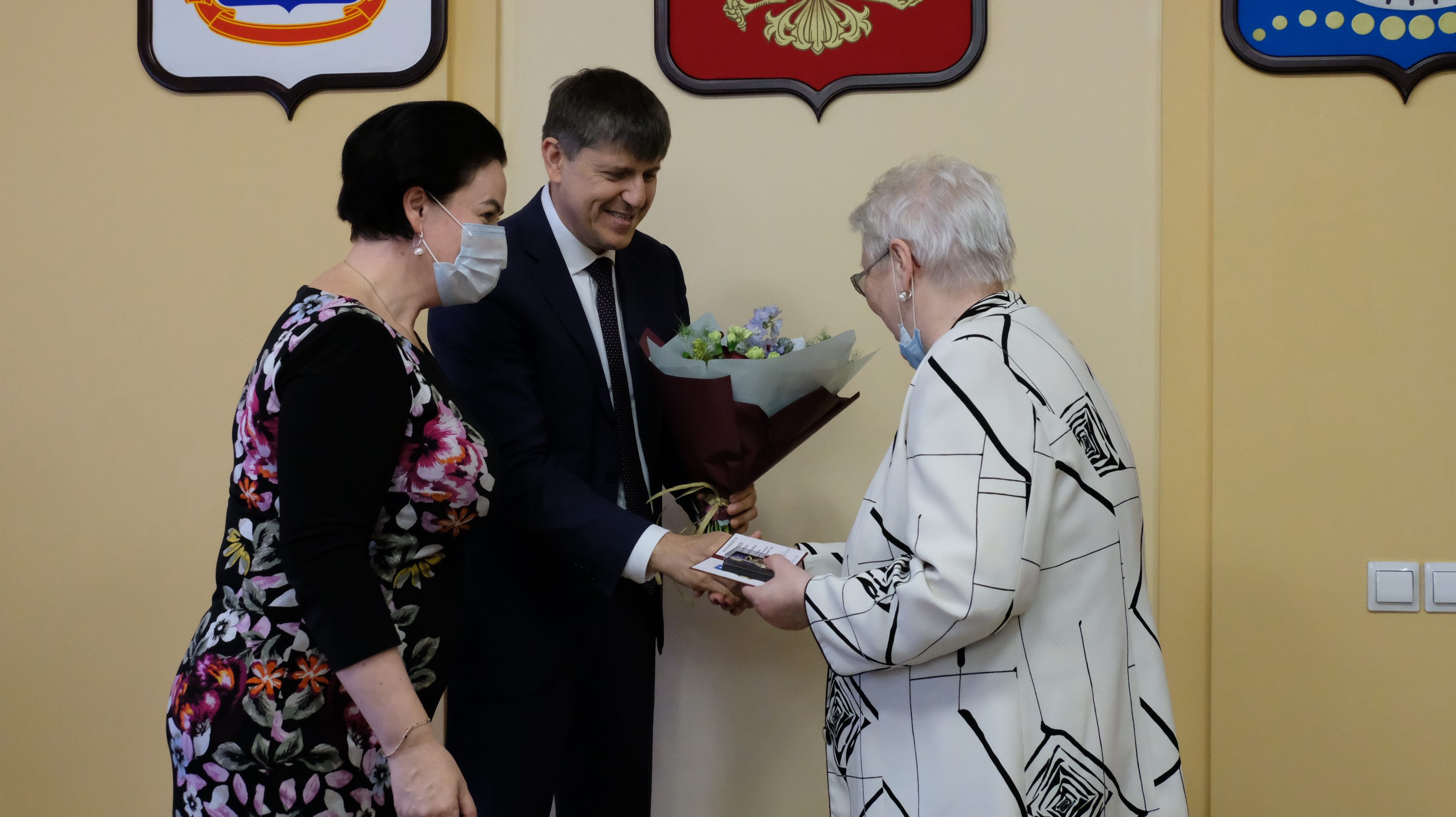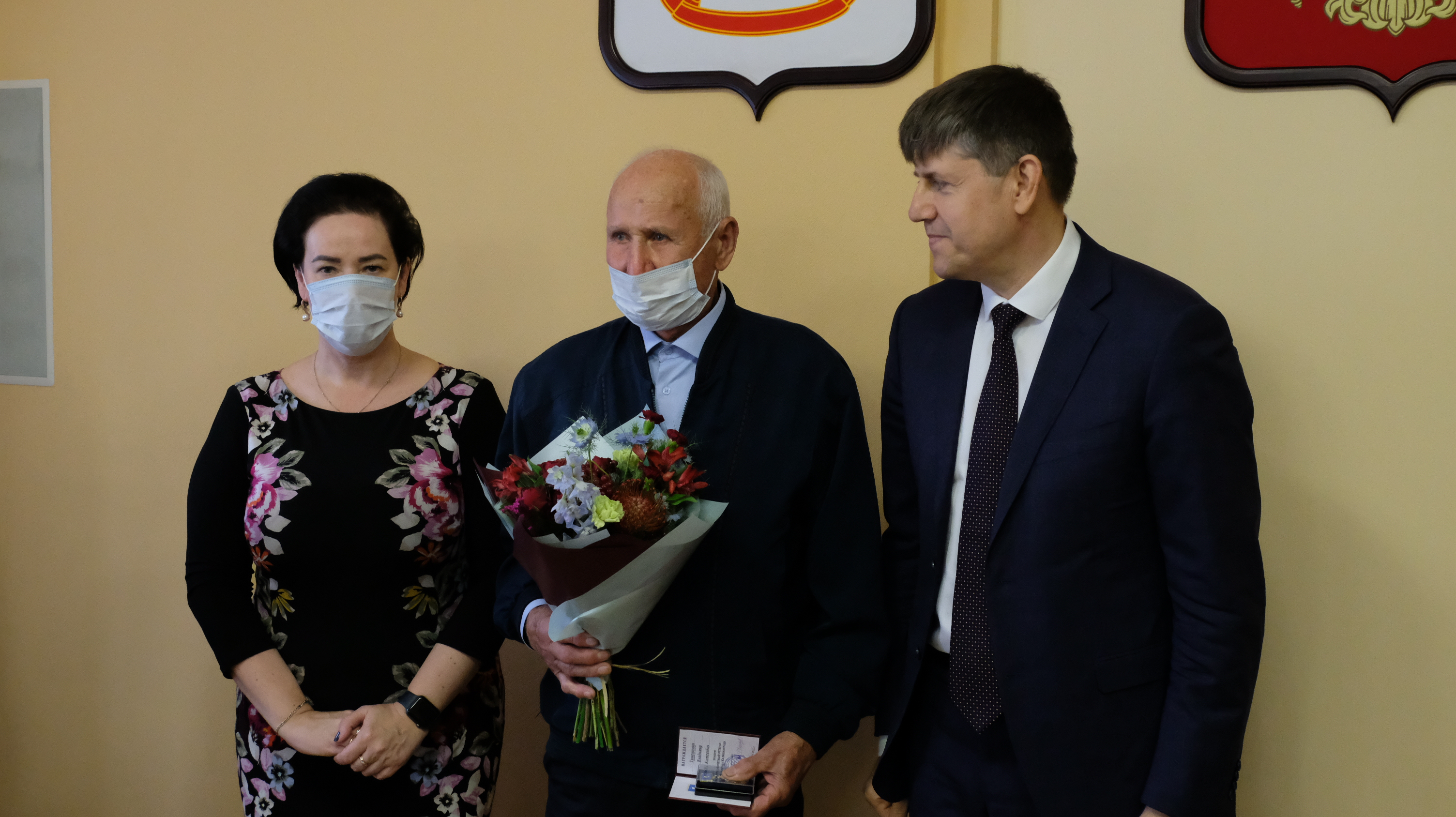 Елена Дятлова и Андрей Кропоткин поздравили ветеранов с заслуженной наградой.