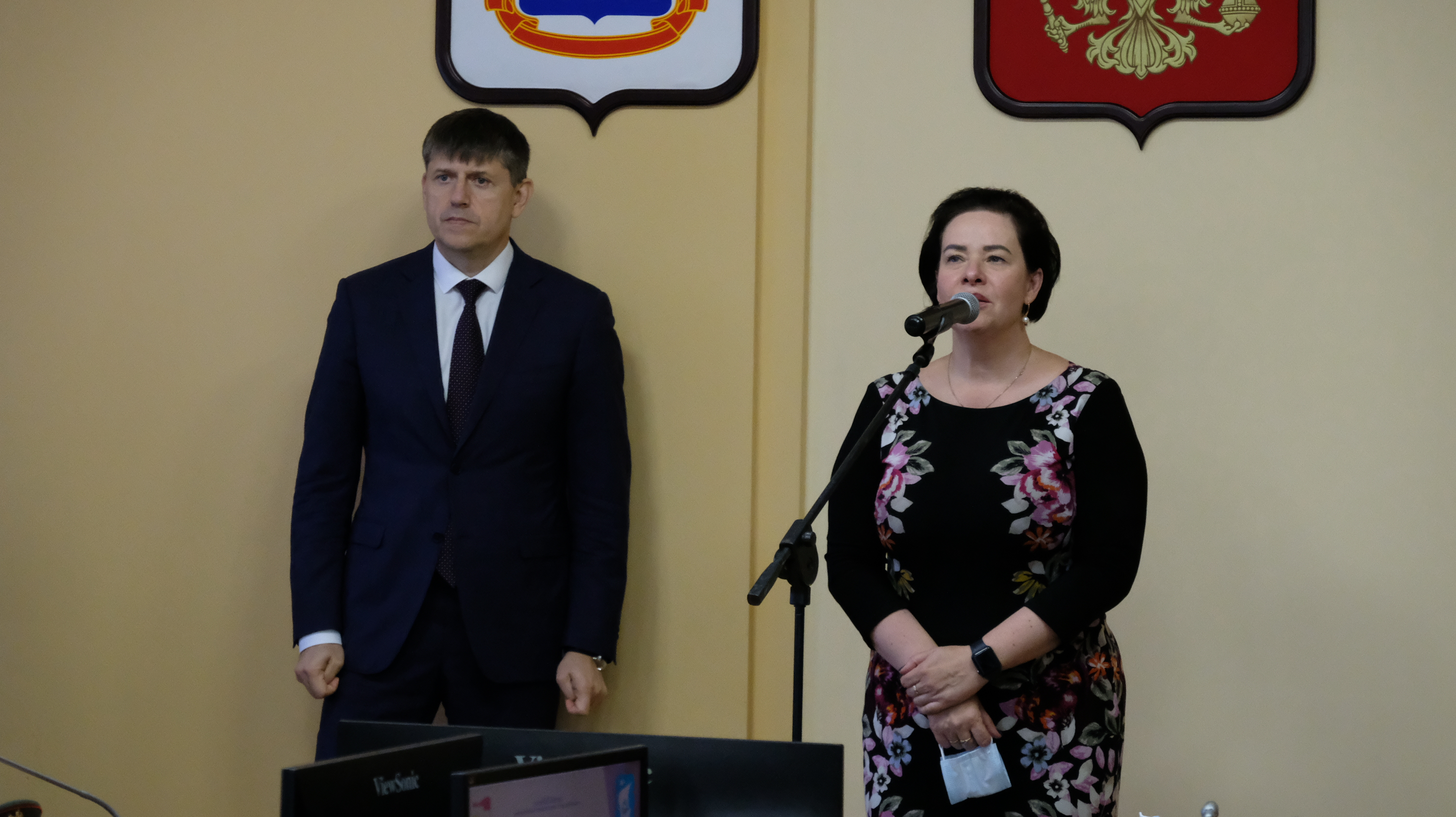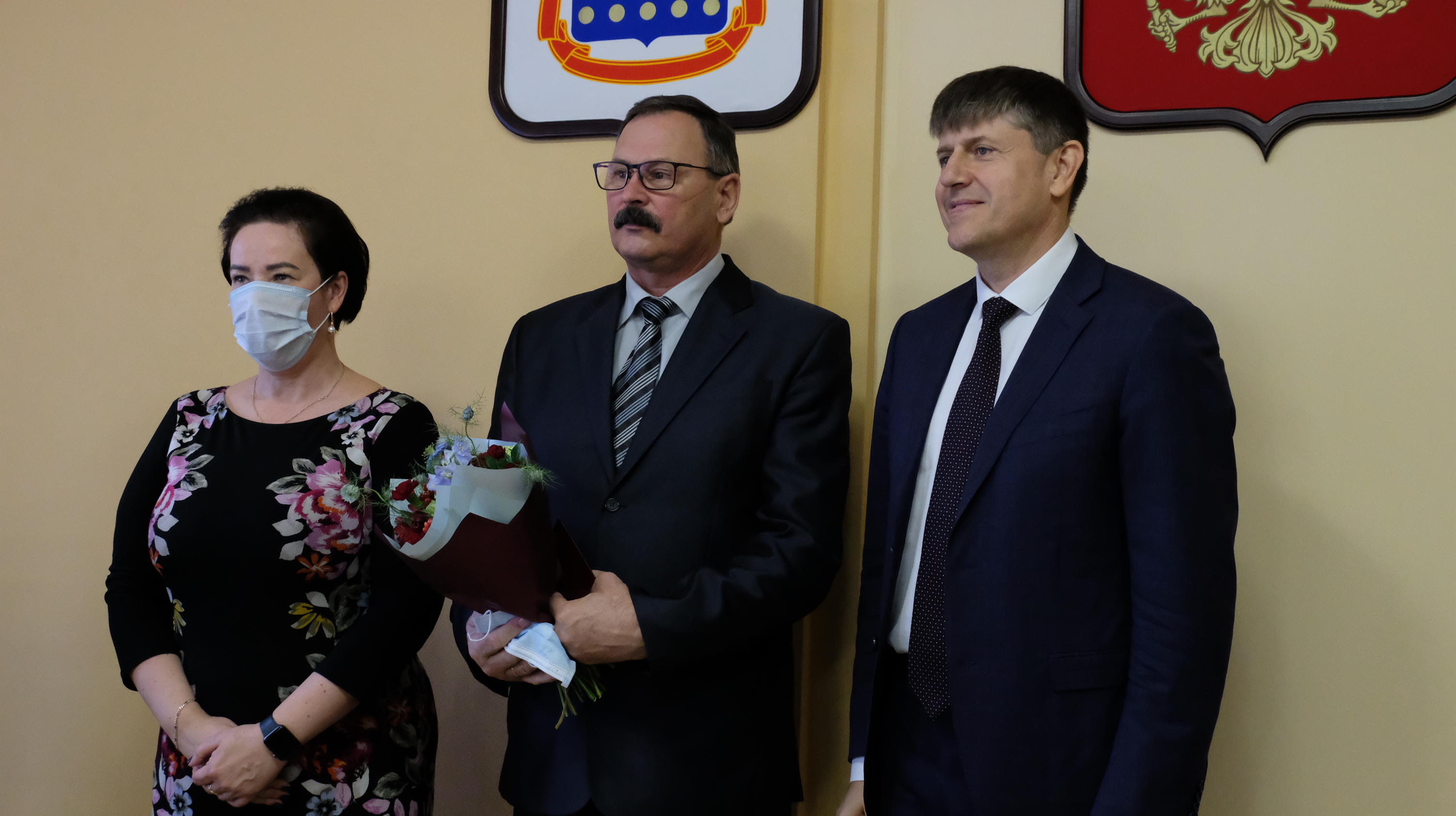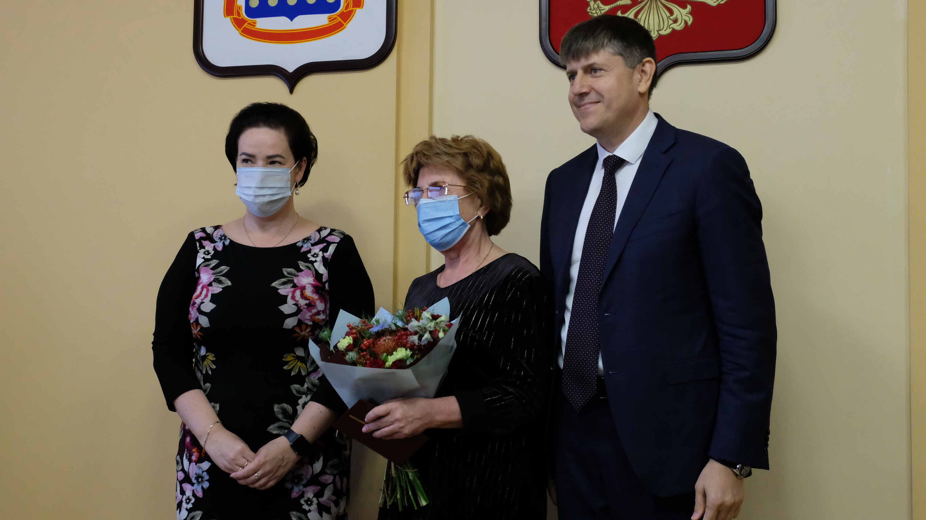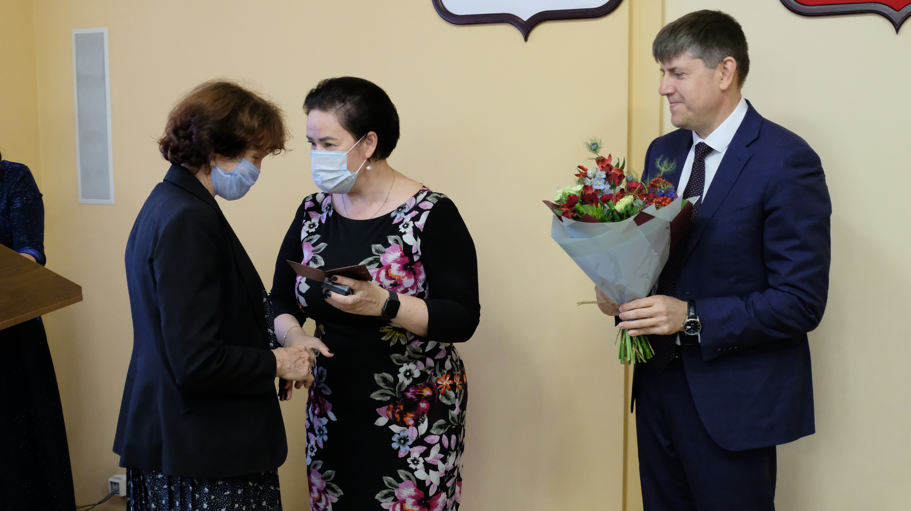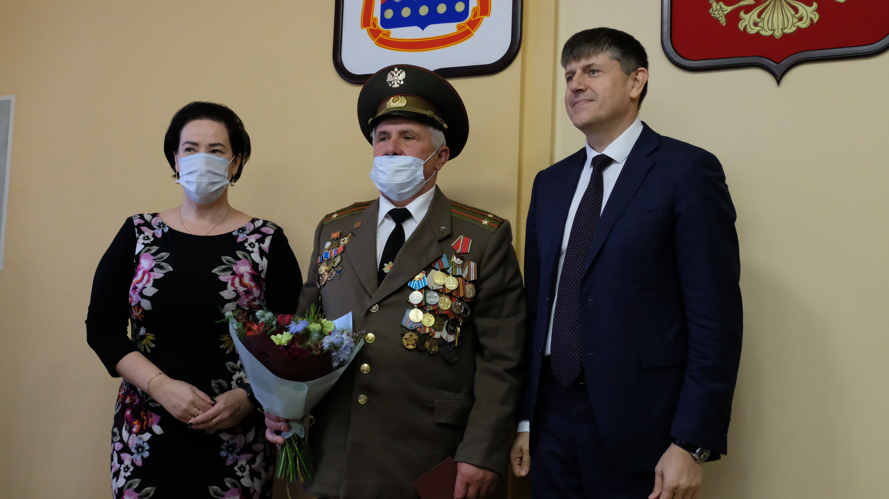 Елена Дятлова и Андрей Кропоткин поздравили ветеранов с заслуженной наградой.