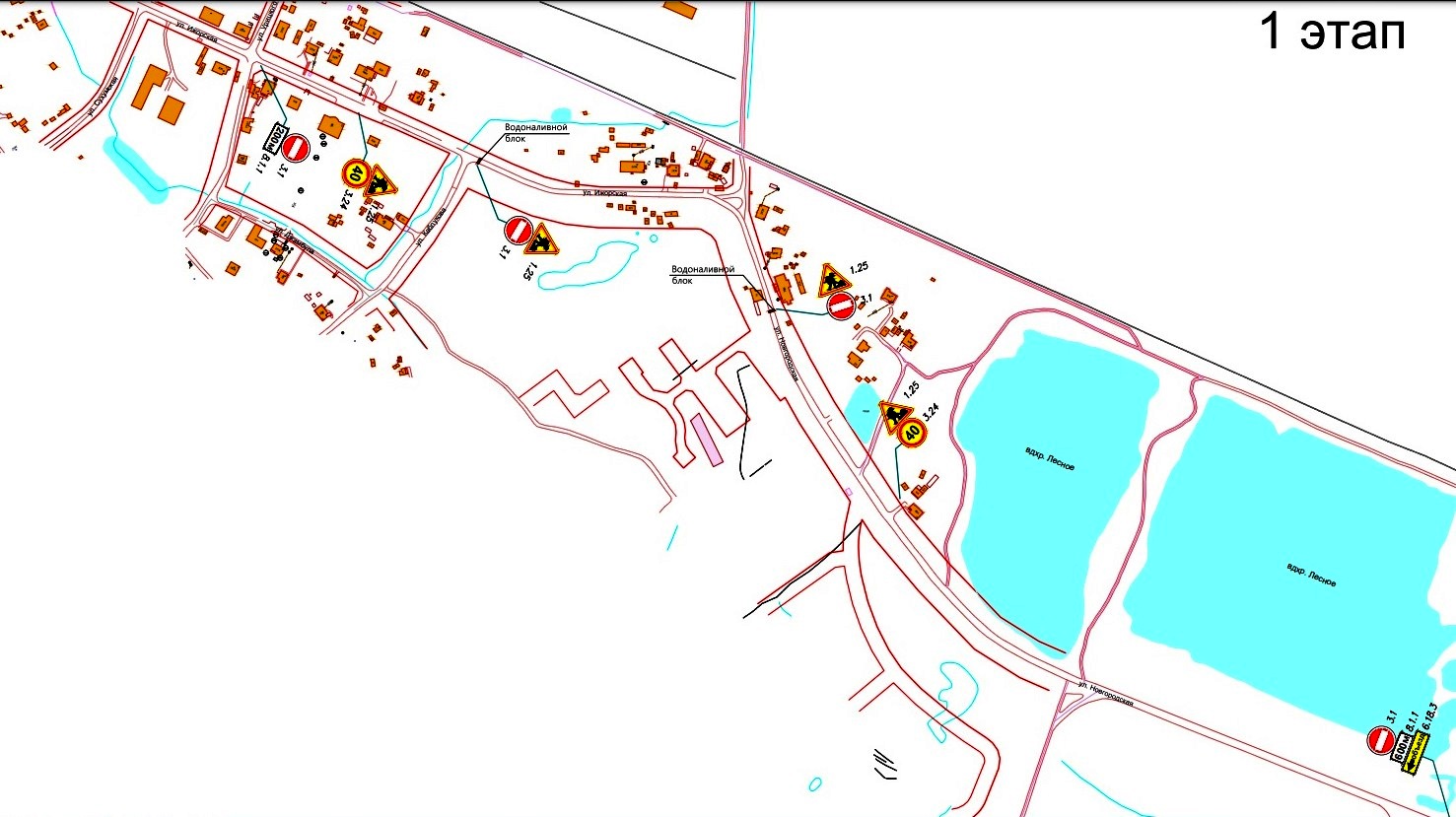 Перед началом работ будут выставлены дорожные знаки в соответствии с утверждёнными схемами объездов по этапам.