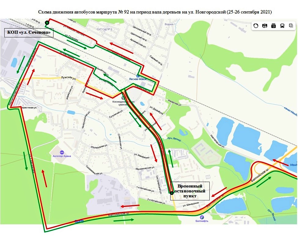 Автобусы маршрута №92 в субботу и воскресенье проследуют с Балтийского шоссе по Спасателей – Магнитогорской – Карташева – Аральской – Лужской – Челюскинской – Карташева с разворотом в районе 1- Алтайской – Карташева до Челюскинской – Ижорской – Урицкого – Хабаровской – Бурыхина – А. Толстого – Сеченова (конечная).
