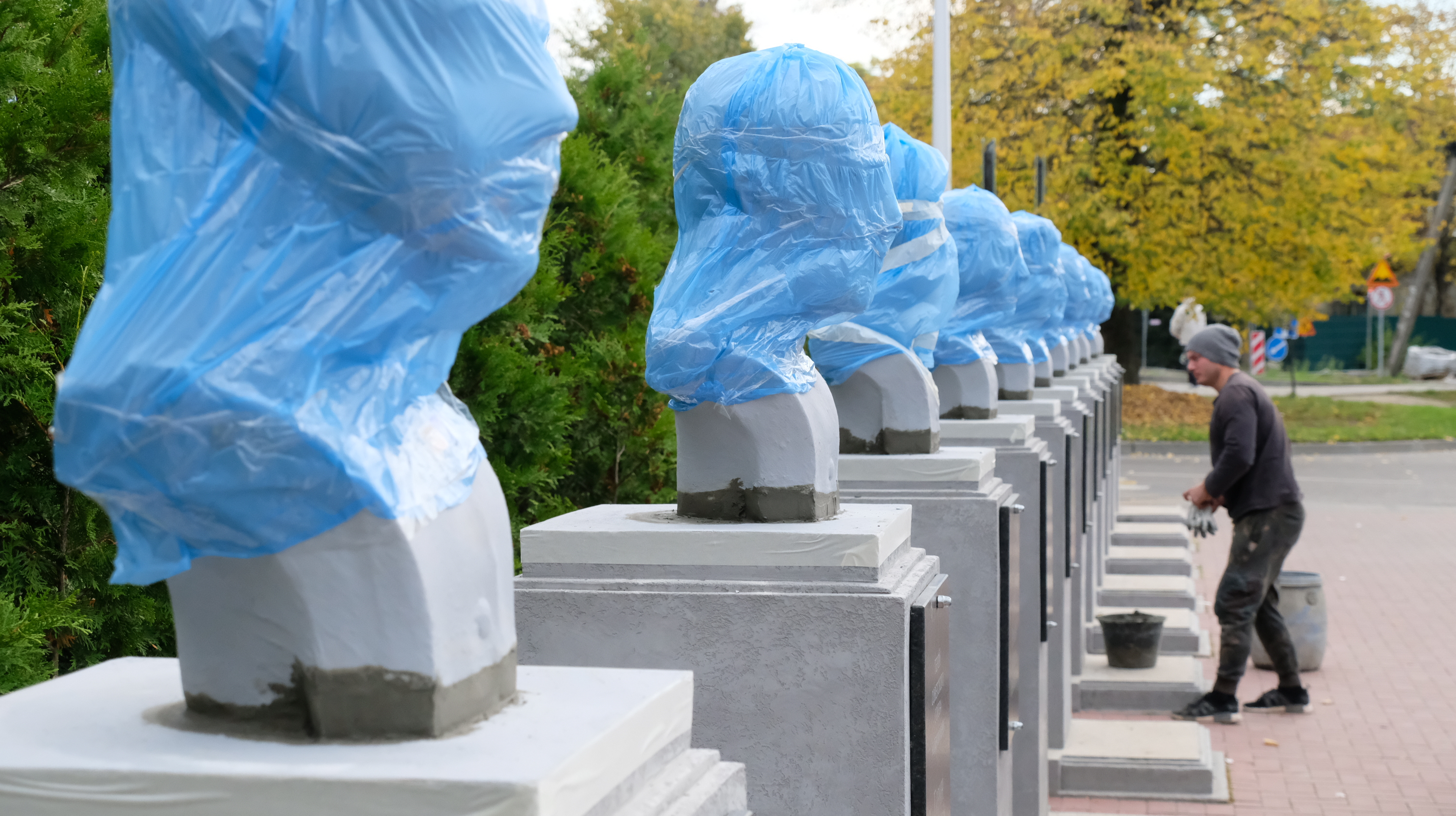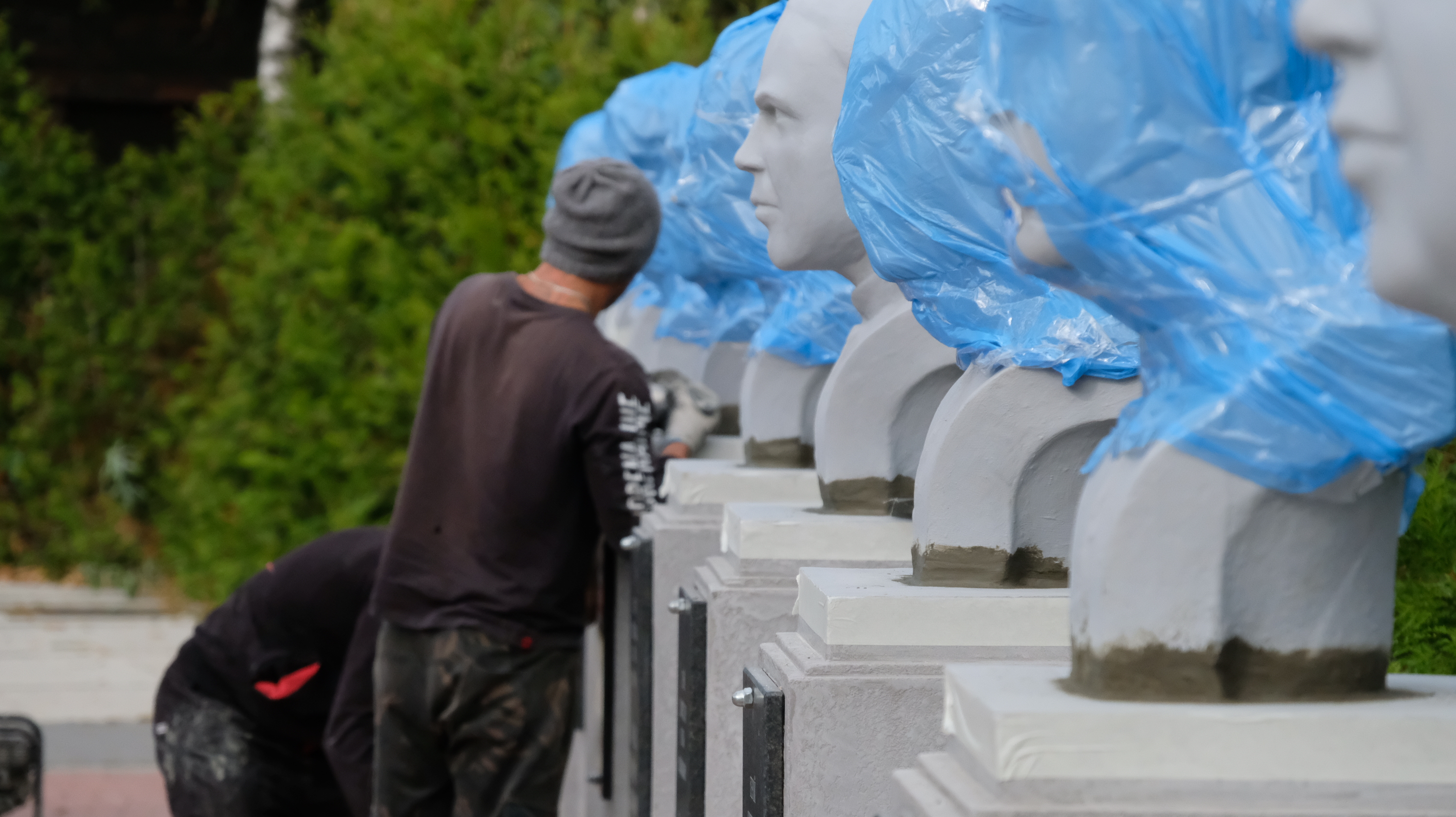 В отличие от предыдущего раза, как уверяет представитель подрядчика Сергей Гураев, эти бюсты более долговечны, так как изготовлены из чистого армированного бетона марки М-400, без добавлений жидкого стекла и прочих примесей, именно они, по мнению специалистов, и привели во время прошлой холодной зимы к порче изделий.