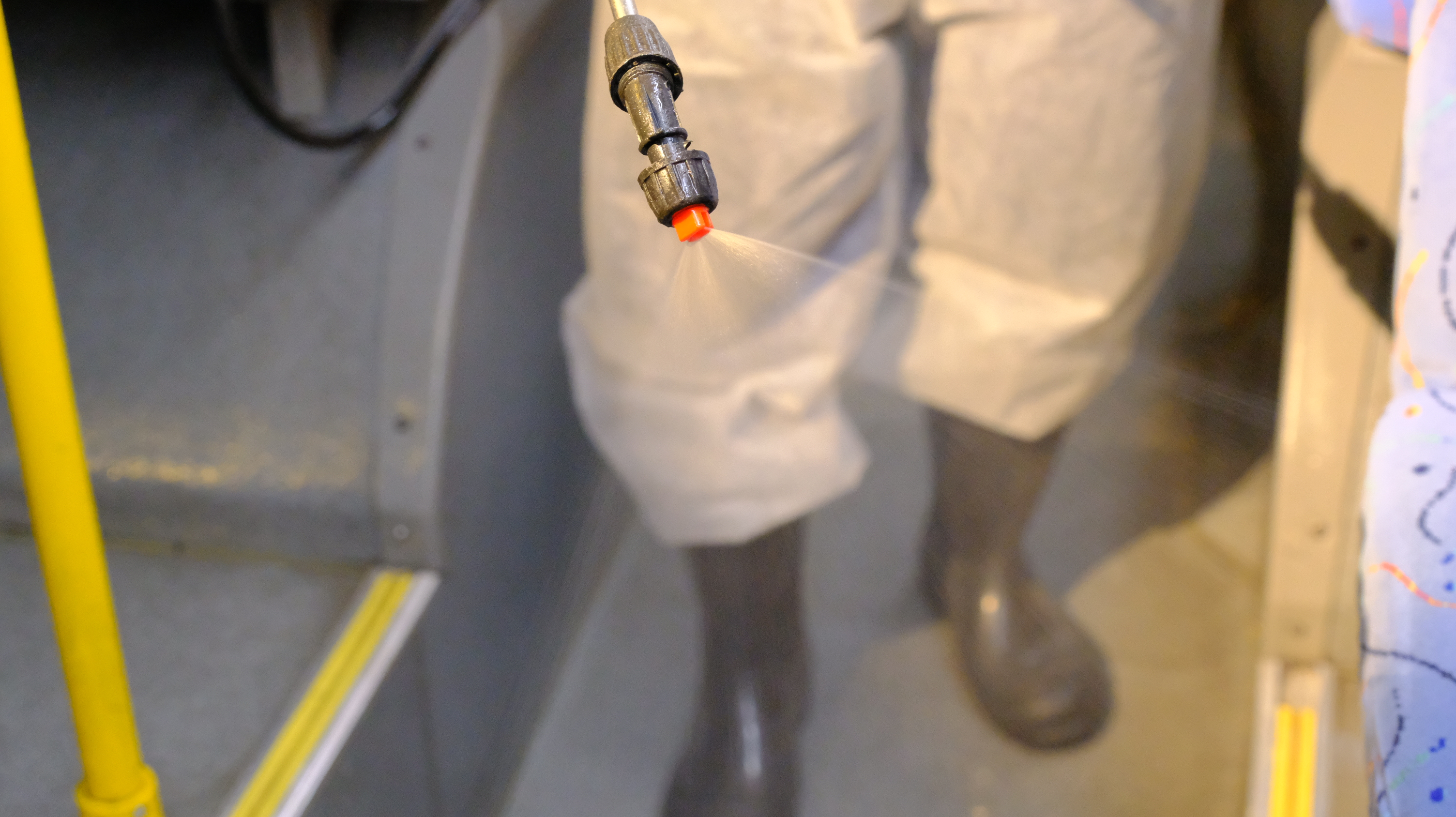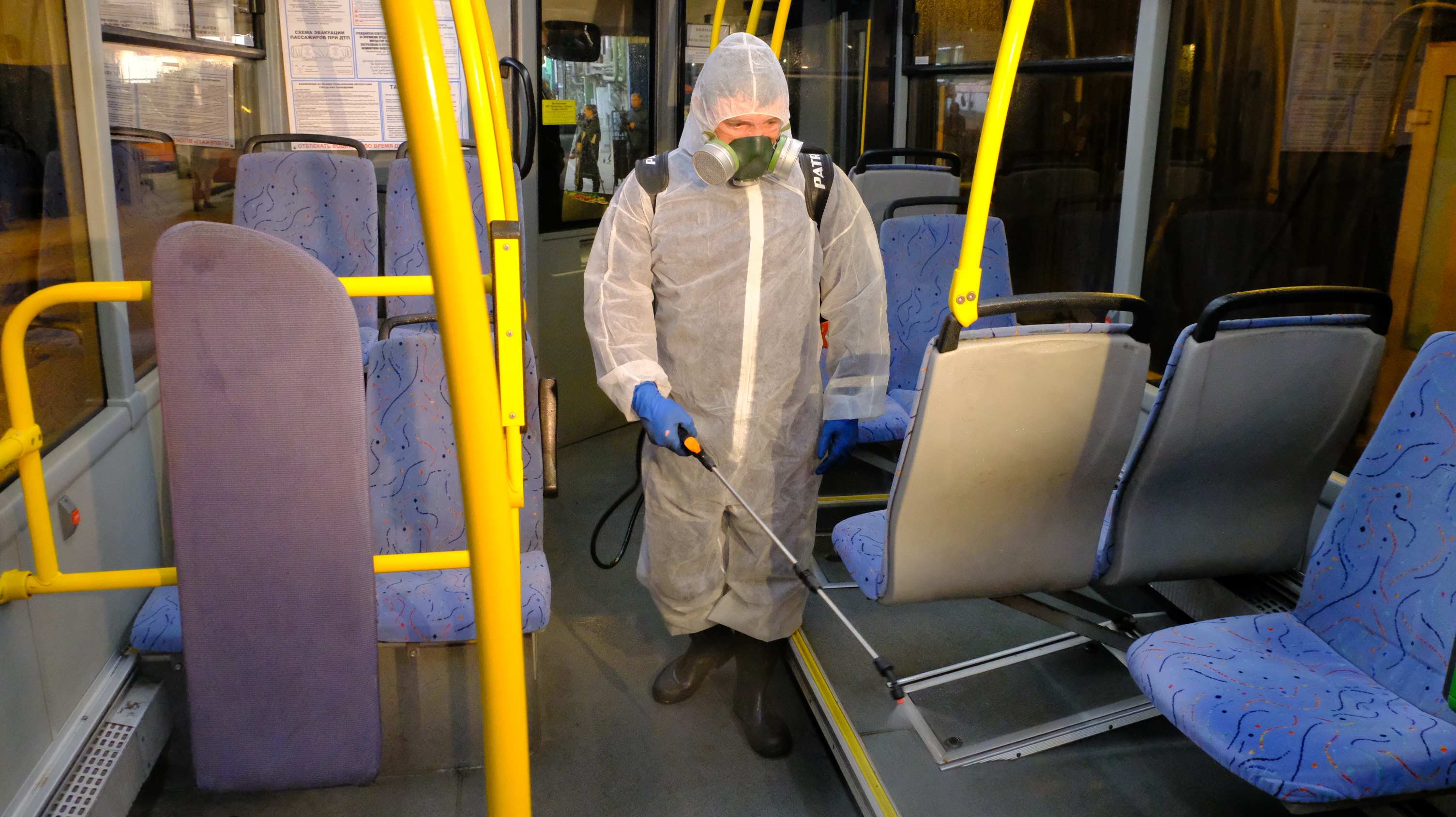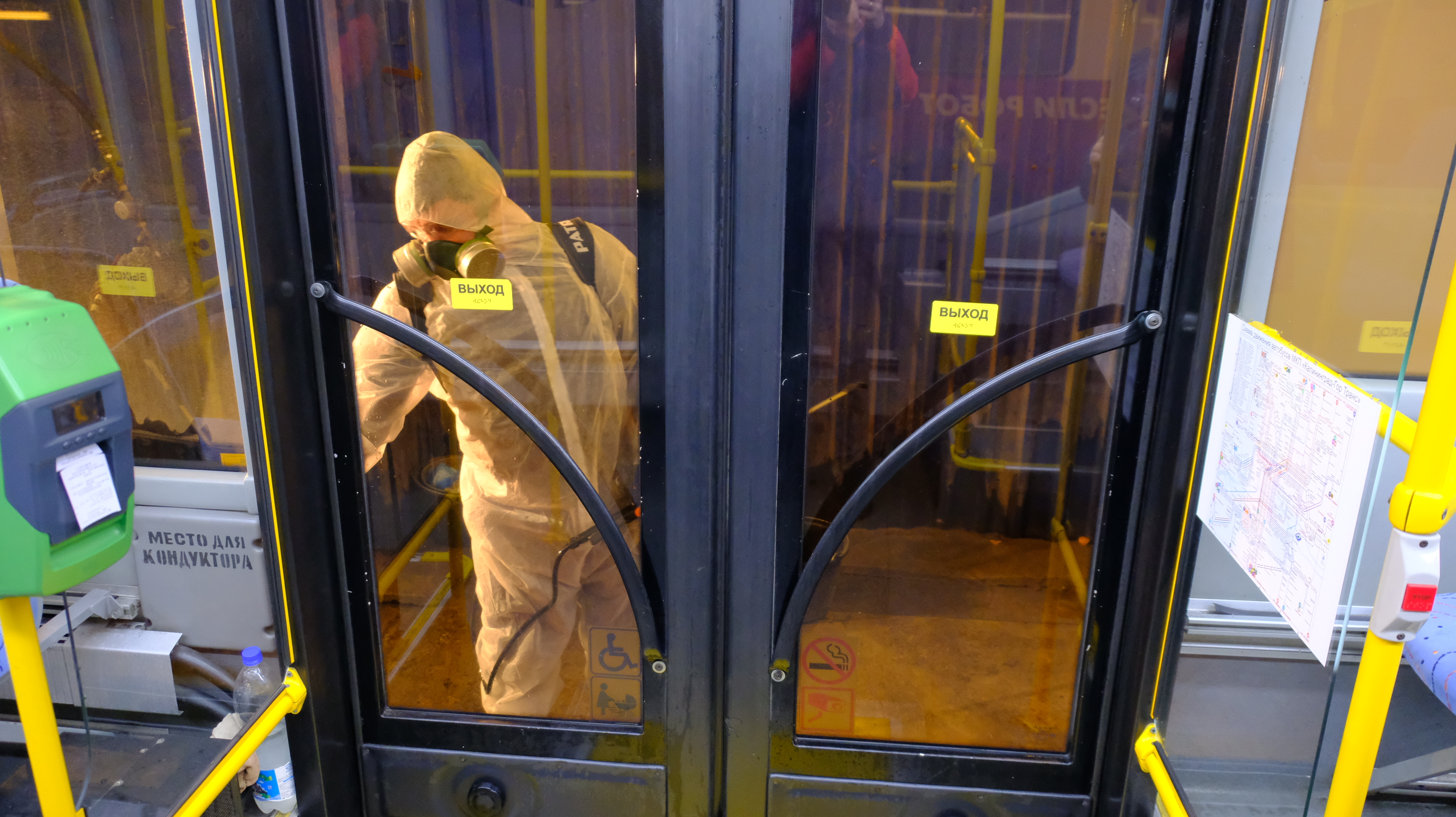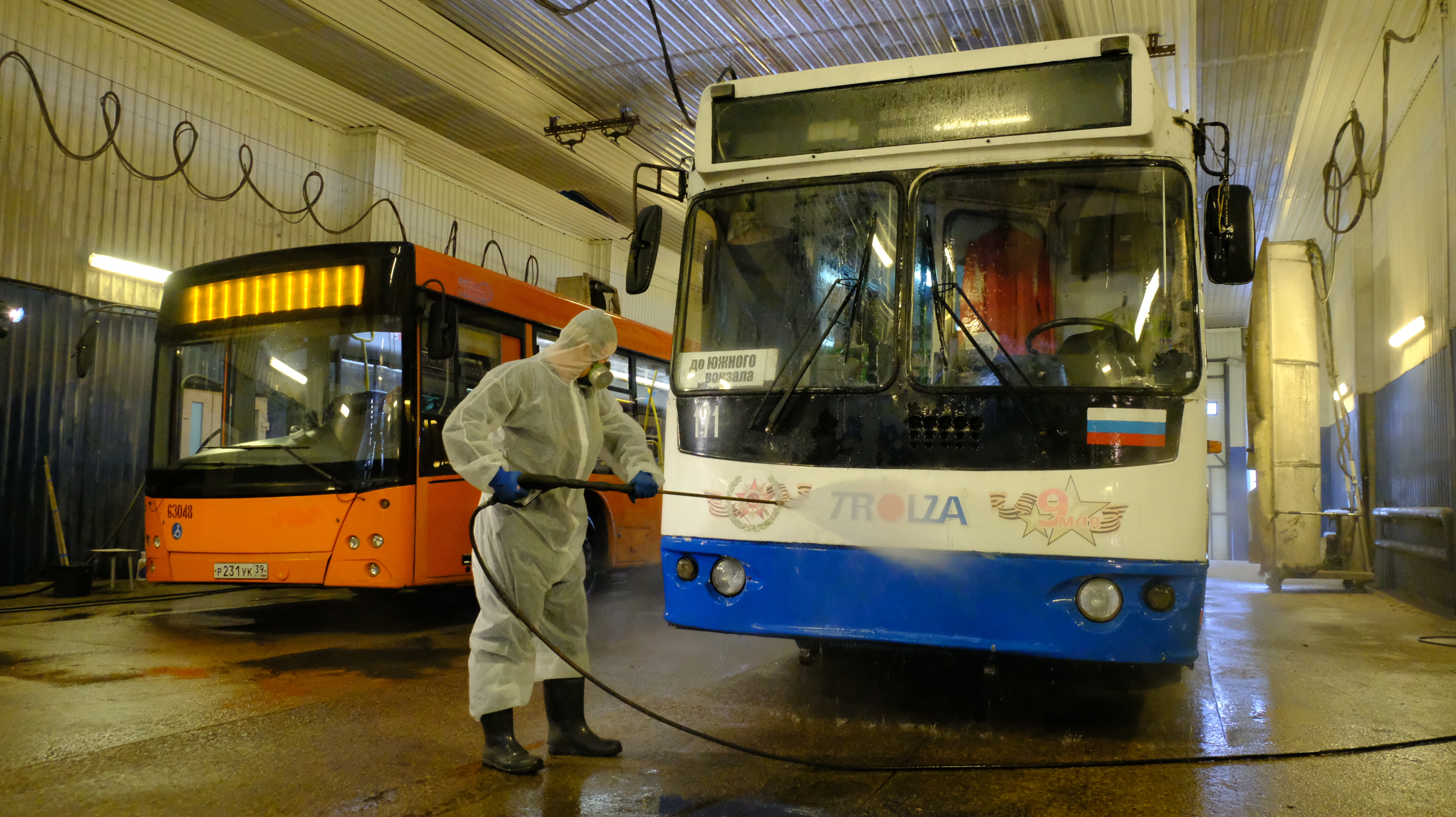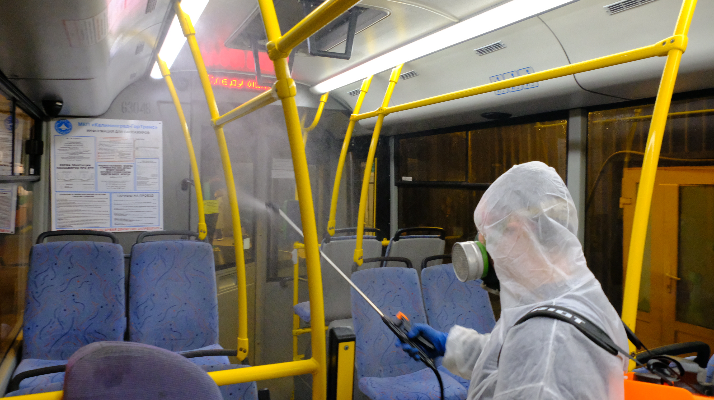 Транспорт загоняют в бокс, где распыляют дезраствор внутри салона. Также моют им и снаружи. Время экспозиции активного вещества антисептика не превышает 1 часа, что позволяет на следующее утро выпускать на линию абсолютно безопасные для человека автобусы, троллейбусы и трамваи.
