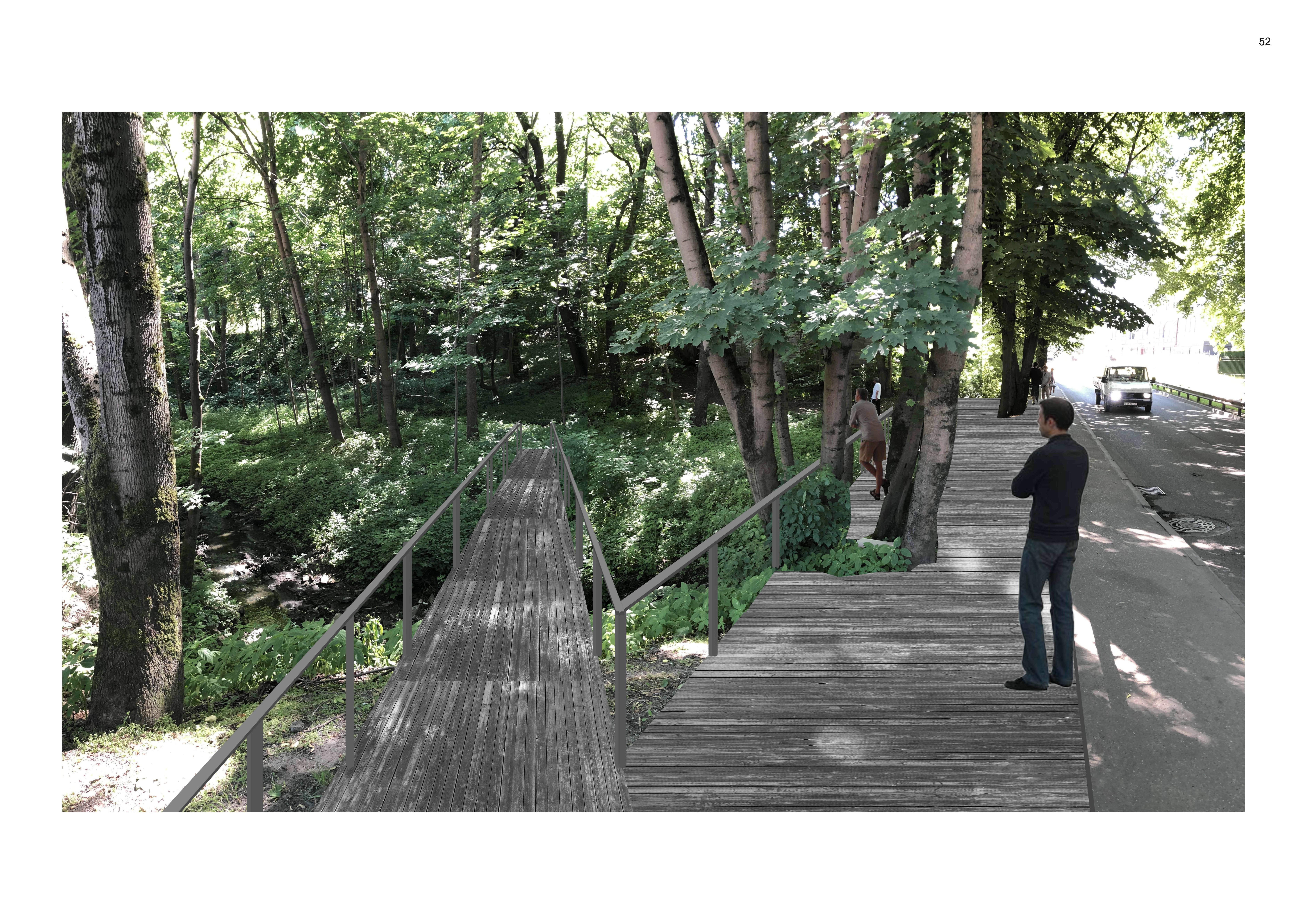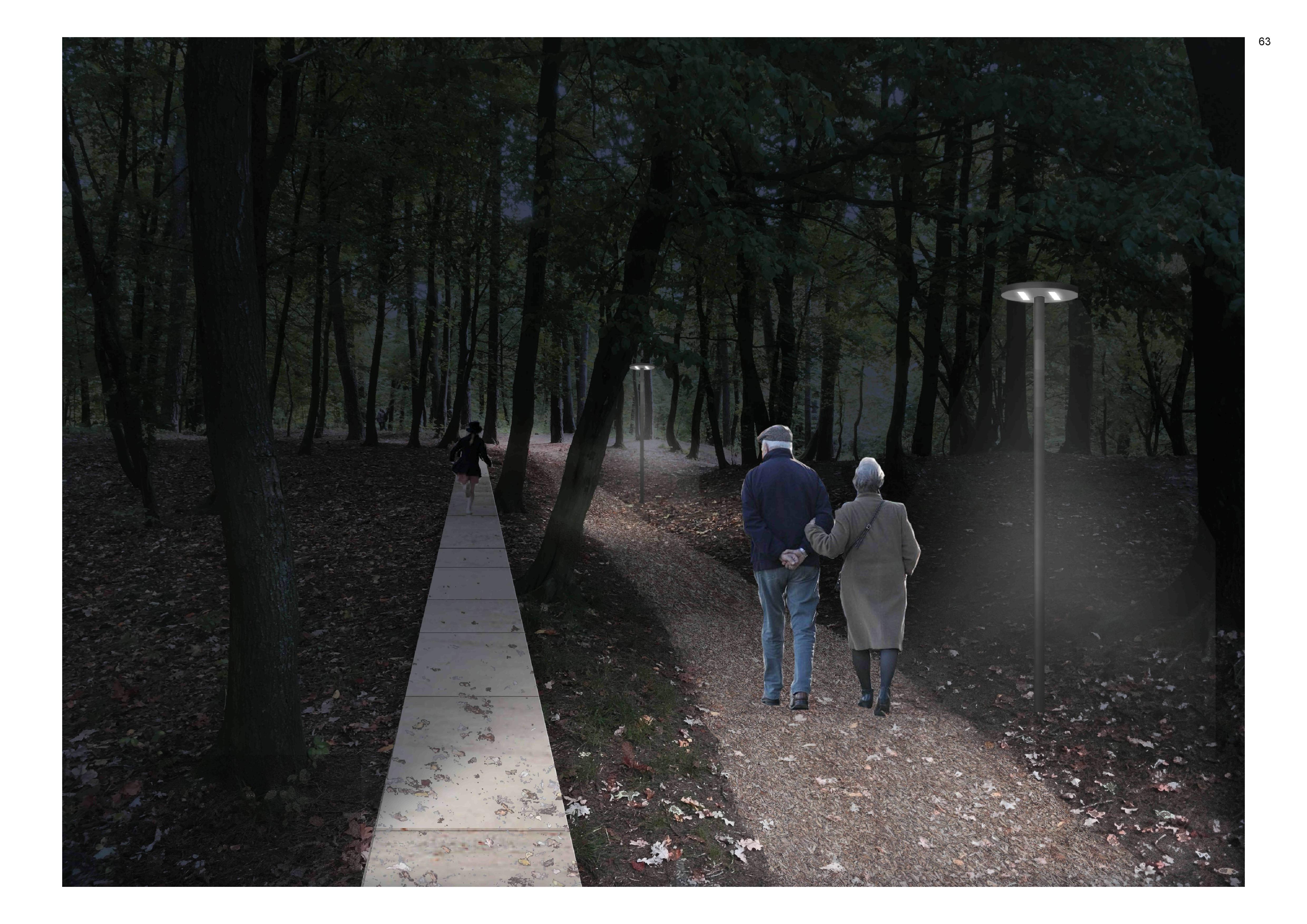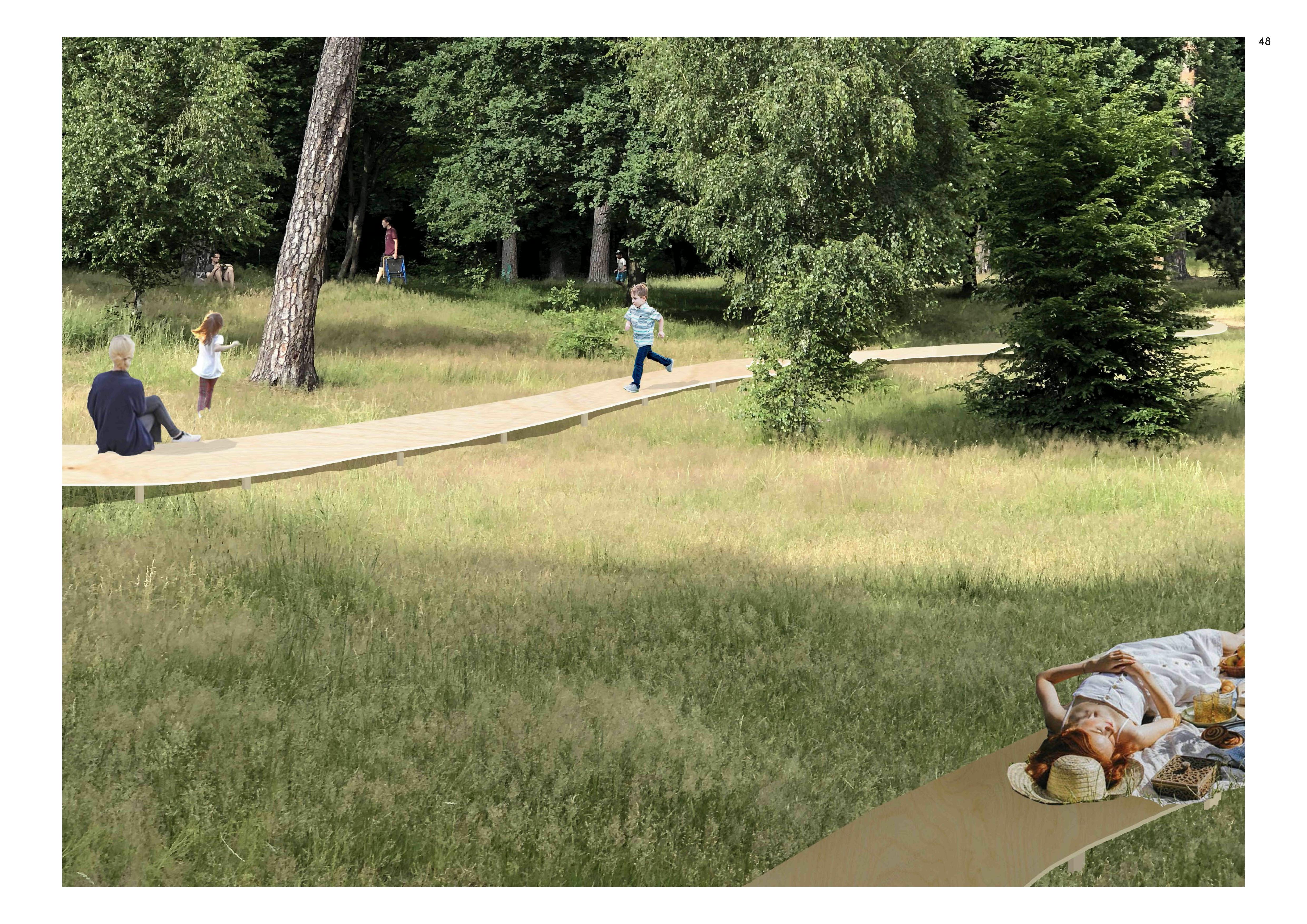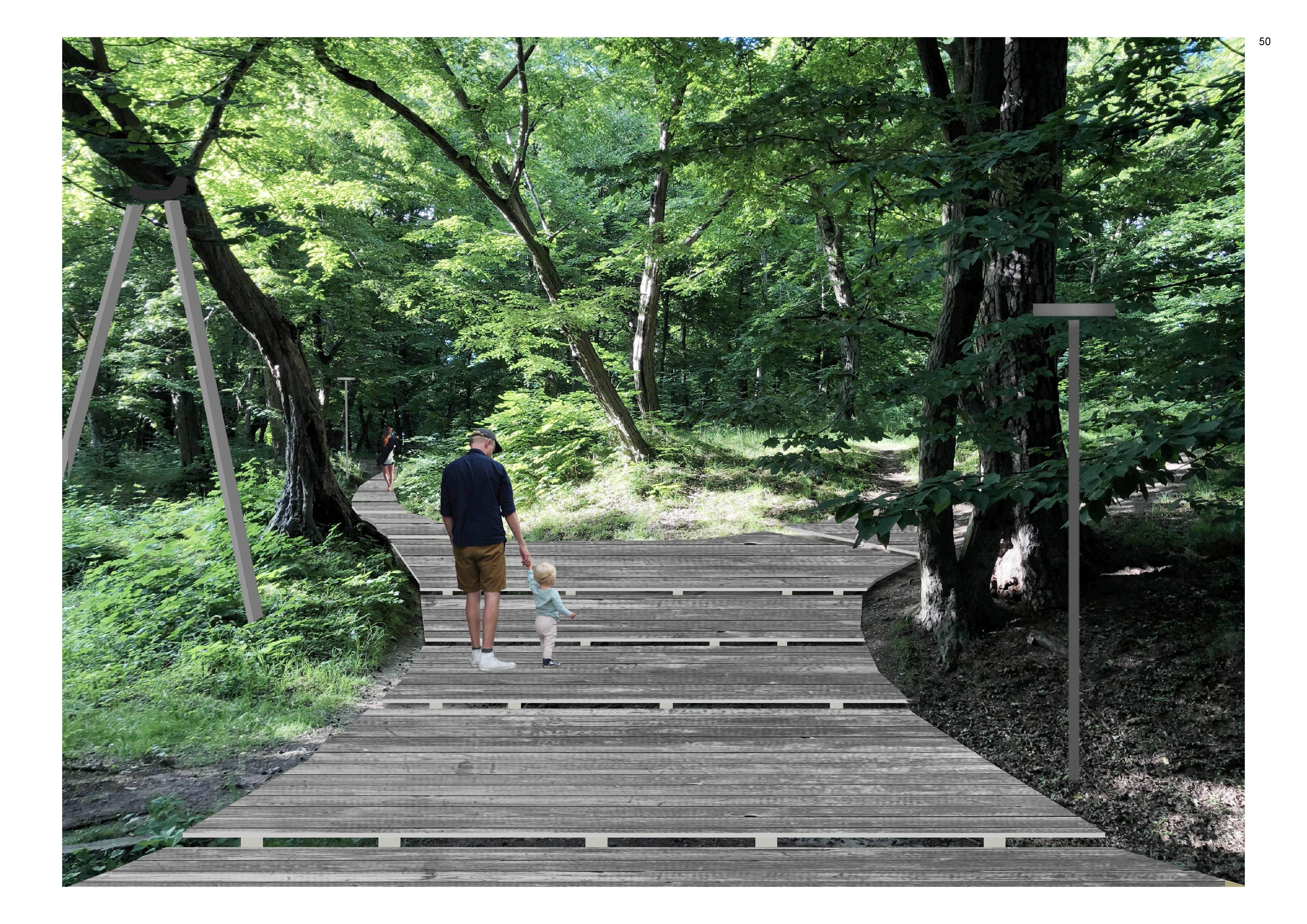 Для комфортного пребывания предусмотрено благоустройство существующей тропиночной сети – деревянные настилы, мульчирование троп и подходов к видовым точкам, освещение разных типов, мостки через ручей. Путем мягкого акцентирования внимания посетителя раскрываются неочевидные видовые точки лесопарка – можно выйти на небольшую поляну, залитую светом, или спуститься в болотистую низину по экотропе и насладиться открывающимся видом на кирху Юдиттен.
