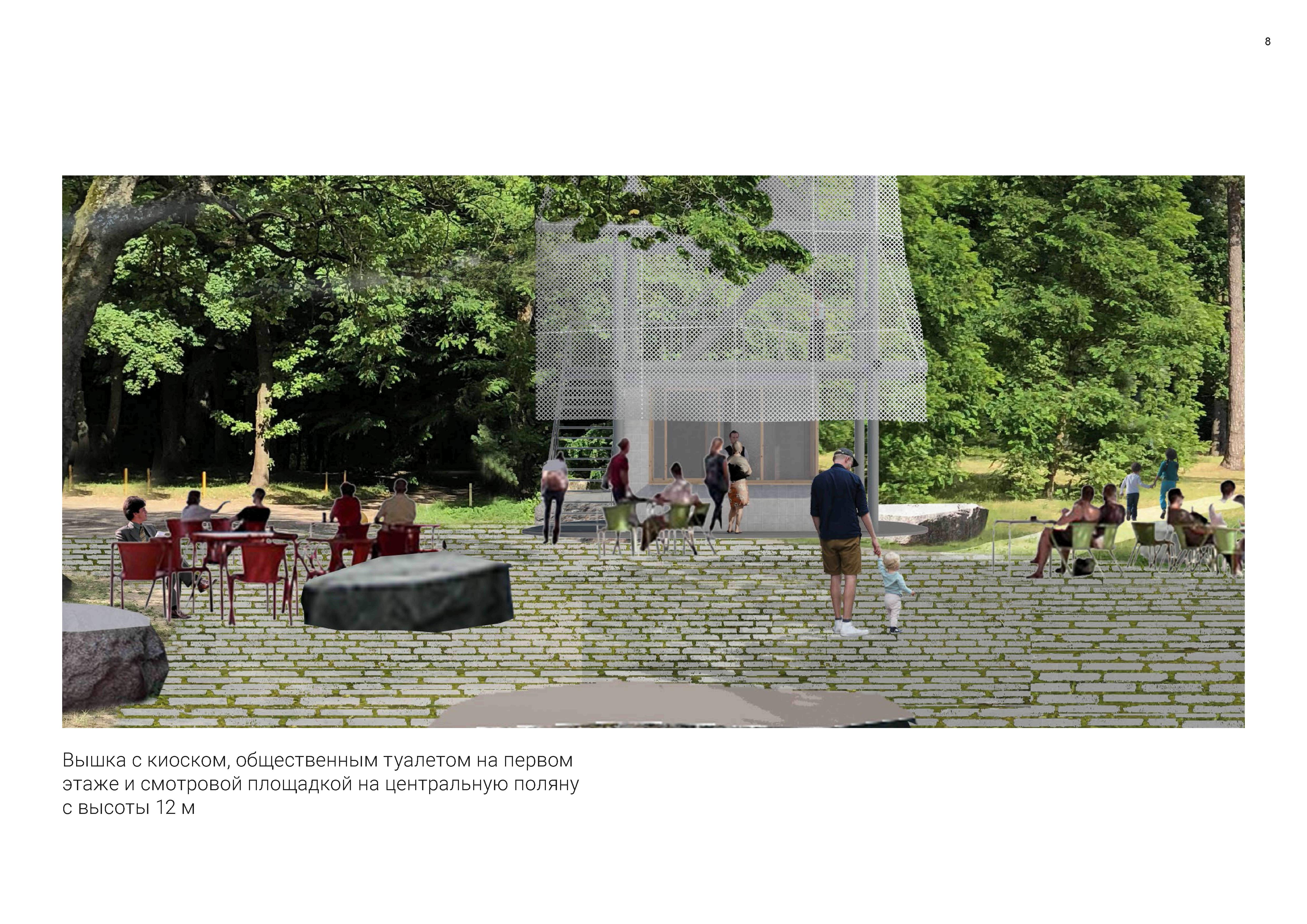 Место бывшего разворотного кольца на улице Химической воспринимается посетителями парка как главный вход в зеленую зону, потому что именно с этой точки открывается вид на украшенную высокими соснами центральную поляну. Для оформления парадного входа на территорию парка проект предлагает устроить небольшую мощеную площадь с кафе-киоском-смотровой башней, уличными столиками, декоративным освещением и, самое главное, раскрывающимся панорамным видом на парк.
