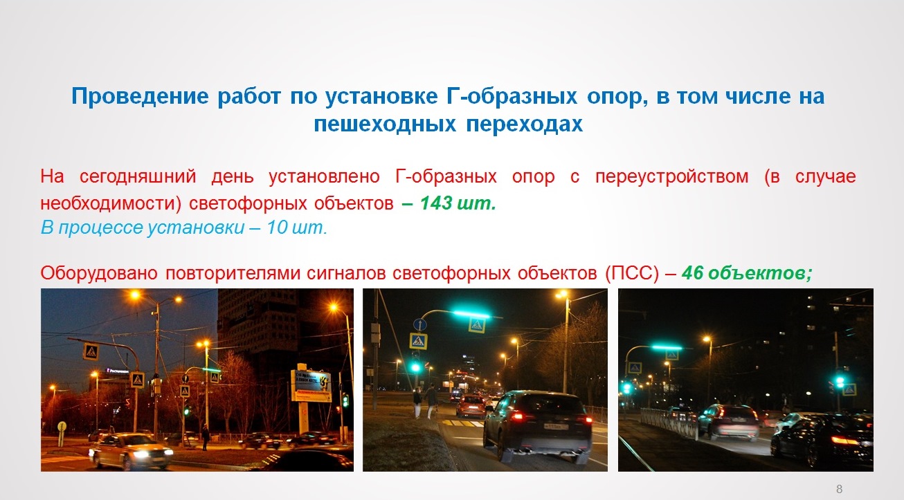 На сегодняшний день также установлено 143 Г-образные опоры с переустройством (в случае необходимости) светофорных объектов, в процессе установки – 10 опор.