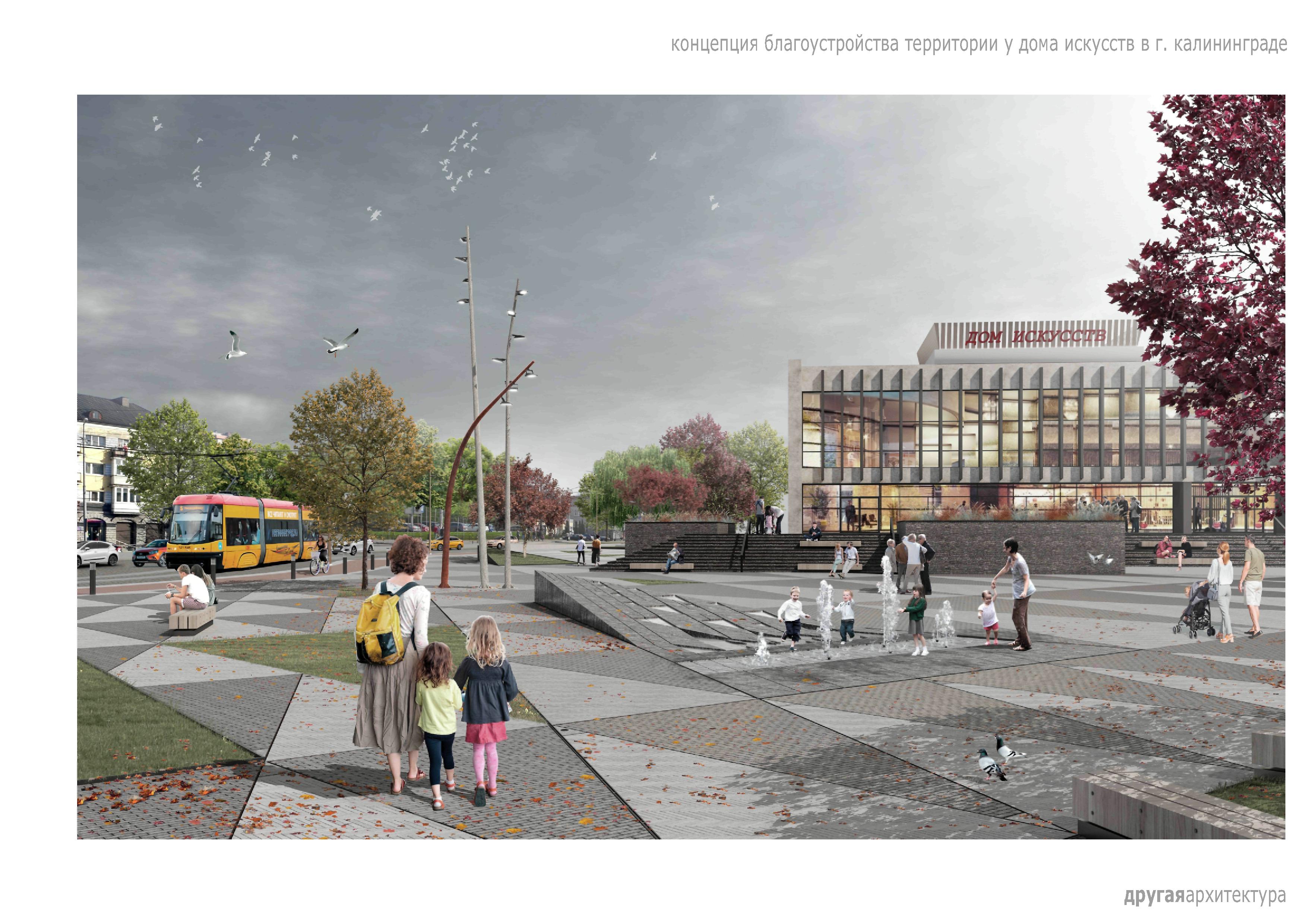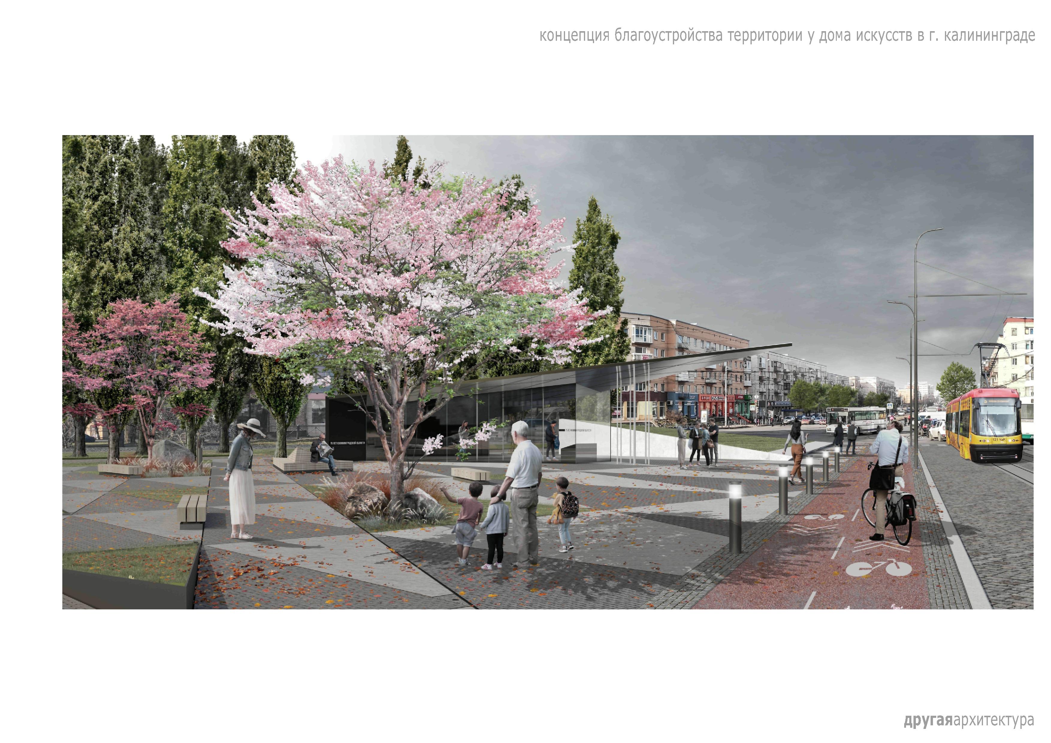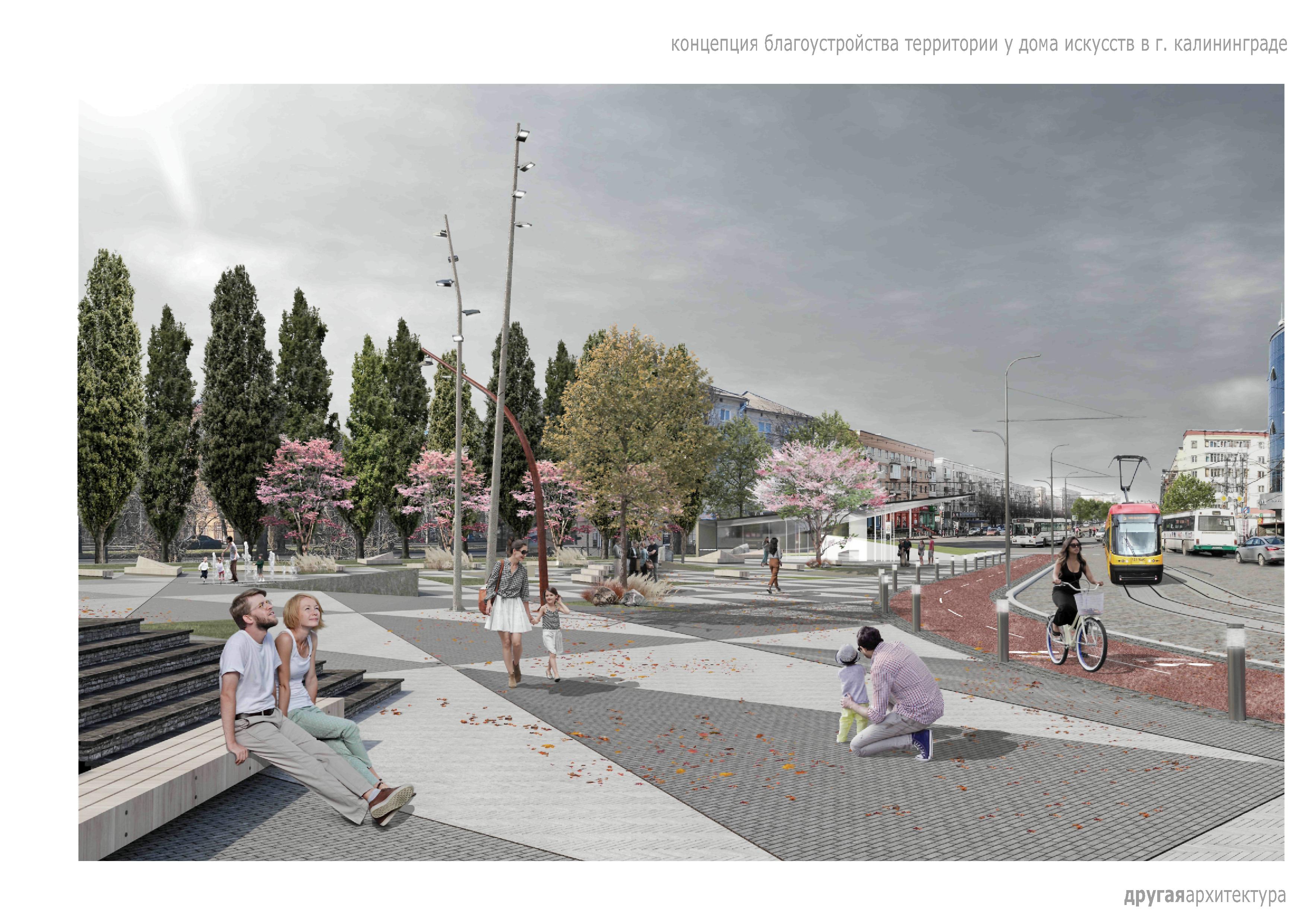 Основной целью концепции благоустройства является улучшение визуальных характеристик площади перед главным фасадом здания Дома Искусств, сделав территорию более обзорной. С площади перед главным фасадом здания убраны 5 массивных опор контактной сети с рекламой, рекламный щит. В настоящее время сквер у Дома искусств, в основном, используется в транзитных целях, при этом реальный поток даже транзитных пользователей существенно меньше потенциального. Возможности для комфортного пребывания и интересного времяпровождения в сквере, в том числе с детьми, ограничены. Стимулированию задержки посетителей на территории сквера, его насыщения смысловым и событийным контентом, повышения привлекательности места для горожан может способствовать создание нового объекта - павильона. Базовым для павильона может быть концепт открытой городской гостиной. Небольшой павильон, по внешнему виду перекликающийся с треугольной формой проектируемой территории и рядом декоративных решений, предлагается установить на оконечности сквера со стороны ул. Багратиона. Объемно-пространственная композиция состоит из зеленого откоса и конструкции навеса со встроенным стеклянным выставочным пространством. Композиция посвящена 75-летию Калининградской области, отражает историческую справку данной территории на довоенный период, туристическую информацию, а также текущие и предстоящие городские события.
