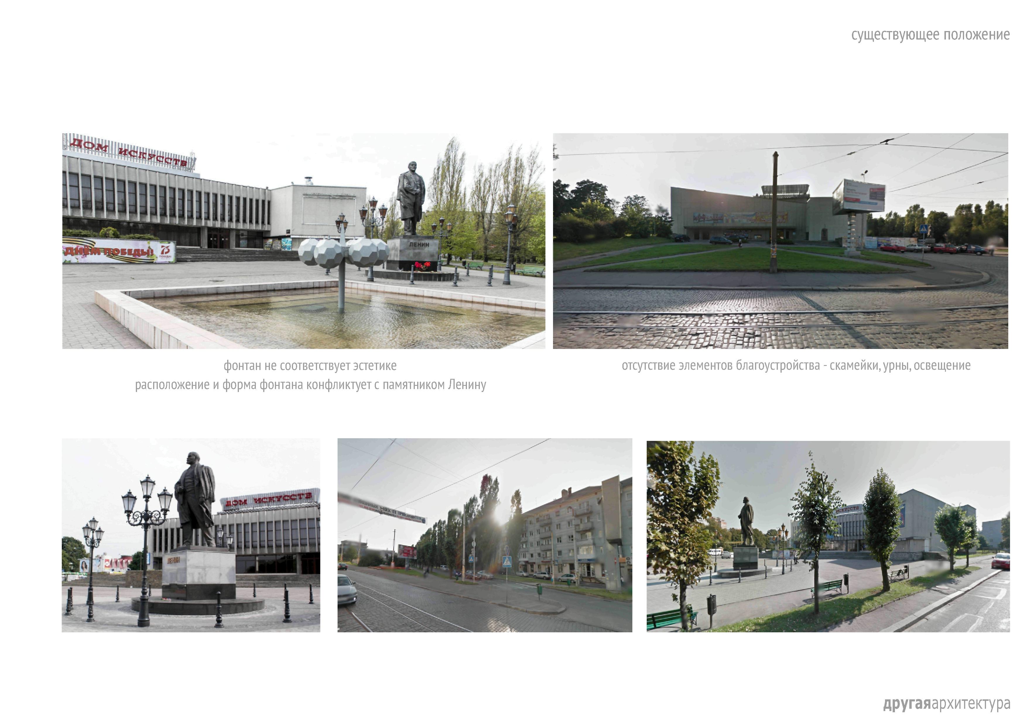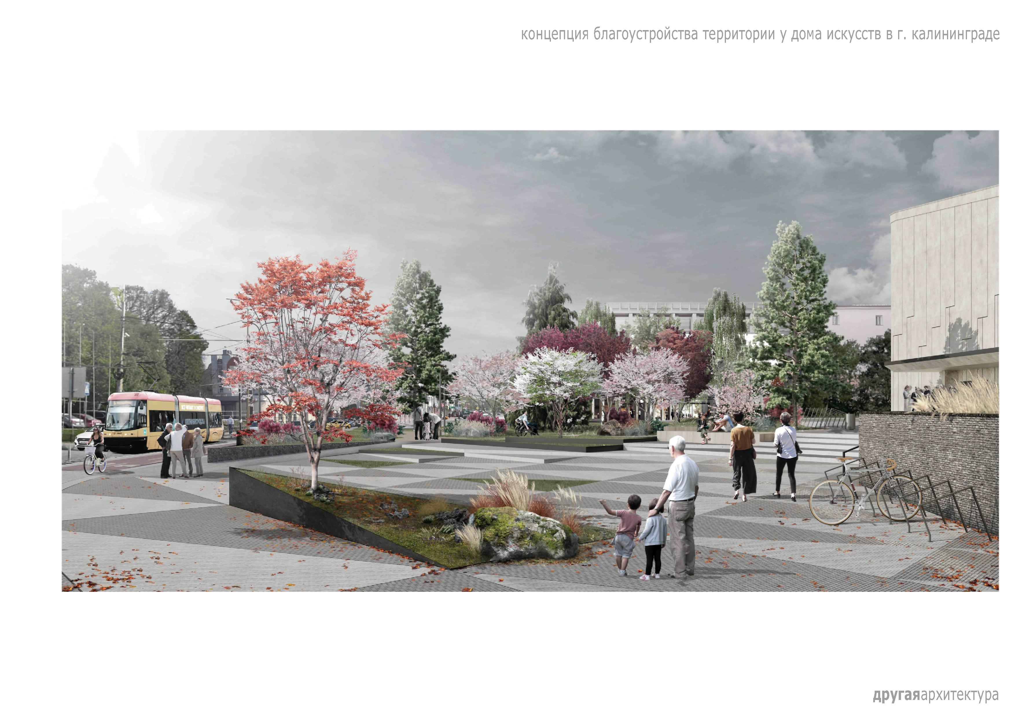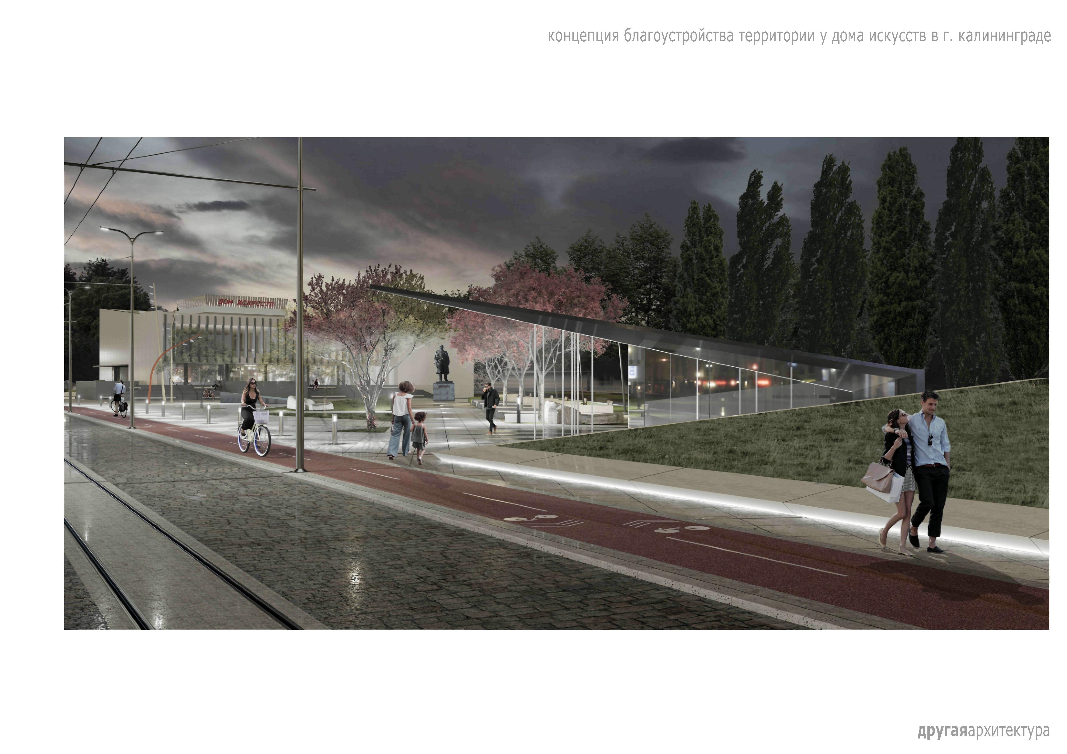 Основной целью концепции благоустройства является улучшение визуальных характеристик площади перед главным фасадом здания Дома Искусств, сделав территорию более обзорной. С площади перед главным фасадом здания убраны 5 массивных опор контактной сети с рекламой, рекламный щит. В настоящее время сквер у Дома искусств, в основном, используется в транзитных целях, при этом реальный поток даже транзитных пользователей существенно меньше потенциального. Возможности для комфортного пребывания и интересного времяпровождения в сквере, в том числе с детьми, ограничены. Стимулированию задержки посетителей на территории сквера, его насыщения смысловым и событийным контентом, повышения привлекательности места для горожан может способствовать создание нового объекта - павильона. Базовым для павильона может быть концепт открытой городской гостиной. Небольшой павильон, по внешнему виду перекликающийся с треугольной формой проектируемой территории и рядом декоративных решений, предлагается установить на оконечности сквера со стороны ул. Багратиона. Объемно-пространственная композиция состоит из зеленого откоса и конструкции навеса со встроенным стеклянным выставочным пространством. Композиция посвящена 75-летию Калининградской области, отражает историческую справку данной территории на довоенный период, туристическую информацию, а также текущие и предстоящие городские события.