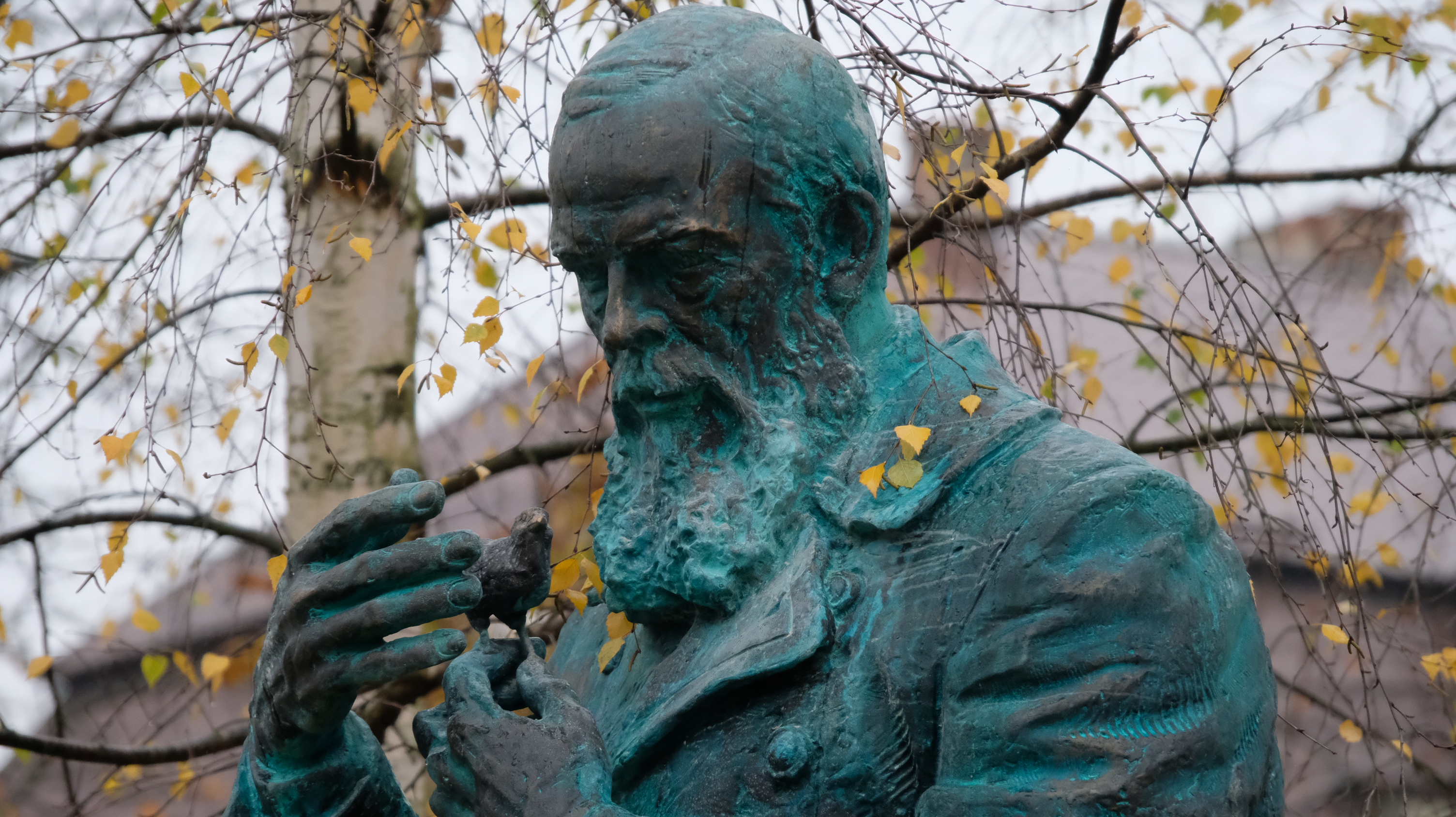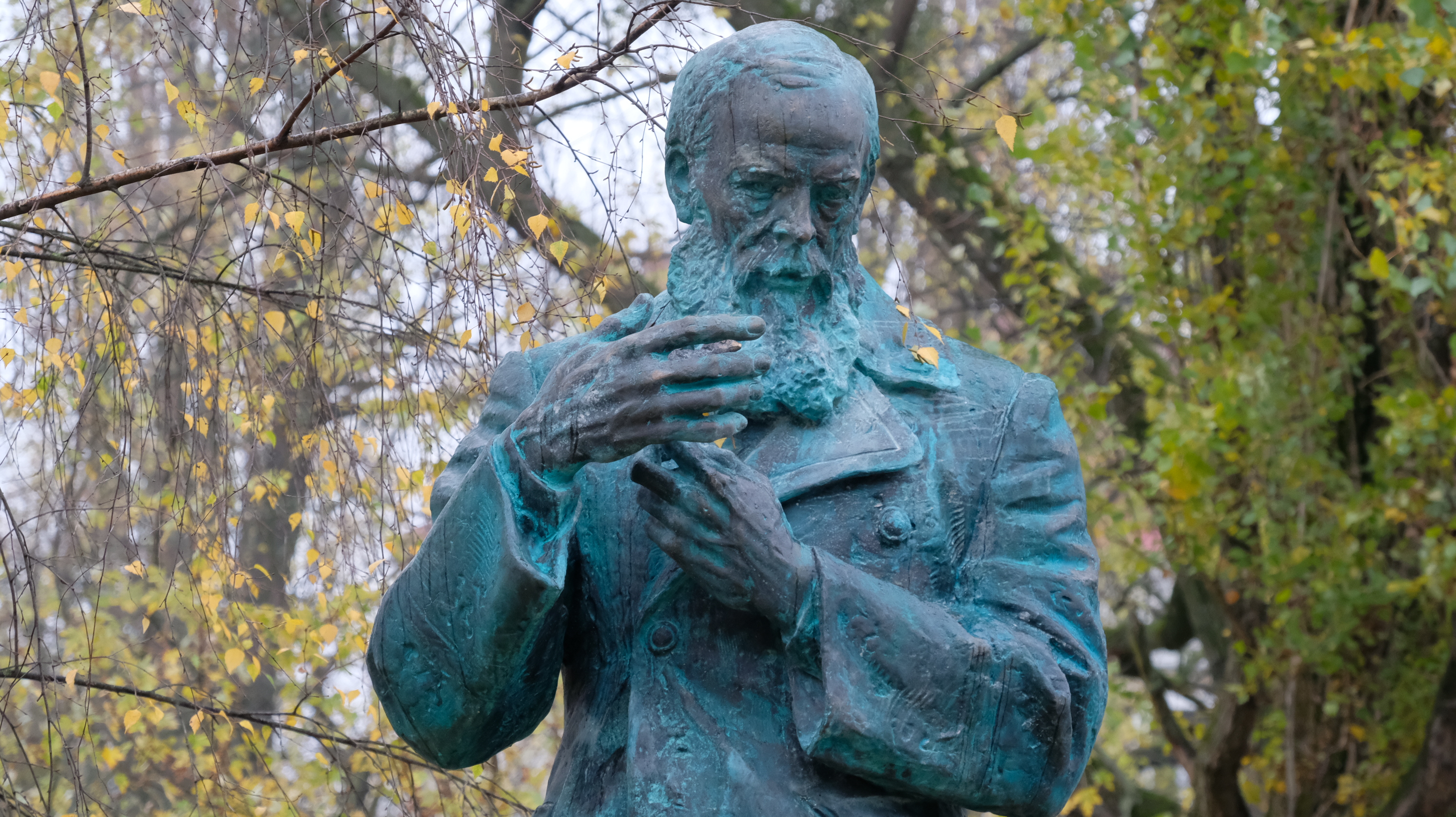Воробей в руках писателя – отсылка к заключительной главе последнего произведения великого классика - «Братья Карамазовы», в которой описаны похороны Илюши Снегирёва и его предсмертная просьба «покрошить на могилке корочку хлебца, чтобы воробушки прилетали».