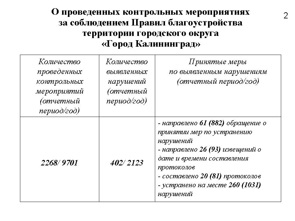 За отчетный период с 11 сентября по 11 ноября проведено 2268 мероприятий по контролю за соблюдением Правил благоустройства. За санитарным состоянием контейнерных площадок проведено 2137 мероприятий. По контролю за санитарным состоянием скверов и зеленых зон - 159 мероприятий. По контролю за санитарным состоянием придомовых территорий - 289 мероприятий.