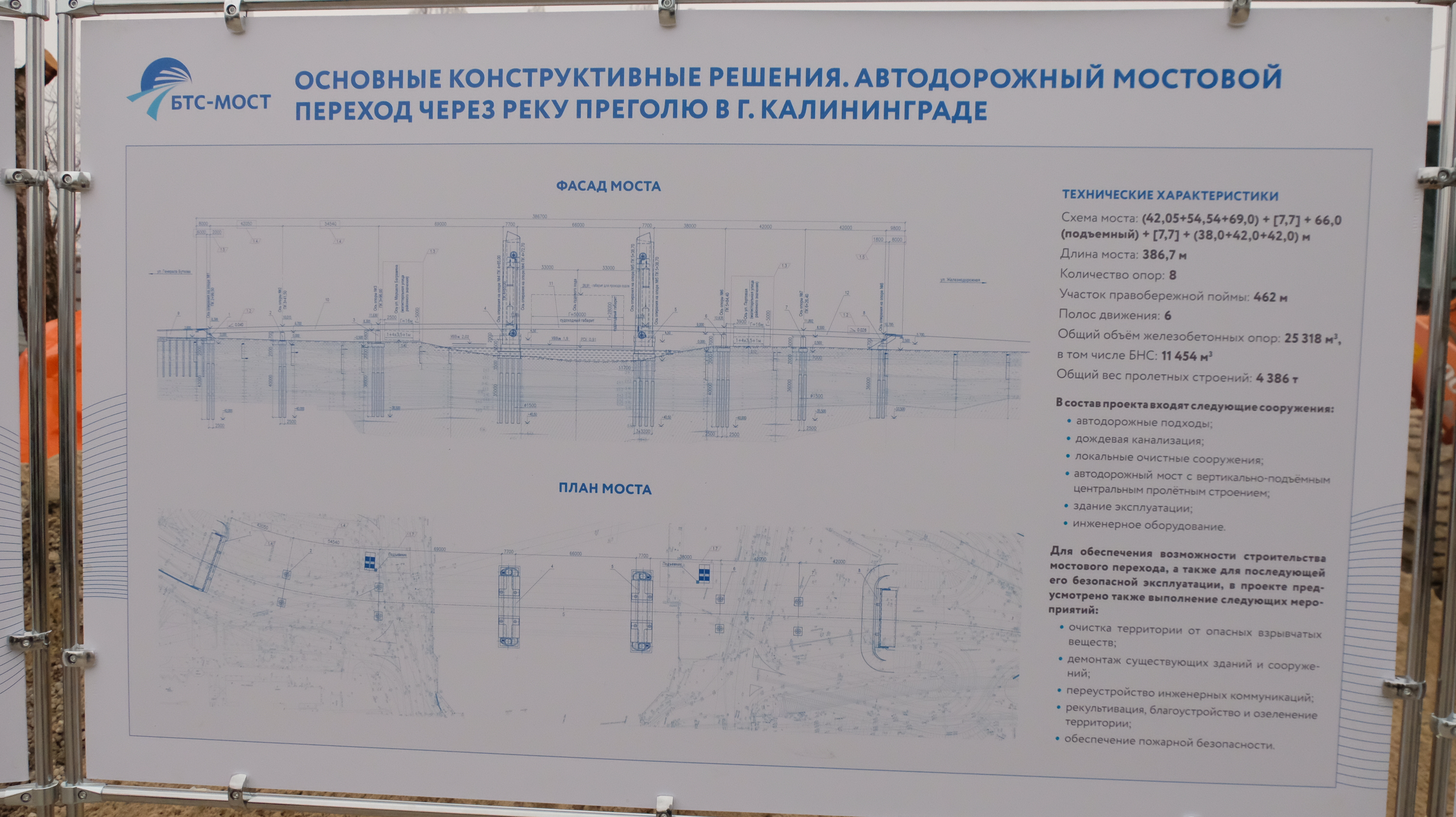 Разводной автодорожный мост предусмотрен с вертикально-подъемным центральным пролётным строением длиной 66,0 м. Пролётные строения моста цельнометаллические с ортотропной плитой проезжей части и сталежелезобетонные. Опоры моста монолитные железобетонные. Фундаменты опор запроектированы на буровых сваях. Русловые опоры № 4, № 5 имеют железобетонные башни для подъёма пролётного строения (тело опоры служит основанием для железобетонной башни). Внутри башен находятся механизмы, служащие для подъёма пролётного строения, а также лестничные и технологические проходы для их обслуживания. Управление механизмами ведётся оператором с пульта управления. Пульт управления расположен в здании управления автодорожным мостом на берегу.
