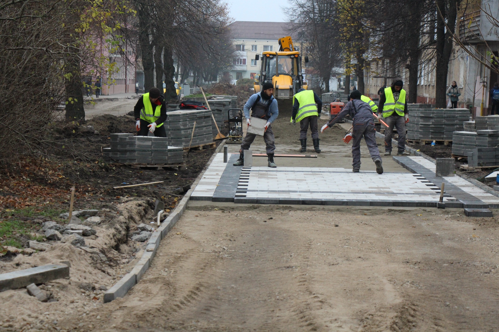 На участке от Киевской до Книжной дорожные работы идут параллельно с ремонтом сквера и пешеходной зоны. Здесь также выкладывают плиткой тротуар и готовят основание под асфальтобетонное покрытие расширенной проезжей части.