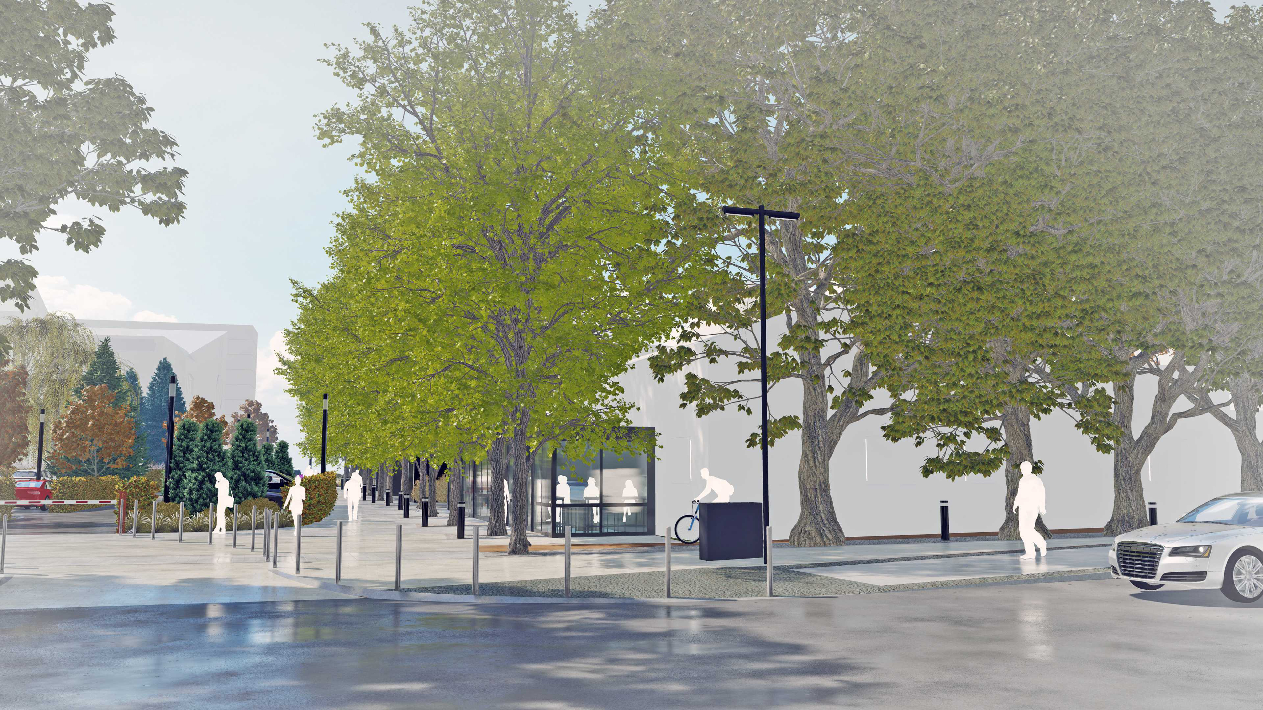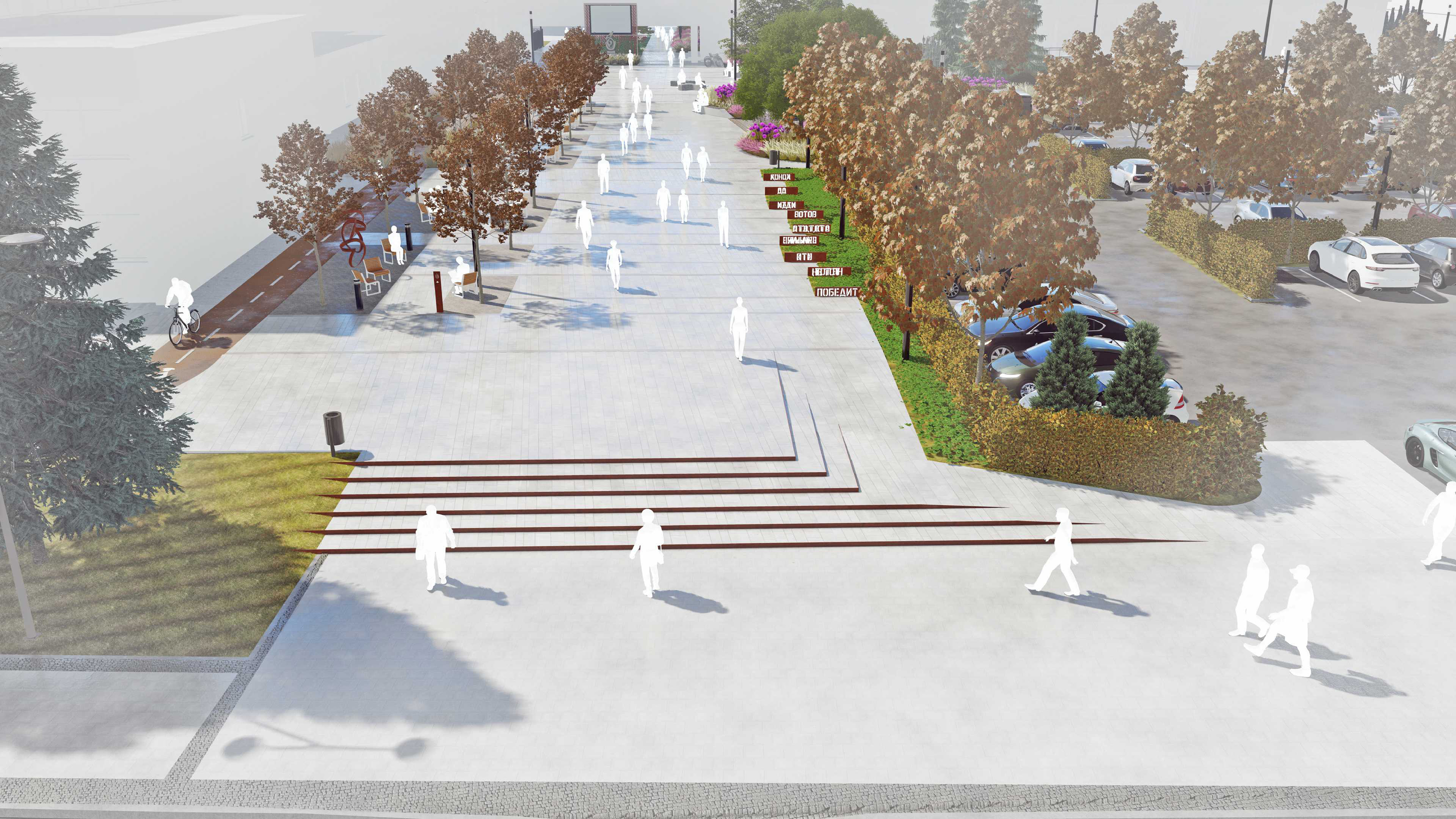 Проектом предусмотрено устройство необходимых для МГН элементов среды, таких как нормативные пандусы, тактильная плитка на необходимых участках, устройство пониженных бордюров, в местах перепада рельефа пешеходные пути не превышают нормативных 5% продольного уклона, минимальная ширина тротуаров рассчитана на возможность разъехаться двум колясочникам без промежуточных площадок и составляет в минимальных значениях 1800 мм.