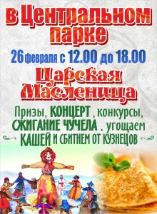 Бурным весельем и широким народным гулянием встретим первый праздник весны – «Масленицу» в Центральном парке культуры и отдыха 26 февраля.