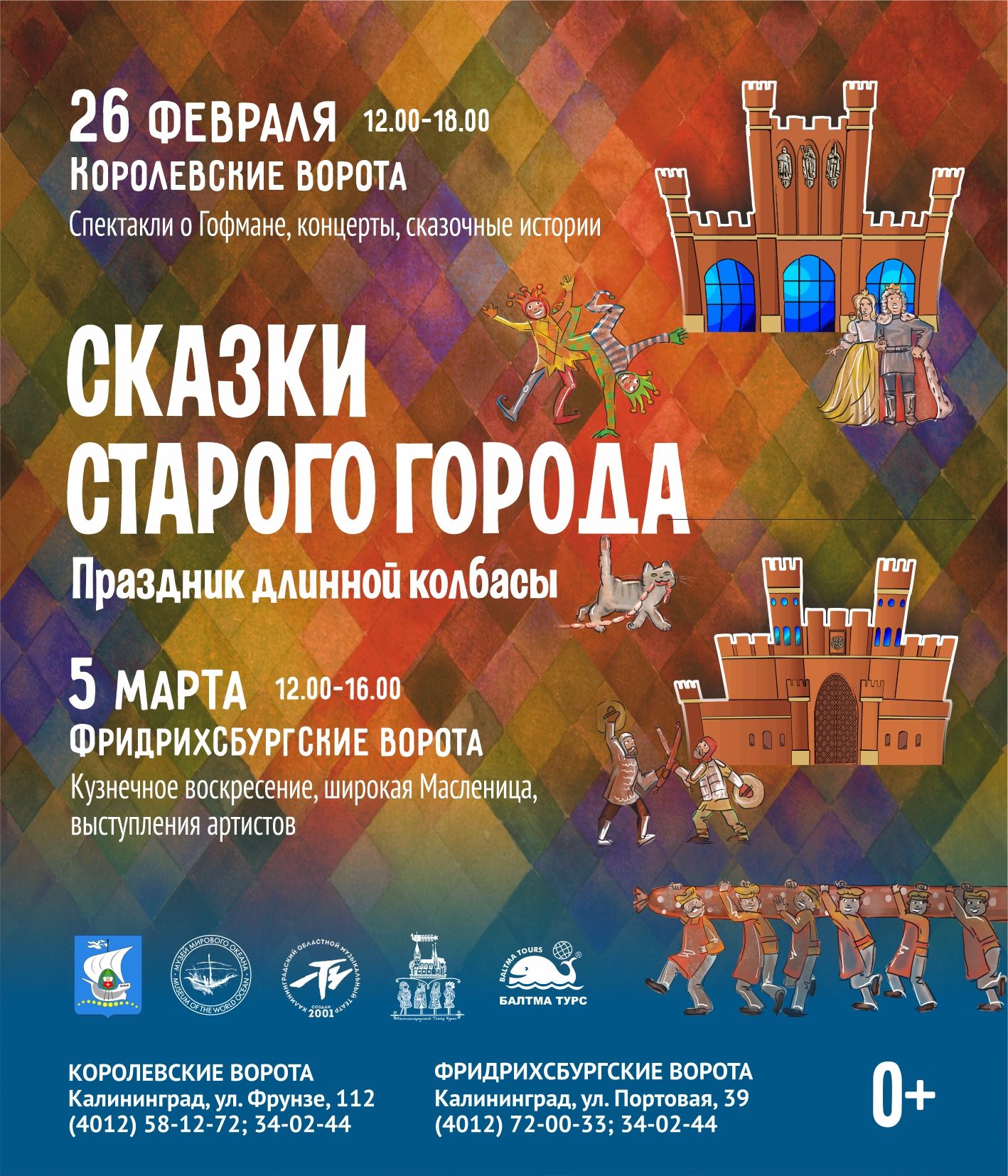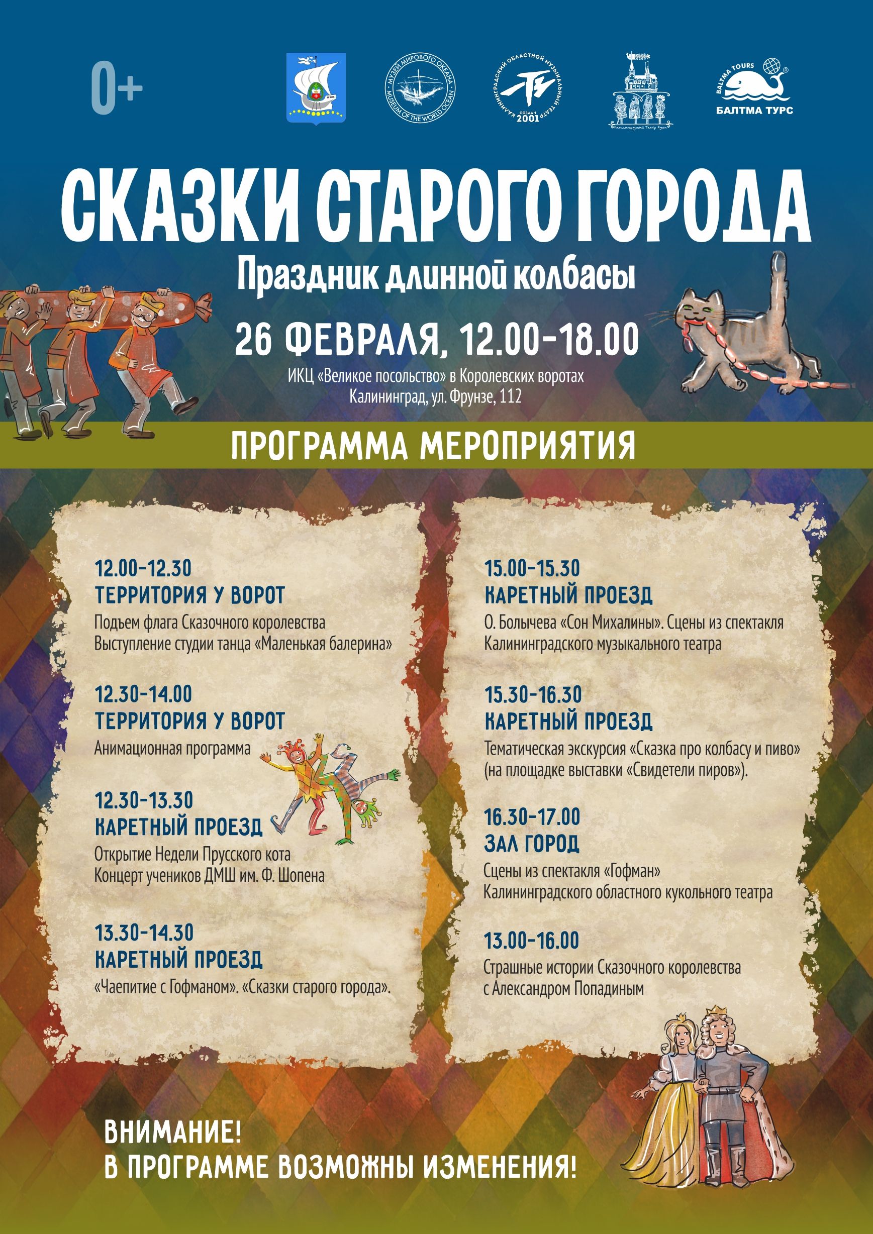 Жители и гости города приглашаются отведать самых вкусных сказок и приключений. Полюбившийся многим праздник «Сказки старого города, или Праздник длинной колбасы» снова позовет всех под знамена Сказочного королевства на территории двух ворот - объектов Музея Мирового океана.