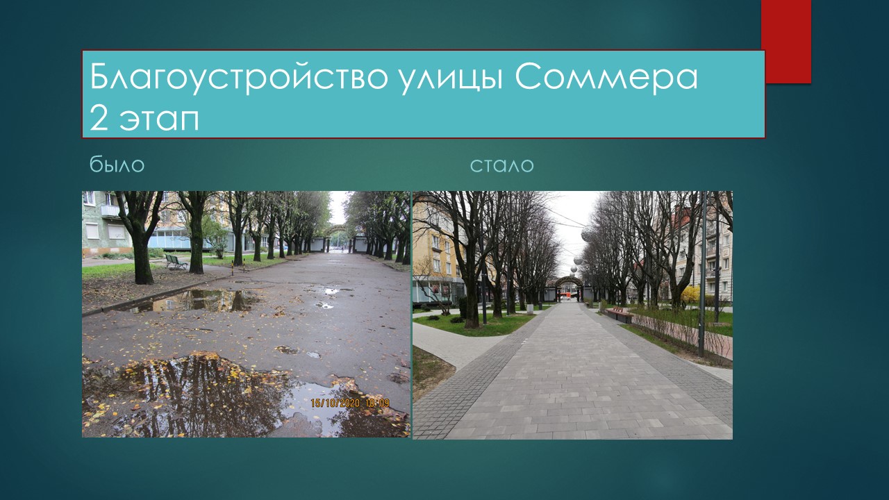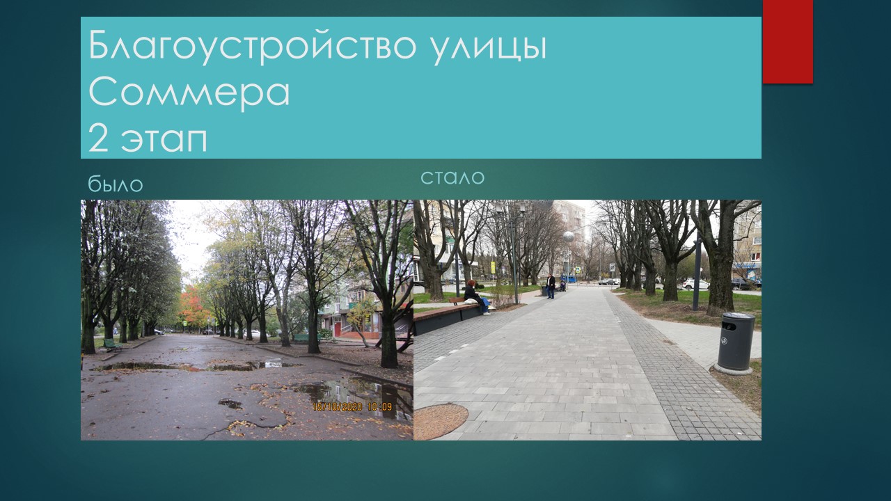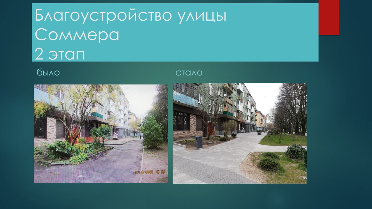 В рамках проекта благоустройства второй очереди выполнено замощение пешеходной зоны, обустройство велосипедной дорожки из тротуарной плитки, освещение и видеонаблюдение. На объекте установили пять опор уличного освещения, шесть опор видеонаблюдения, девятнадцать грунтовых светильников и сорок восемь светильников в брусчатке. Установили на пешеходной зоне семь велосипедных парковок, двенадцать скамеек и столько же урн. В ходе озеленения посеяли газон, высадили двести восемьдесят кизильников и пять остролистных кленов. Кроме того, по дополнительному контракту на Генерала Соммера выполнили декоративное освещение.
