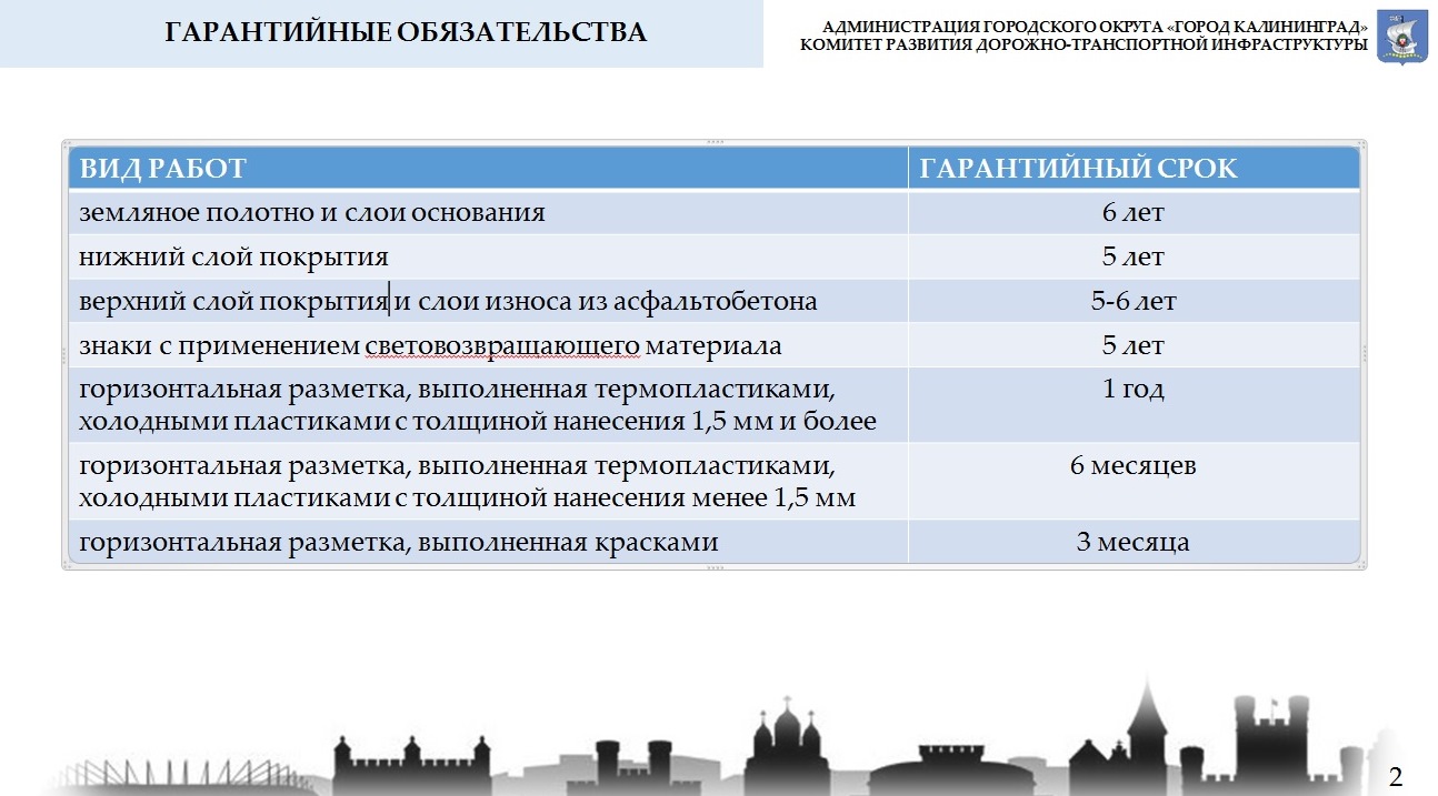 Гарантийные сроки устанавливаются с даты подписания итогового акта о приемке выполненных работ и составляют для разных видов работ от шести лет для земляного полотна и слоев основания дорожной одежды при капитальном ремонте, строительстве и реконструкции до трёх месяцев для горизонтальной разметки, выполненной красками.