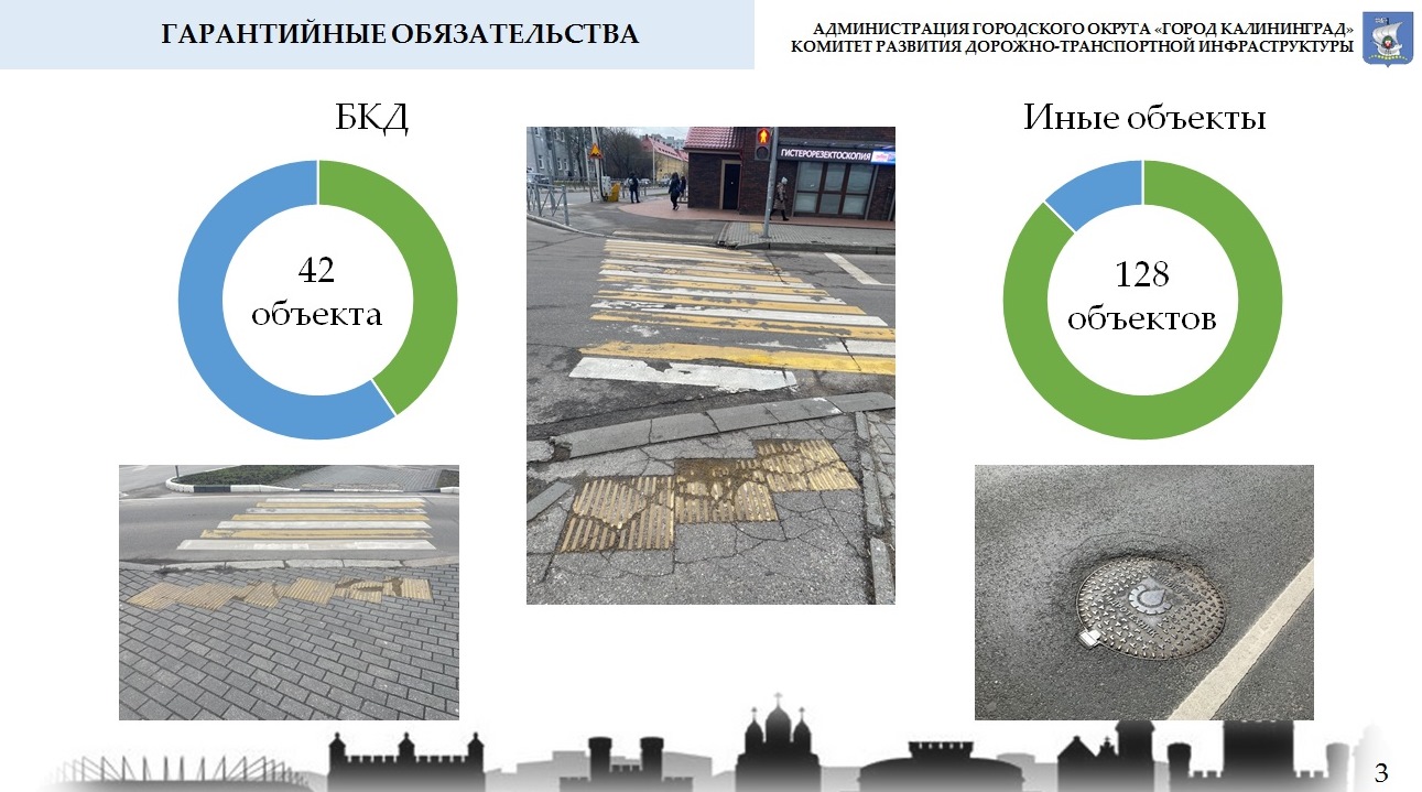 По объектам БКД: из 42 объектов замечания выявлены на 27 объектах (разрушения тактильной плитки, трещины, ямочность, раскрытие швов).