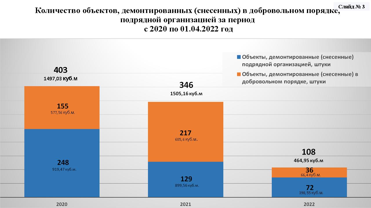 Общий объем объектов, демонтированных (снесенных) подрядной организацией составил 899,56 куб.м. Основной акцент комитет старается делать на понуждение владельцев к добровольному демонтажу (сносу) объектов. В этом случае территория освобождается от незаконных объектов без траты денежных средств из бюджета. Такая позиция приносит результат. Так количество объектов, демонтированных (снесенных) в добровольном порядке, составило 217, что на 62 (29%) больше чем в предыдущем году. Из расчета средней стоимости одного кубического метра 1674,7 рублей (по итогам заключенных муниципальных контрактов), экономия городского бюджета составила 1014,2 тыс. рублей.