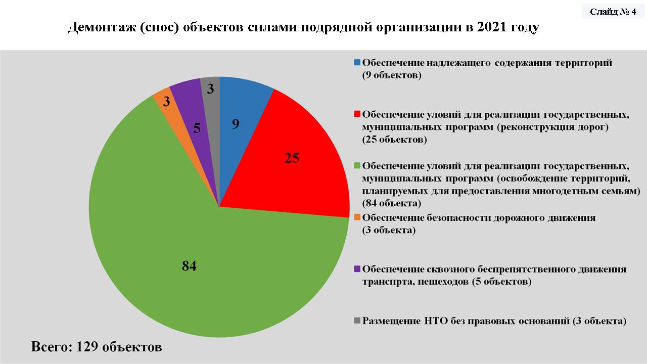 В перечне объектов, подлежащих сносу, по состоянию на 01.01.2021 числилось 2369 объектов. В 2021 году выявлено 833 объекта (в 2020 году — 804), в том числе: 437 ограждений, 396 строений. Объекты выявлены в ходе проведения контрольных мероприятий в рамках осуществления муниципального земельного контроля, муниципального контроля за обеспечением сохранности автомобильных дорог общего пользования местного значения, муниципального контроля за исполнением муниципальных правовых актов по вопросам местного значения в области торговой деятельности, осмотров, обследований некапитальных строений, сооружений. Каждый третий объект выявлен по итогам контрольных мероприятий.