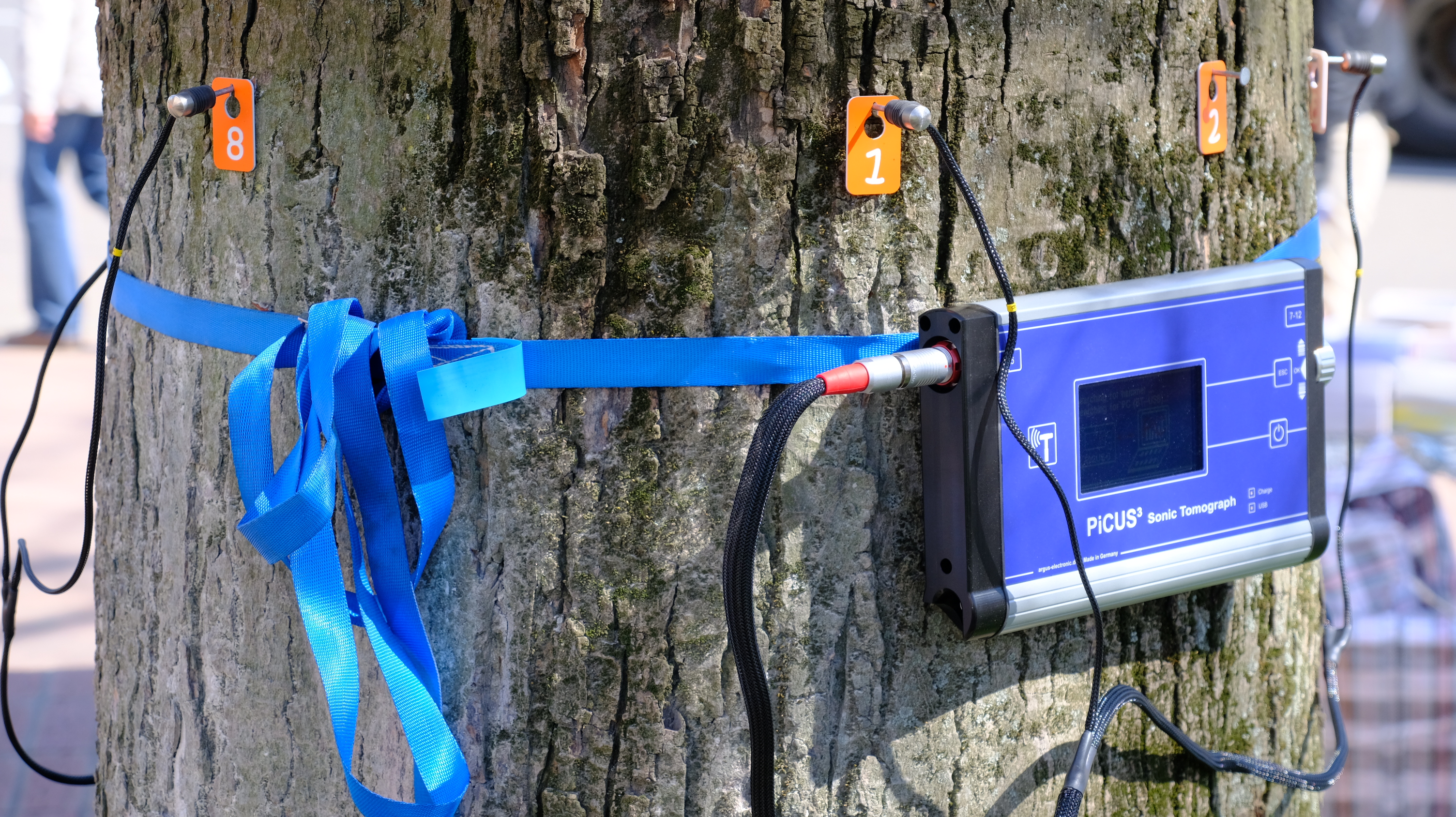 Оборудование необходимо для выявления невидимых глазу очагов гнили, трещин и пустот. Специалисты измеряют ствол с помощью мерной электронной вилки и проводят сканирование. По тому как через ствол проходит звуковой сингал определяют качество древесины. Томограф дает схему, где цветом показаны места очагов гнили, из чего специалист может сделать вывод насколько поражено дерево.