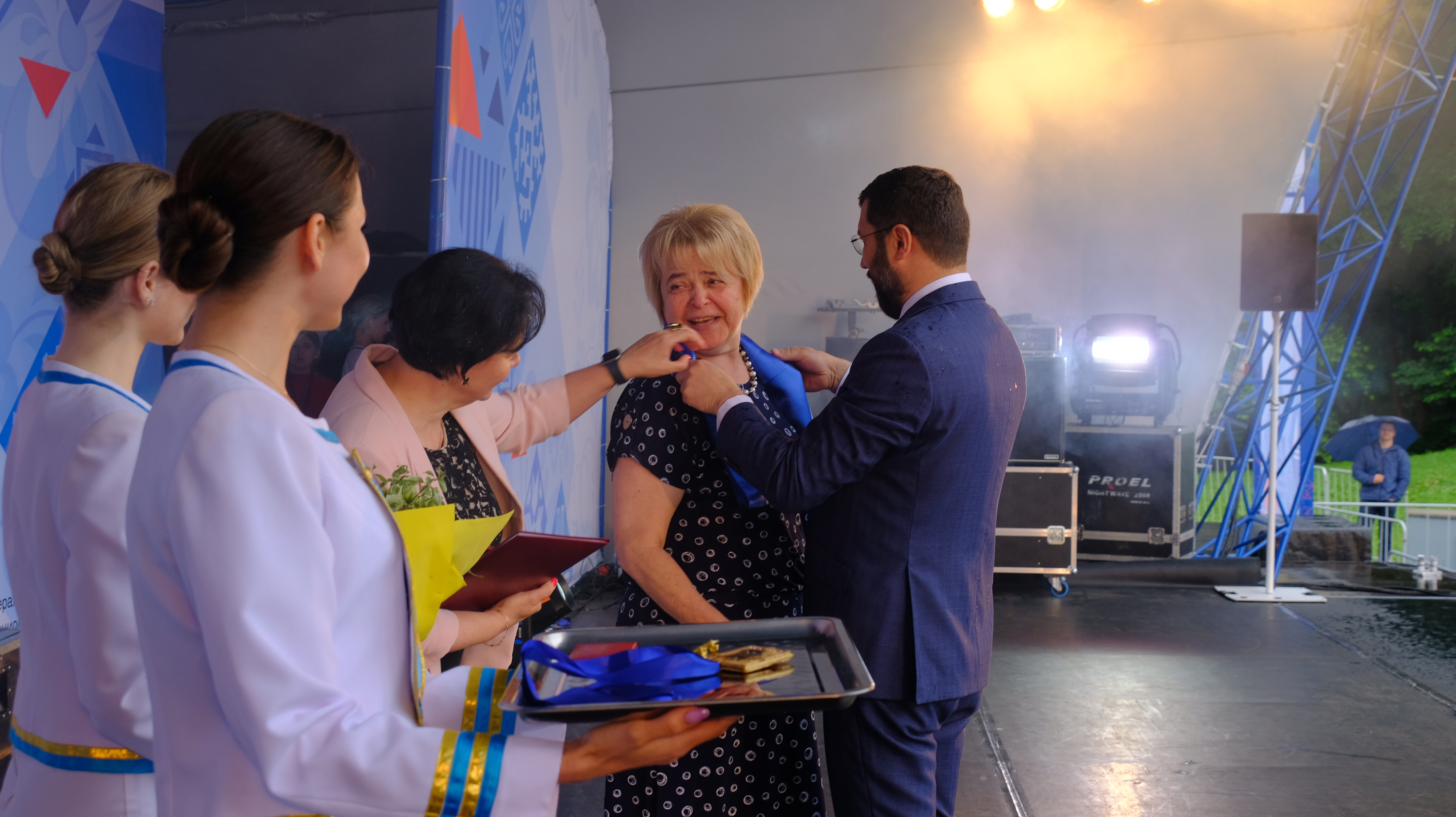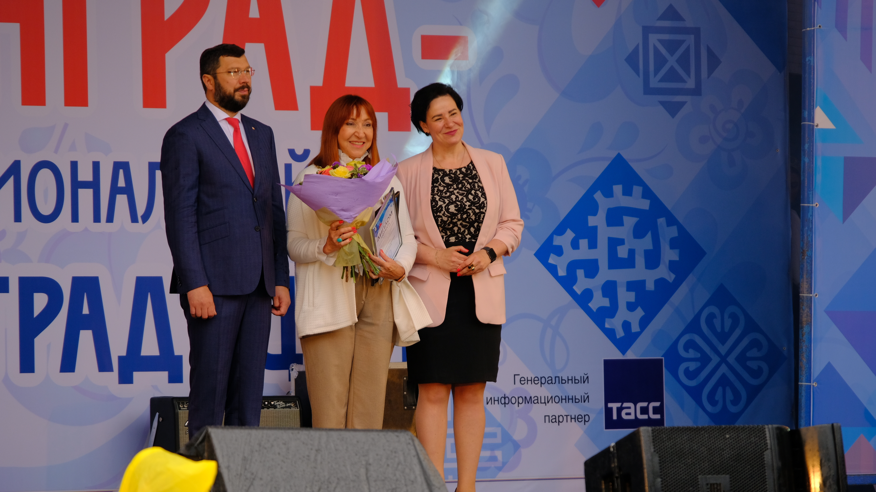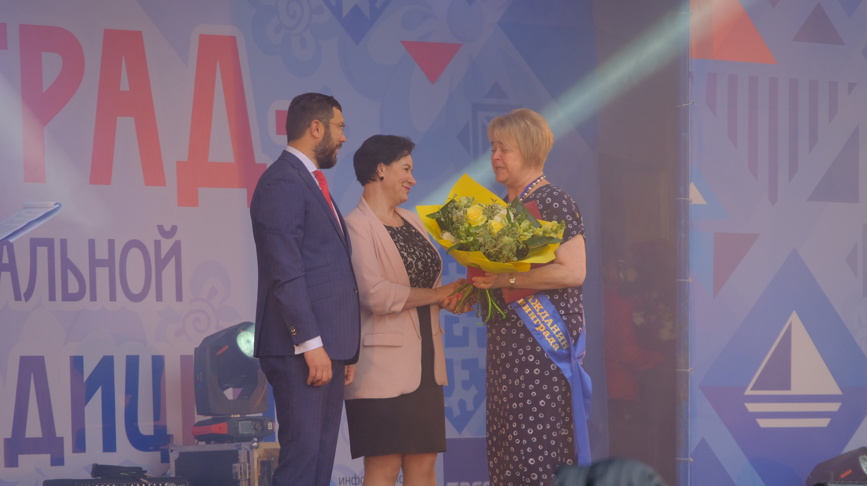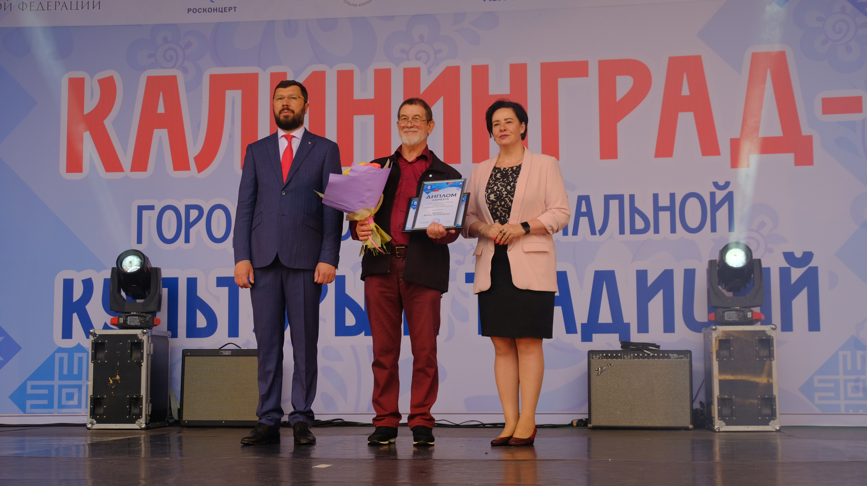 На сцене в парке Центральном Евгений Любивый и Елена Дятлова поздравили горожан с Днём рождения Калининграда, поблагодарили за творческий активный труд, благодаря которому город с каждым днём становится всё более красивым и комфортным.