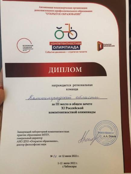 Обучающиеся школ Калининграда в составе региональной команды заняли третье место в заключительном (всероссийском) этапе ХI Российской компетентностной олимпиады.