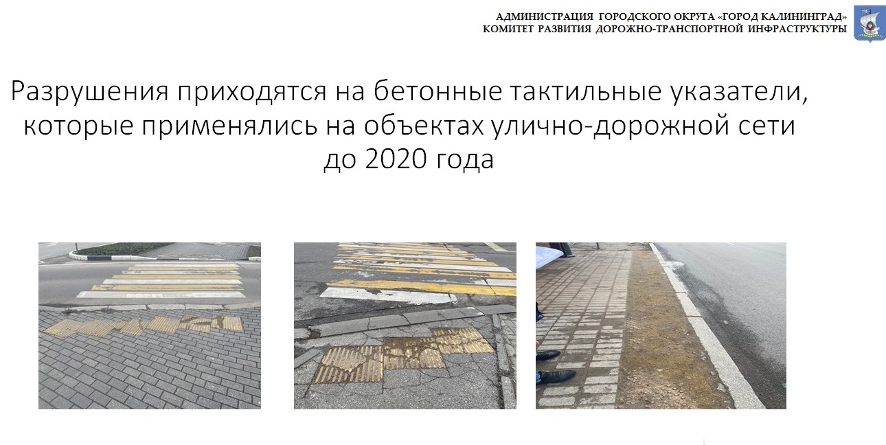 В начале текущего года было проведено комиссионное обследование объектов улично-дорожной сети Калининград, и подсчитано, что требуется заменить 3343 тактильных указателя на 74 улицах. Под гарантийные обязательства попадали разрушения 1144 плиток на 28 улицах.