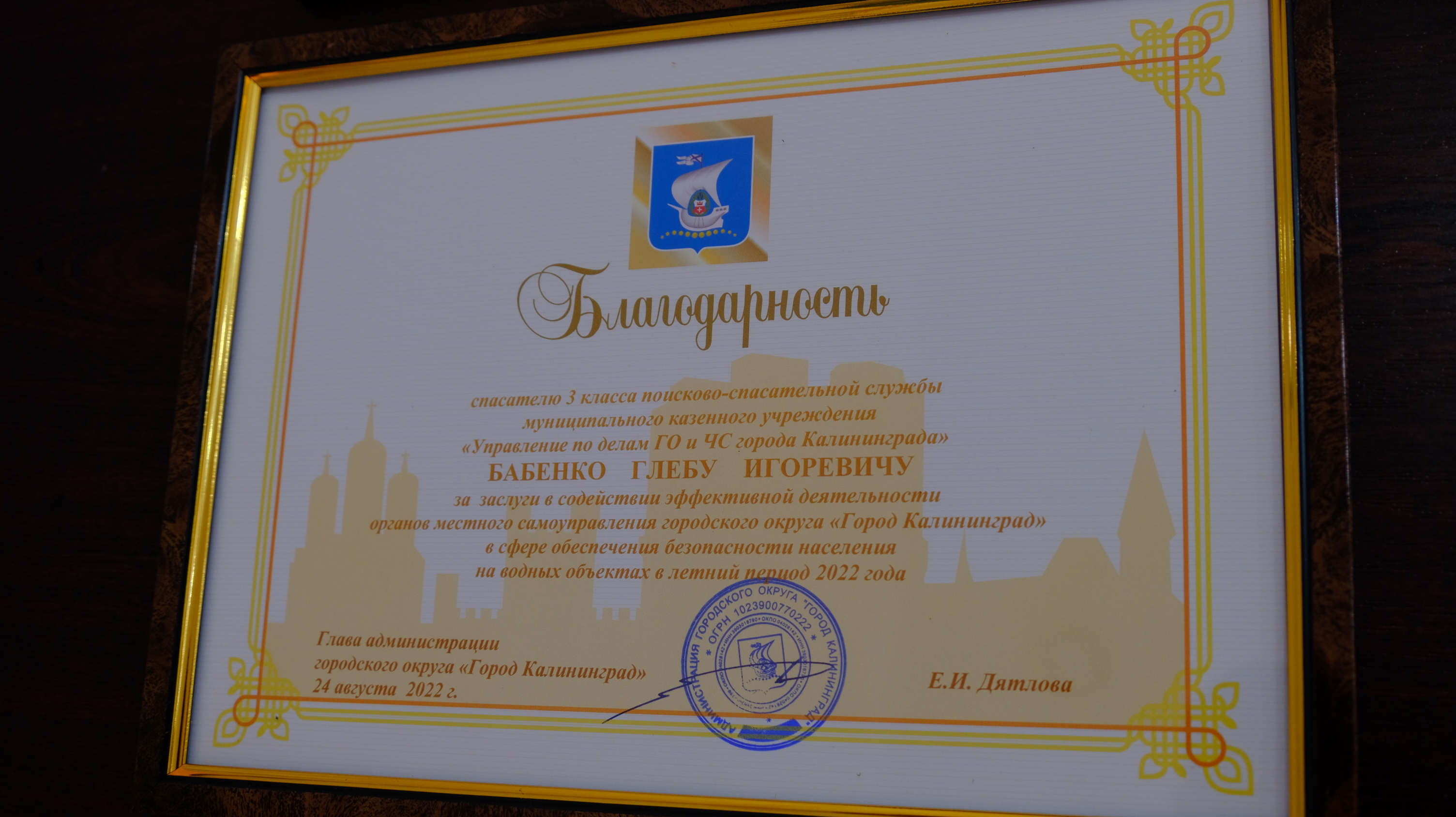“Не важно, как был спасён человек: вытаскивали ли его из воды на лодке, подхватывали ли детей, упавших в воду с матраса, или выскользнувших из надувных кругов, или же вплавь добирались до тонущего человека и транспортировали его на берег без использования плавсредств. В любом случае важен результат - спасённая человеческая жизнь. Главное, что спасатель вовремя увидел тонущего и не мешкая принял меры к его спасению. Не каждый способен на это”, - сказал директор МКУ “Управление по делам ГО и ЧС Калининграда” Яков Филатов.