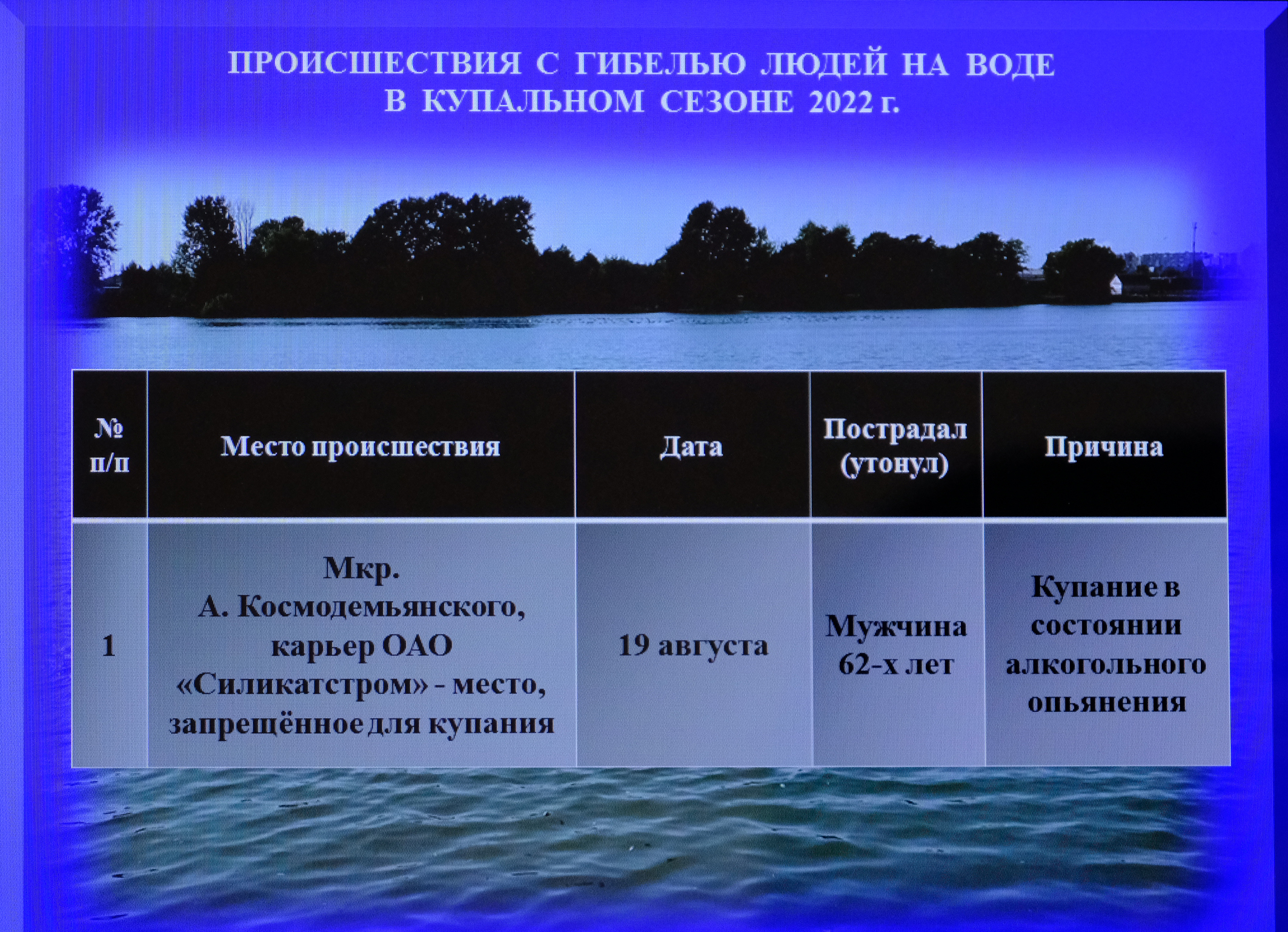 К сожалению, одна смерть в городе всё-таки была зафиксирована. 19 августа на карьере ОАО “Силикатстром” утонул 62-летний мужчина, который полез в воду в запрещённом для купания месте, при этом находившись в состоянии алкогольного опьянения.