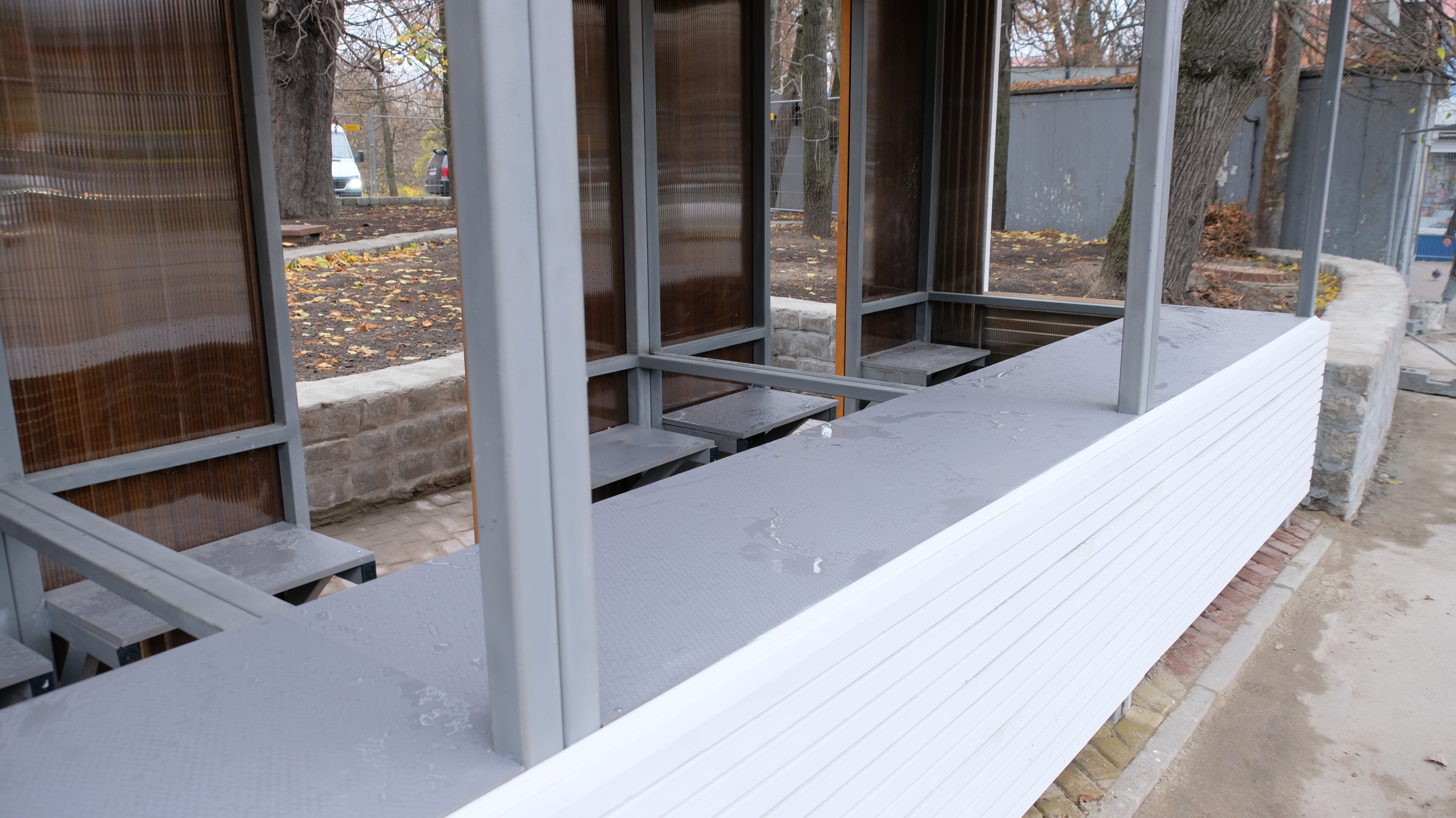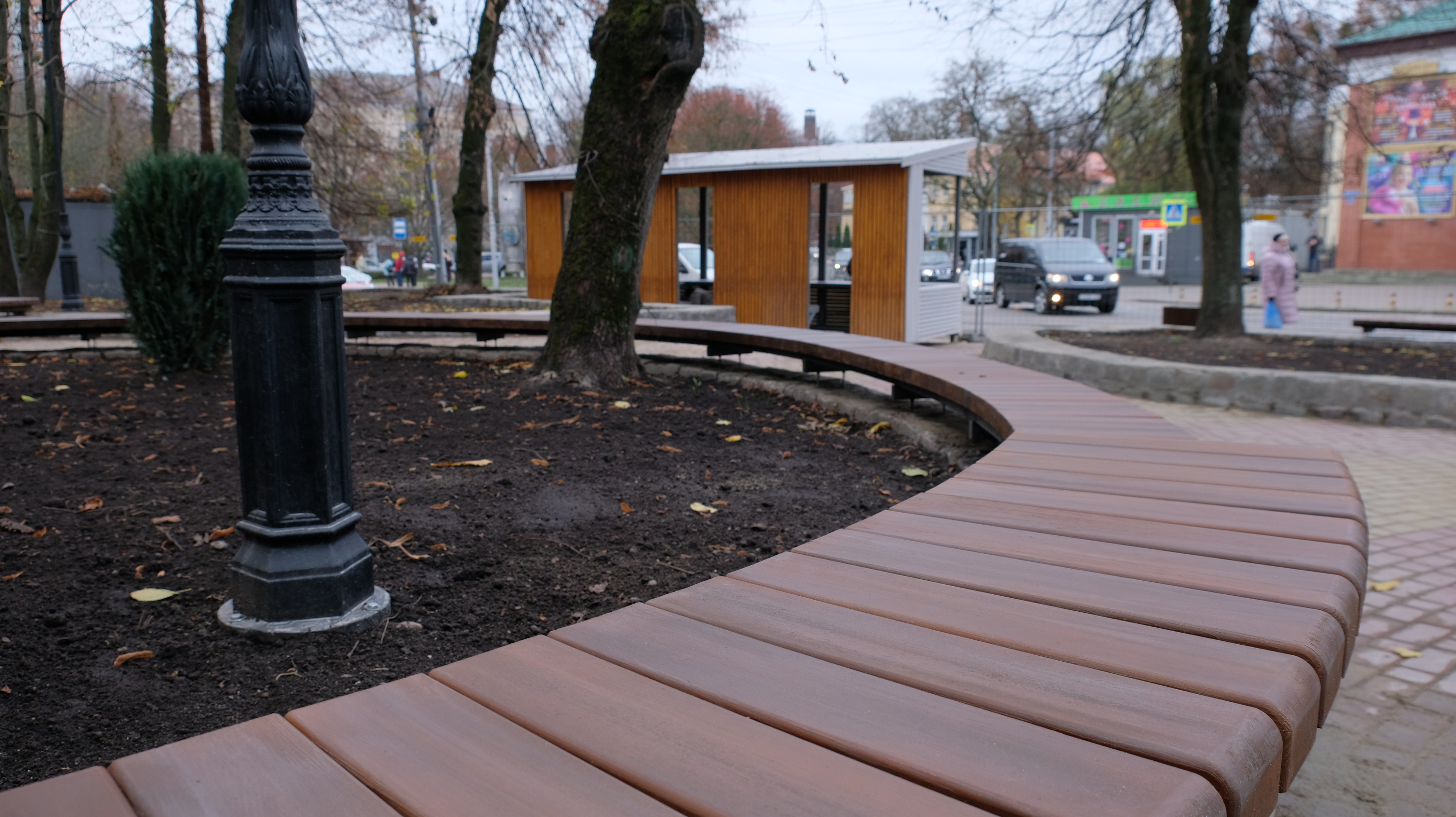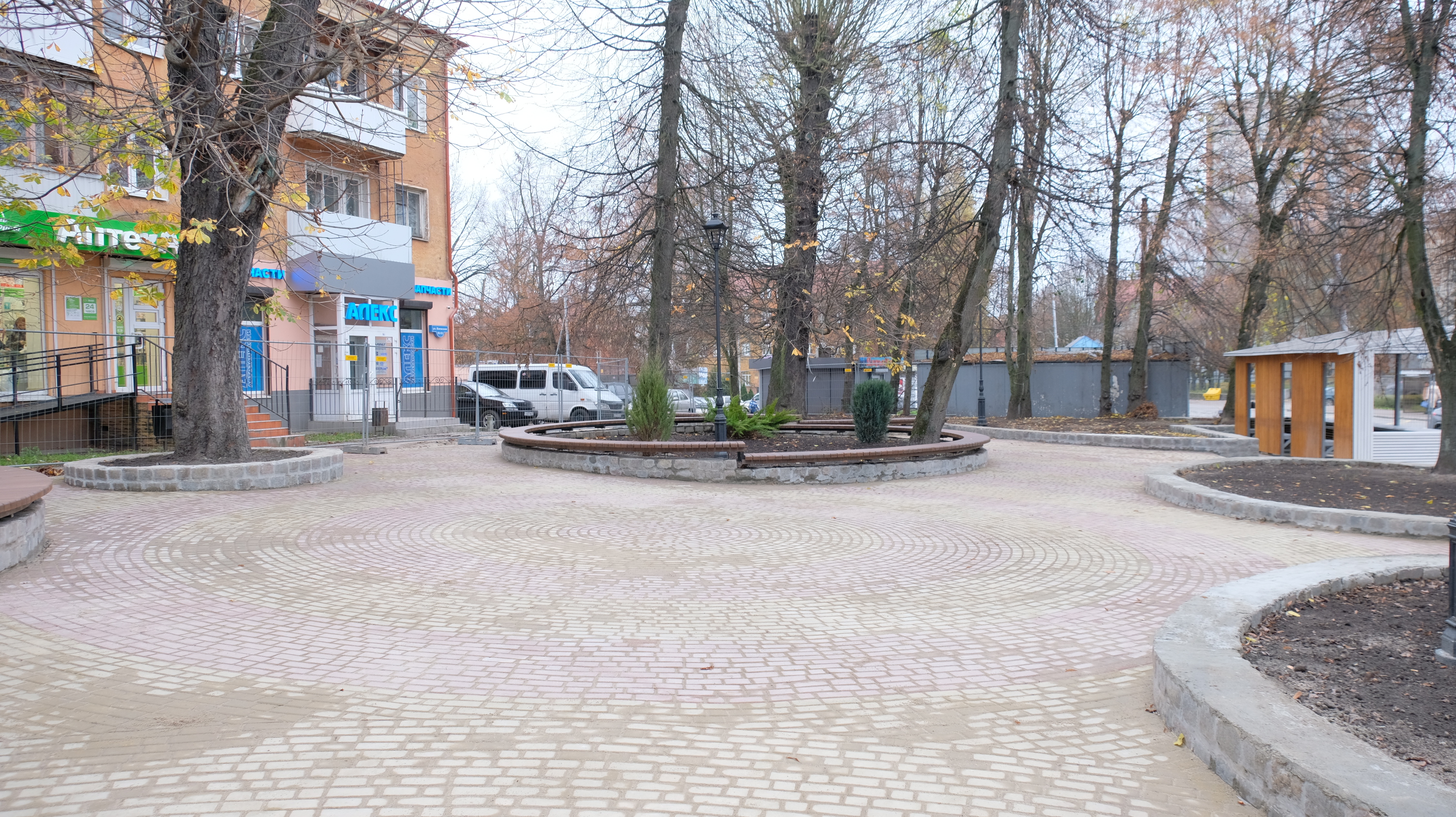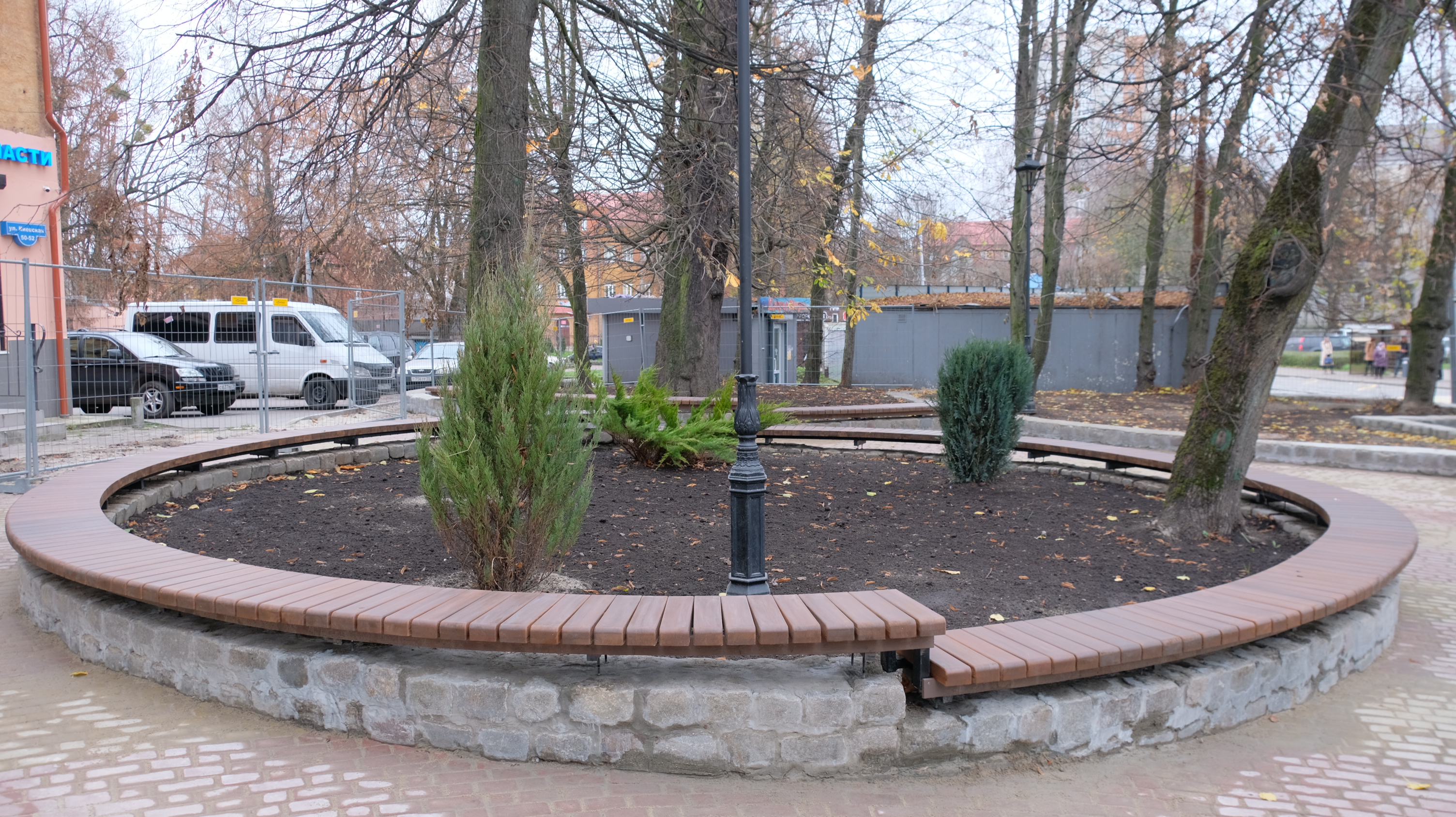 Напротив развлекательного комплекса «Киноленд» подрядчик благоустраивает сквер и устанавливает торговый навес. Выполнено замощение пешеходных дорожек, обустройство подпорных стен с устройством скамеек на них, посадка зеленых насаждений и установка опор освещения. Полностью работы будут завершены 21 ноября.