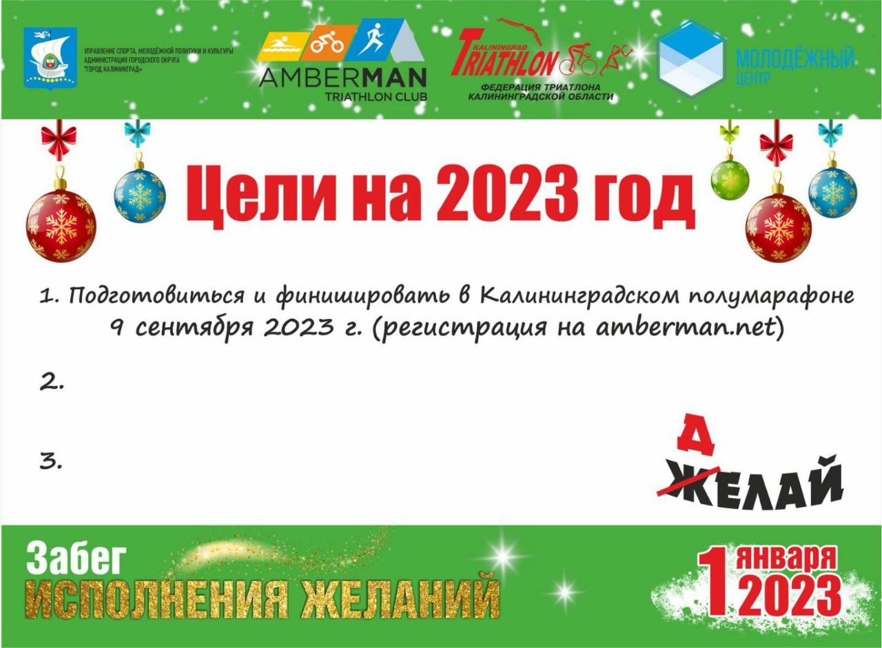 В этом году местом проведения забега станет Набережная озера «Верхнее» (ориентир – островок напротив городской стоматологической поликлиники). Для того, чтобы принять участие необходимо пройти бесплатную регистрацию на сайте amberman.net. В день мероприятия заранее подойти к месту сбора, получить номер и записать на нём свои желания. Ровно в 12:00 все участники стартуют и пробегают 2023 м, тем самым символично обозначая первые шаги к исполнению желаний. А для более подготовленных будет организован забег на 23 км. Также в забеге можно поучаствовать в режиме ONLINE. Для этого необходимо пройти регистрацию на сайте, получить на почту файл с номером, распечатать его, записать на нём цели на 2023 год и в любом удобном месте совершить забег.