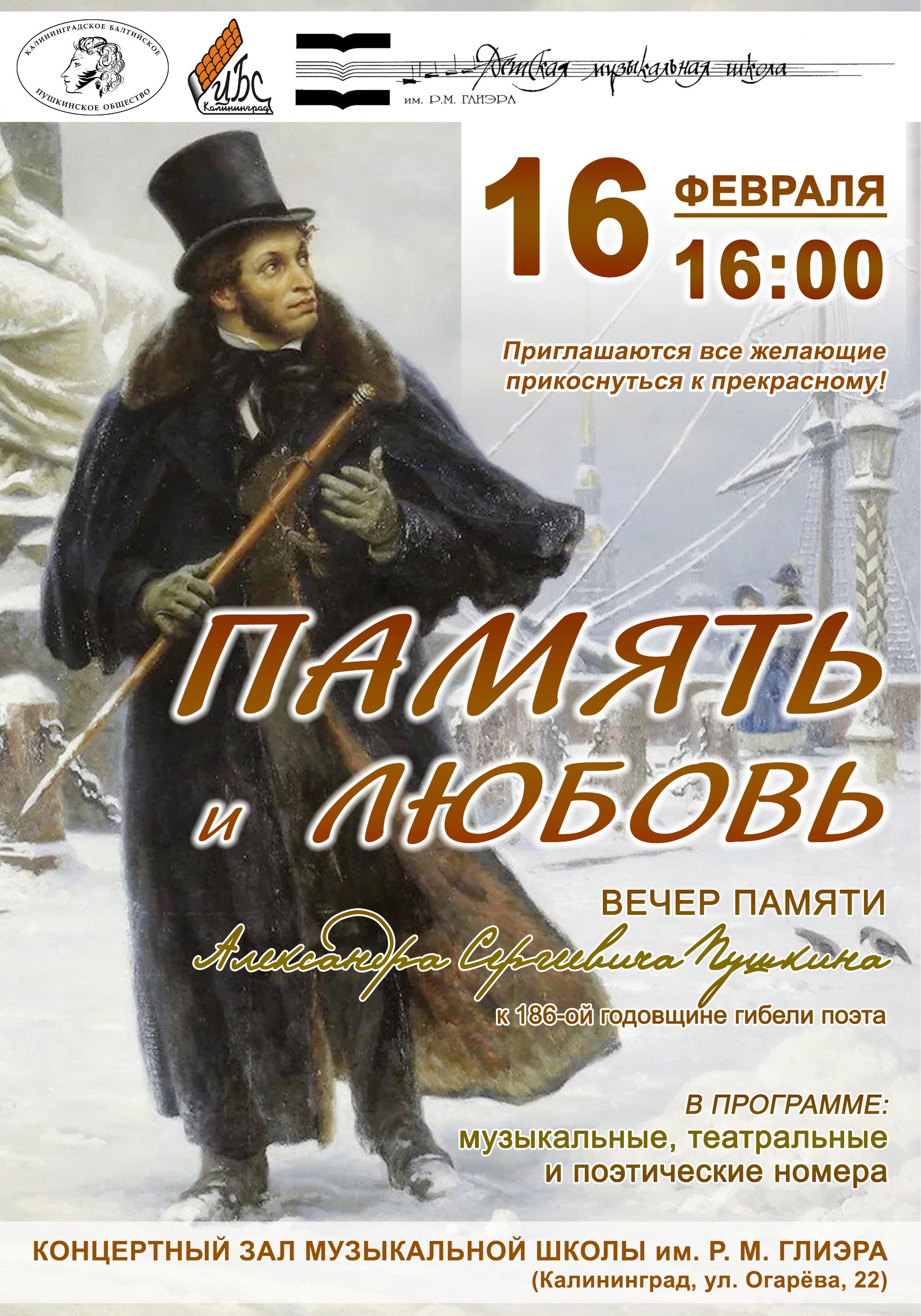 16 февраля в 16.00 в Детской музыкальной школе имени Р.М. Глиэра пройдёт памятный вечер, посвящённый А.С. Пушкину «Память и любовь», к 186-й годовщине гибели поэта.