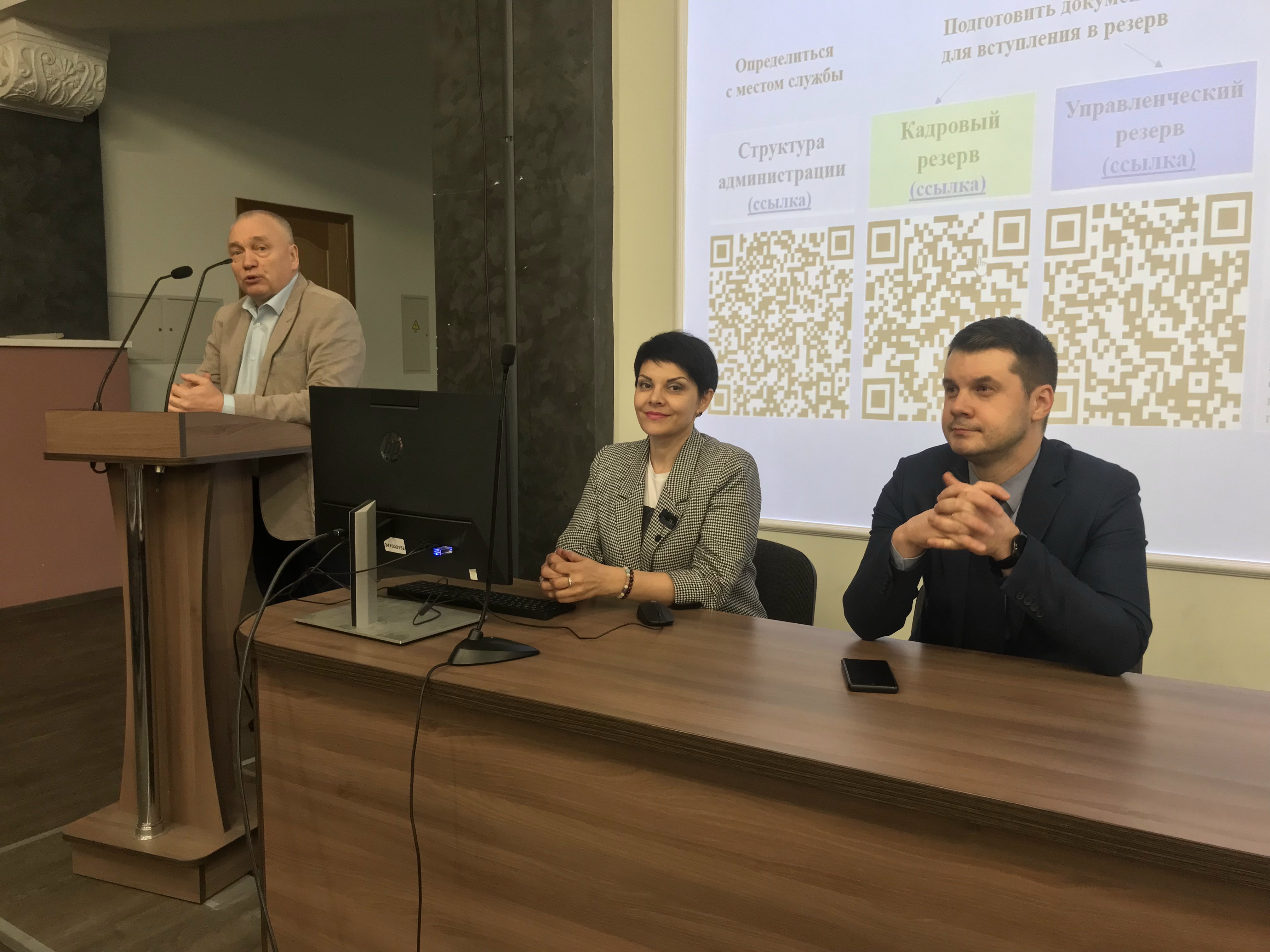 Первый заместитель главы администрации – управляющий делами Алексей Асмыкович рассказал о структуре администрации, какие вопросы местного значения решают и контролируют городские власти, кто такой муниципальный служащий, какие есть критерии и ограничения для кандидатов, как попасть в кадровый резерв для последующего трудоустройства.