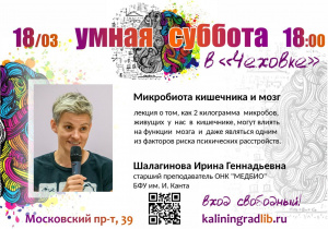 Ирина Геннадьевна расскажет, о многих интересных научных фактах, например, как микробы, живущие в кишечнике, могут влиять на функции мозга и даже являться одним из факторов риска психических расстройств (например, депрессии).
