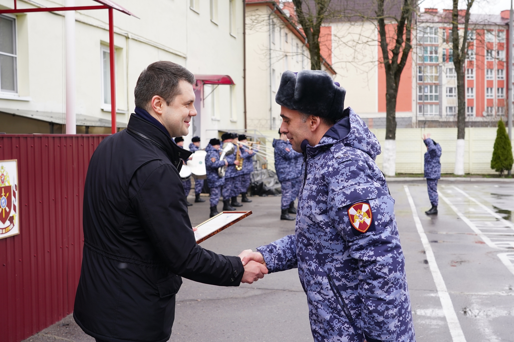 За заслуги в осуществлении мер по обеспечению законности и правопорядка и в честь профессионального праздника Алексей Асмыкович вручил почетную грамоту и благодарственные письма отличившимся сотрудникам Росгвардии.