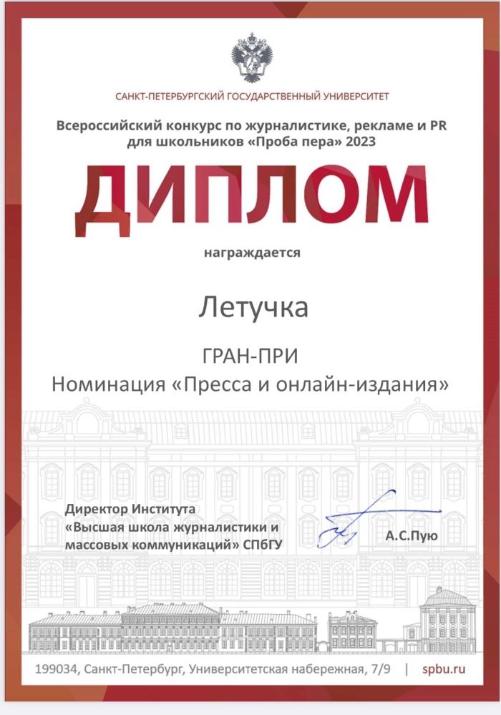 27 марта 2023 года подведены итоги финала Всероссийского конкурса по журналистике и медиакоммуникациям «Проба пера», который ежегодно проводит Высшая школа журналистики Санкт-Петербургского Государственного университета.